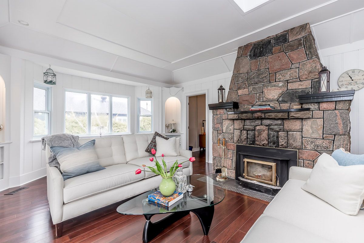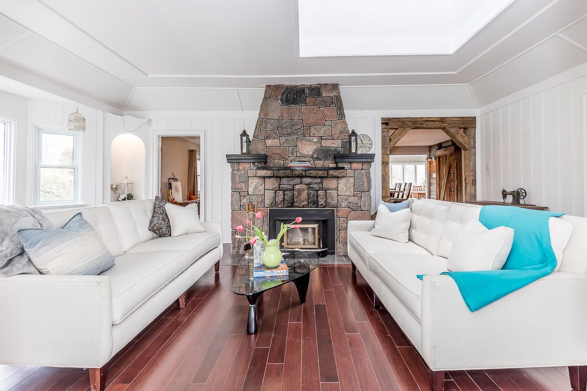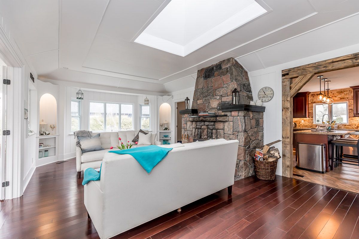 Hardwood Floor Stone Fireplace Skylight