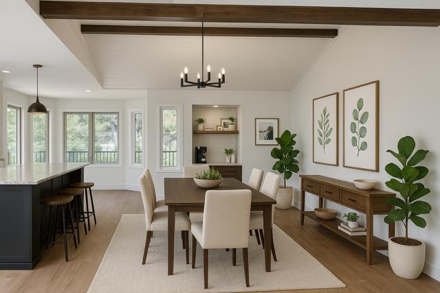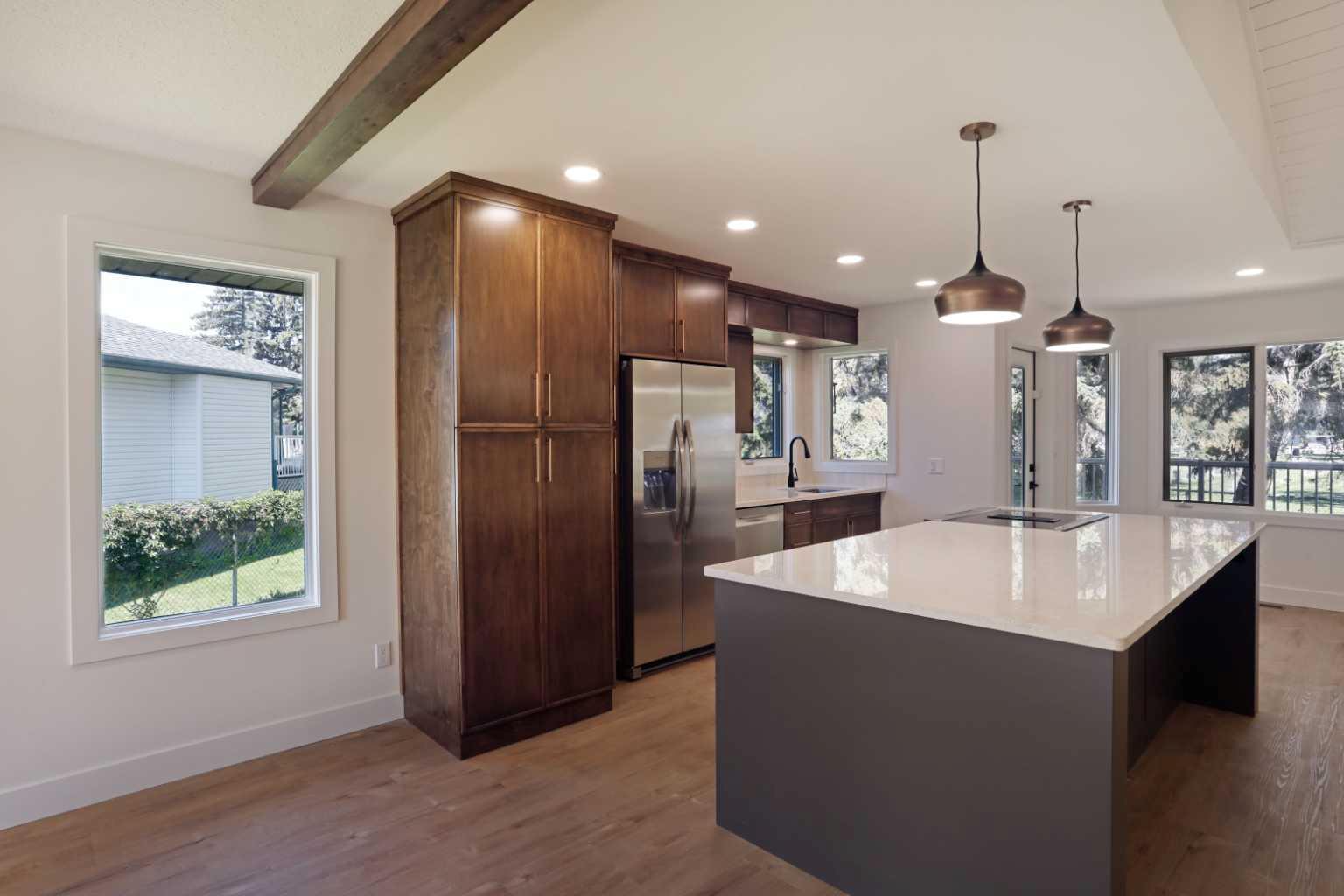 From the moment you step inside, you'll appreciate the bright, open main floor, featuring fresh paint, new flooring, updated lighting, and a welcoming atmosphere. The stunning, newly renovated kitchen serves as the heart of the home, showcasing custom-built maple cabinets, a large island with an eat-up bar, and stylish finishes. The open-concept design seamlessly flows into the sun-filled living room and spacious dining area, making entertaining and family gatherings effortless. This area provides ample space for a large dining room table and boasts wood-beamed vaulted ceilings along with a gorgeous coffee bar.