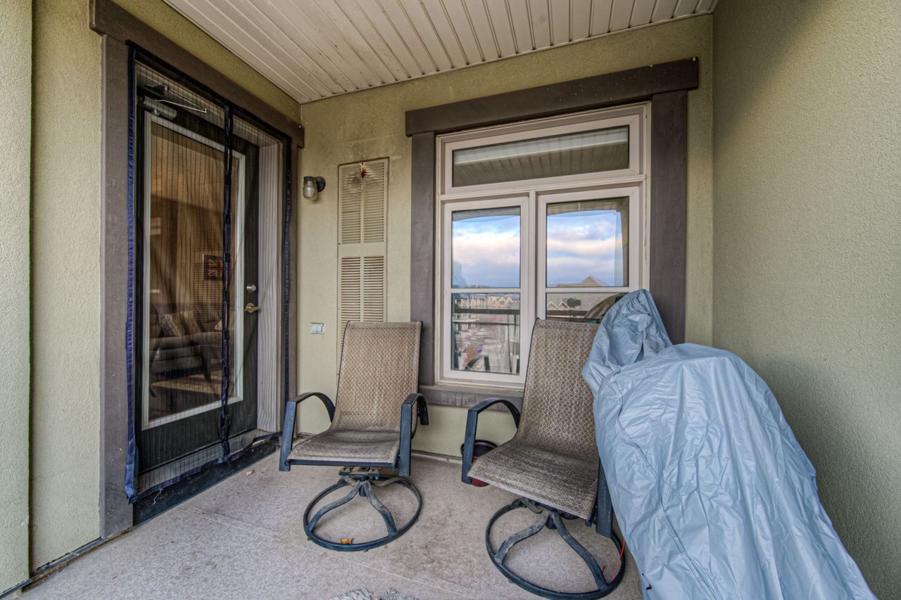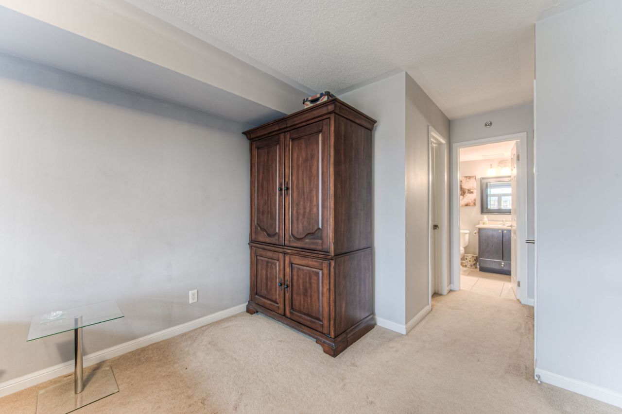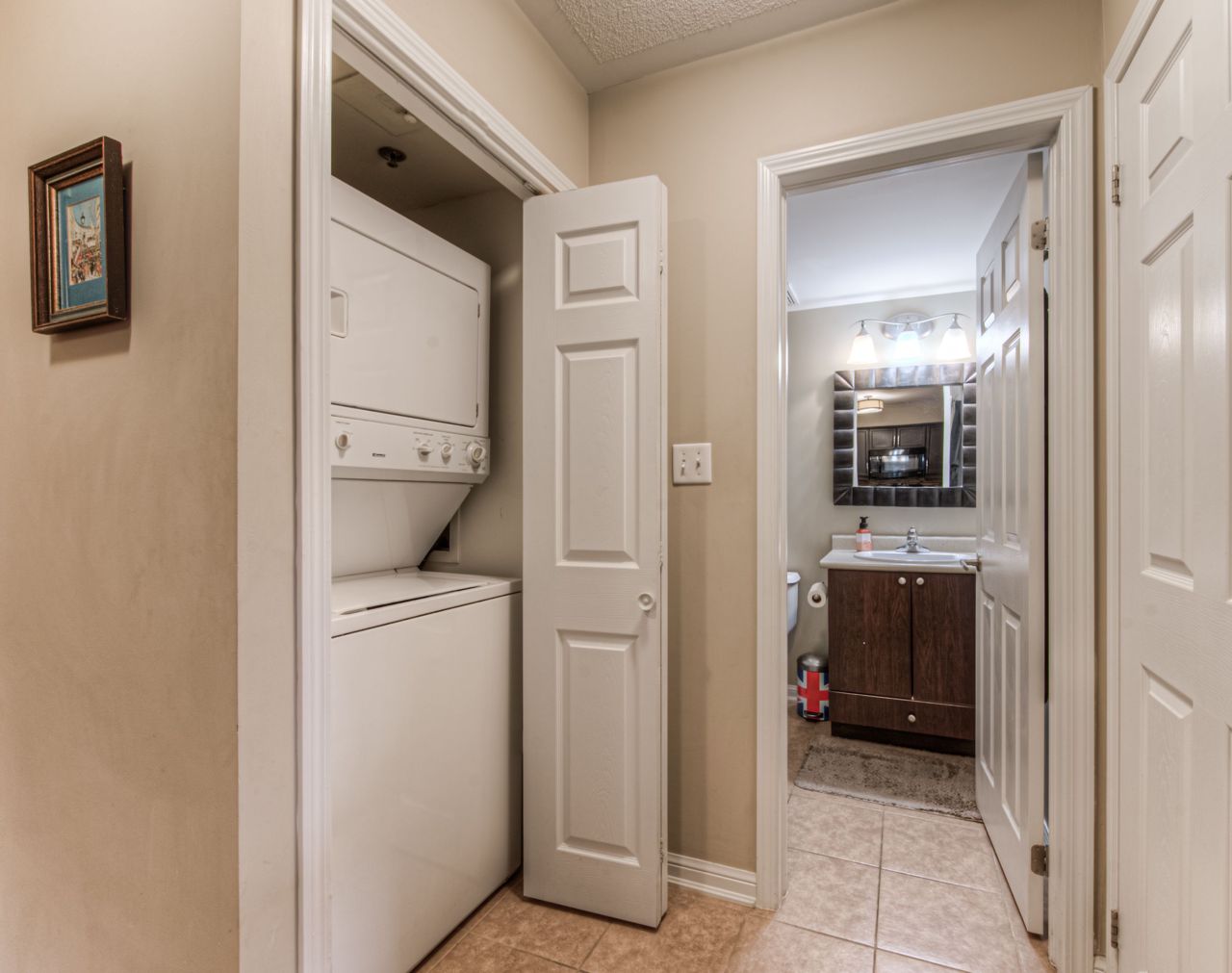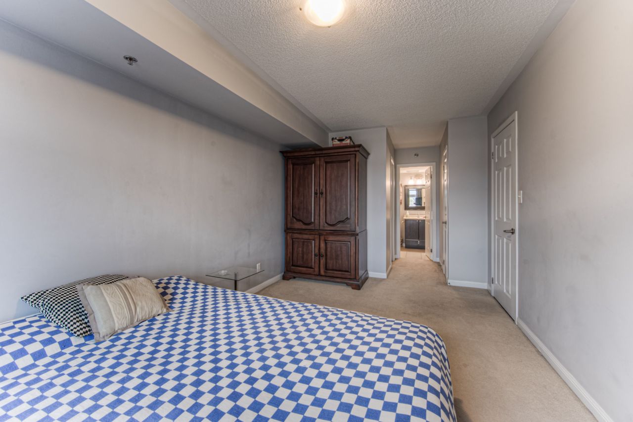Rare quiet top floor unit almost 900 sq ft. Fabulous 2 bedroom with 2 full baths. Ceramic floors and dark hardwoods. Oversized kitchen with breakfast bar, granite counter tops, beautiful backsplash, upgraded cabinets. Master bedroom with both a walk-in closet & 4 Pc ensuite. The second bedroom offers versatility, perfect for guests, a home office, or a cozy retreat. New blinds throughout. Quiet top floor balcony to sit and relax on, 1 Parking space underground with 1 additional spot above ground. And a locker for additional storage.