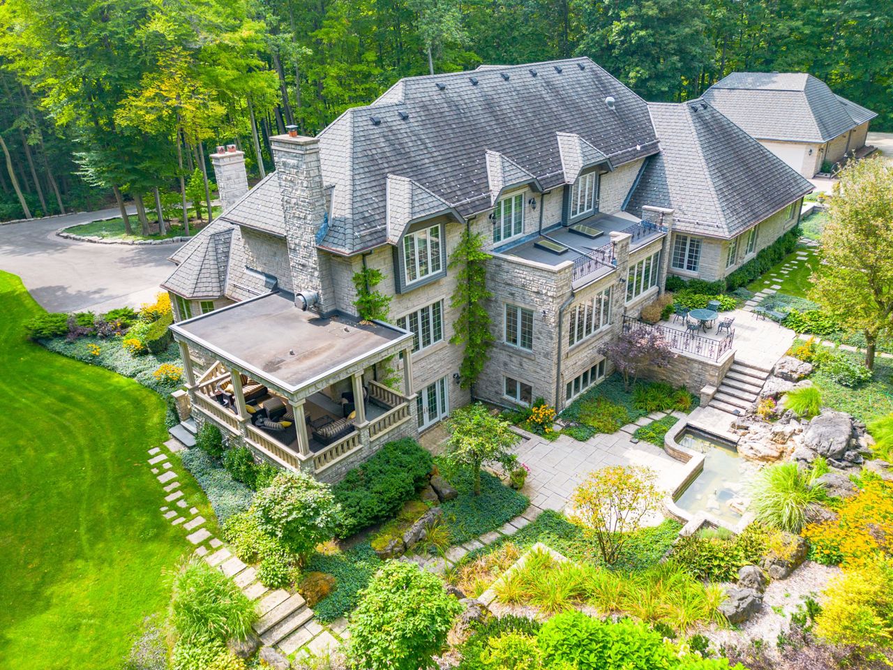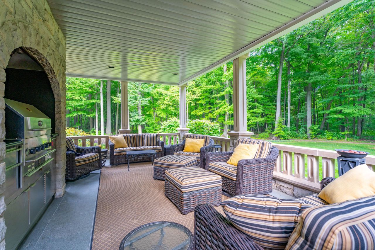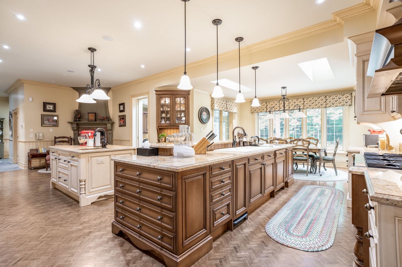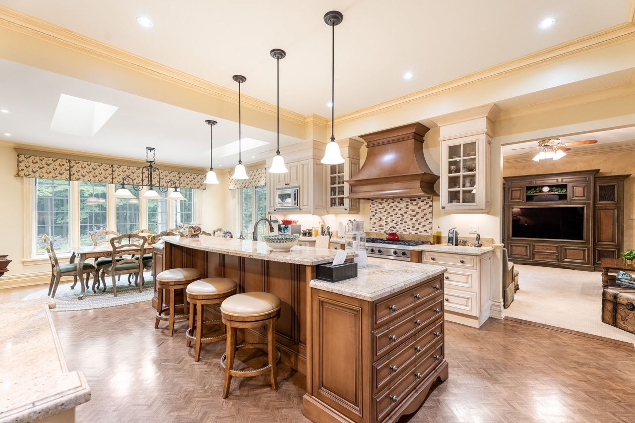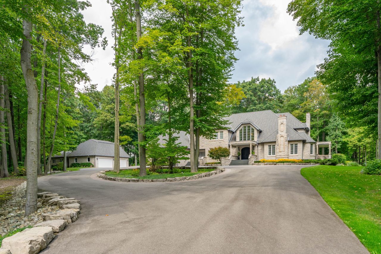 Welcome To This Remarkable English Country Estate Situated on 20 Acres of Well Manicured & Tranquil Grounds w/ Several Walking Trails & The Stream Passing Through The Rear of This Home. Past The Wrought Iron Gates & Up The Circular Driveway Lies A Breathtaking Residence W/ A Refined European Interior Offering Over 10,800 SF Total. The Front Foyer Welcomes You Into Soaring Ceiling Heights, Rich H/W Flrs & Prodigious Primary Rms Designed W/ Unrivalled Workmanship. The Lovely Dining Rm w/ Butlers Servery, Intricate Coffered Ceilings, B/I Speakers & Lg Pella Windows Provides Access To The Classic Kitchen W/ 2 Lg Islands, Granite Counters, B/I Dacor Appls & 2 Skylights. Flanking The Kitchen is A Lovely Seating Area w/ Gas F/P & An Office w/ B/i Desk That Opens Up To The Ultra Private & Tranquil Grounds. The Family Rm W/ Venetian Plastered Walls Forms The Perfect Gathering Space W/ Access To Your Covered Porch w/ Seating Area + B/I Bbq.The Owners Suite on The Main Lvl Fts His/Her W/I ClosetsA 5pc Ensuite w/ Heated Flrs & O/L's The Garden. 4 Lg Bdrms w/ Their Own Design Details Above + A Loft. This Home Also Fts: A Bsmt W/ 2nd Kitchen, A Guest Suite, Wet Bar, Wine Cellar, Great Rm, Gym, Workshop & Detached 8 Car Garage + More!
