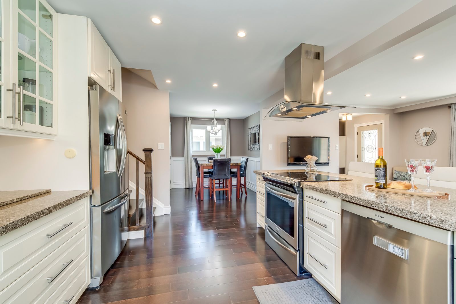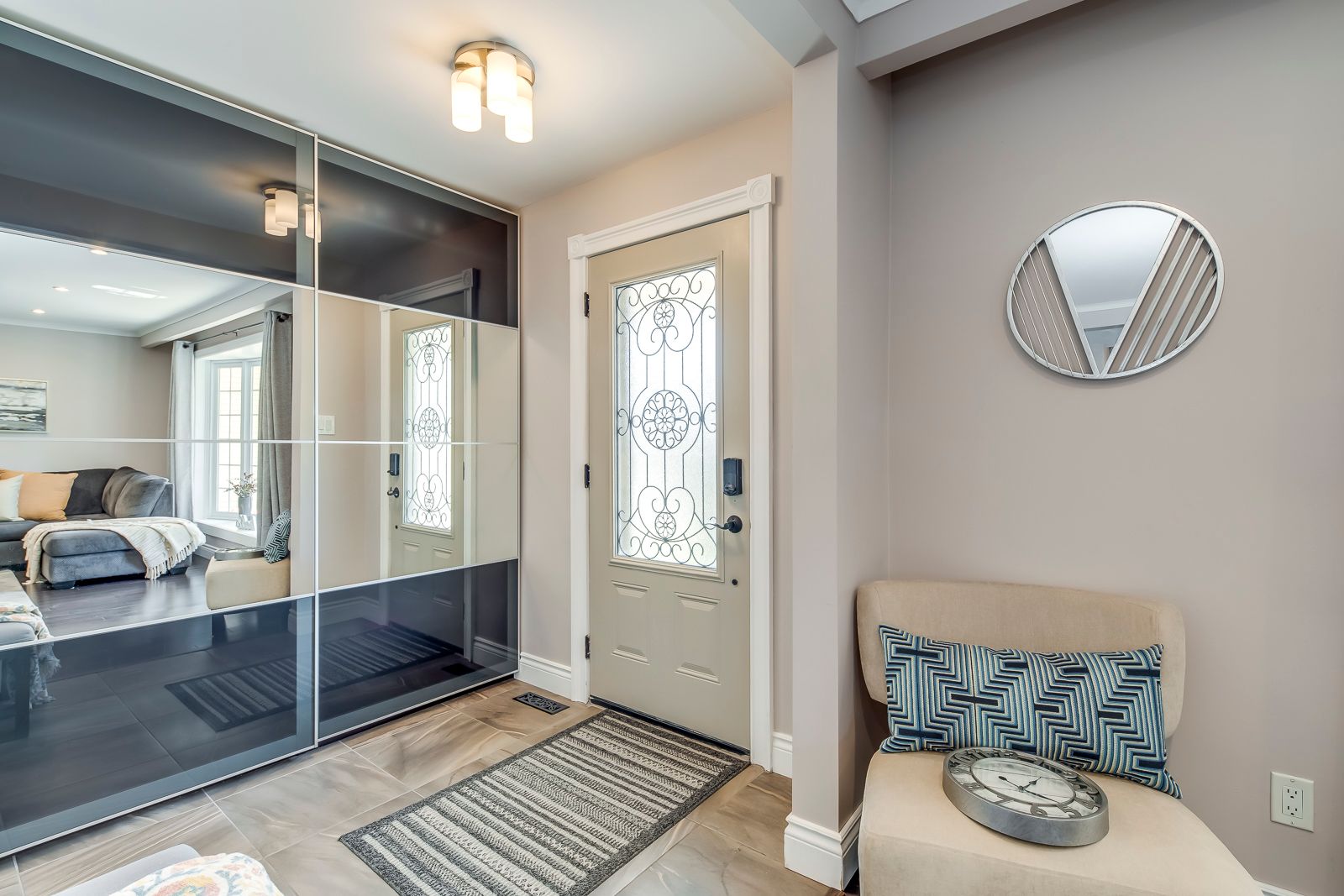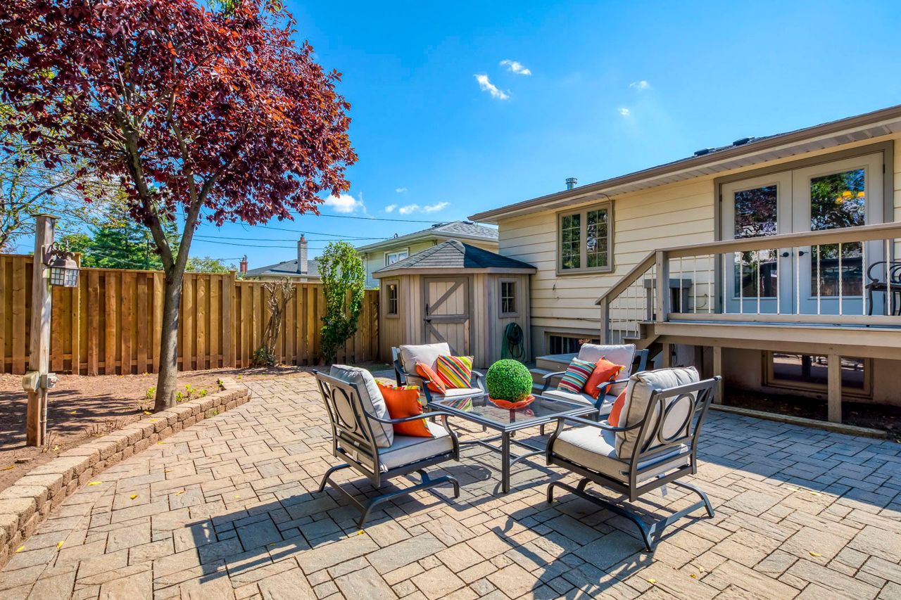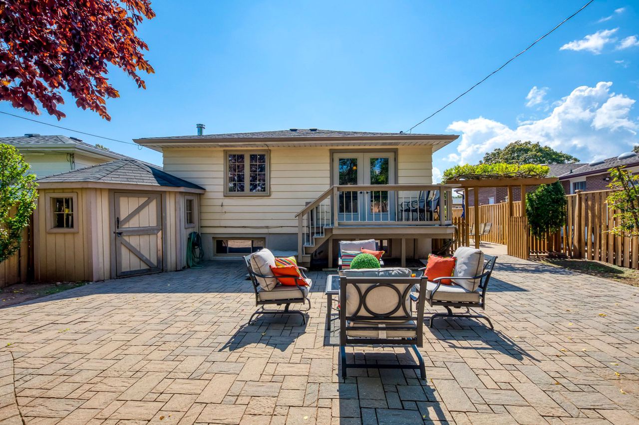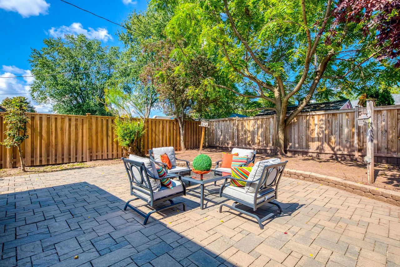 Modern renovated, spacious open concept 4 level backsplit in a young family friendly neighbourhood. 3+2 bdrms & 1+1 kitchens w/sep entrance to 2 bdrm extended family suite. Hardwood floors, modern trim, storage, 2 laundry units. Mature area of parks, shopping, schools, hwy & GO access & ample parking.Interlock brick surrounding bright private entertainers backyard & garden w/shed storage.
