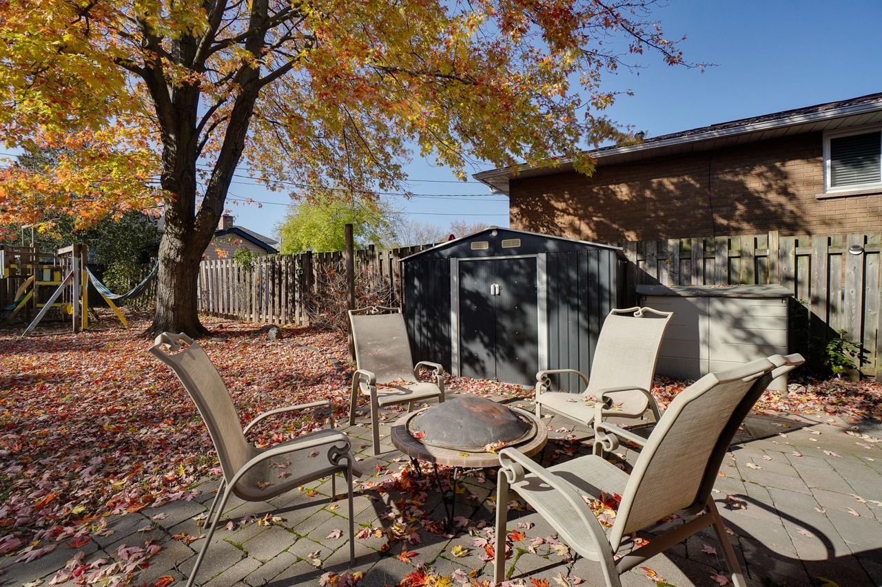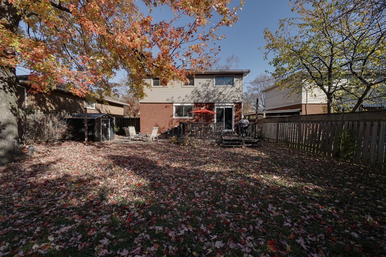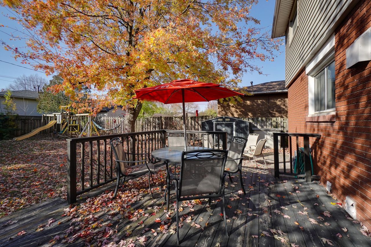The fully fenced backyard with deck and a patio area, mature trees and room to play. Ideal for kids, pets and entertaining.