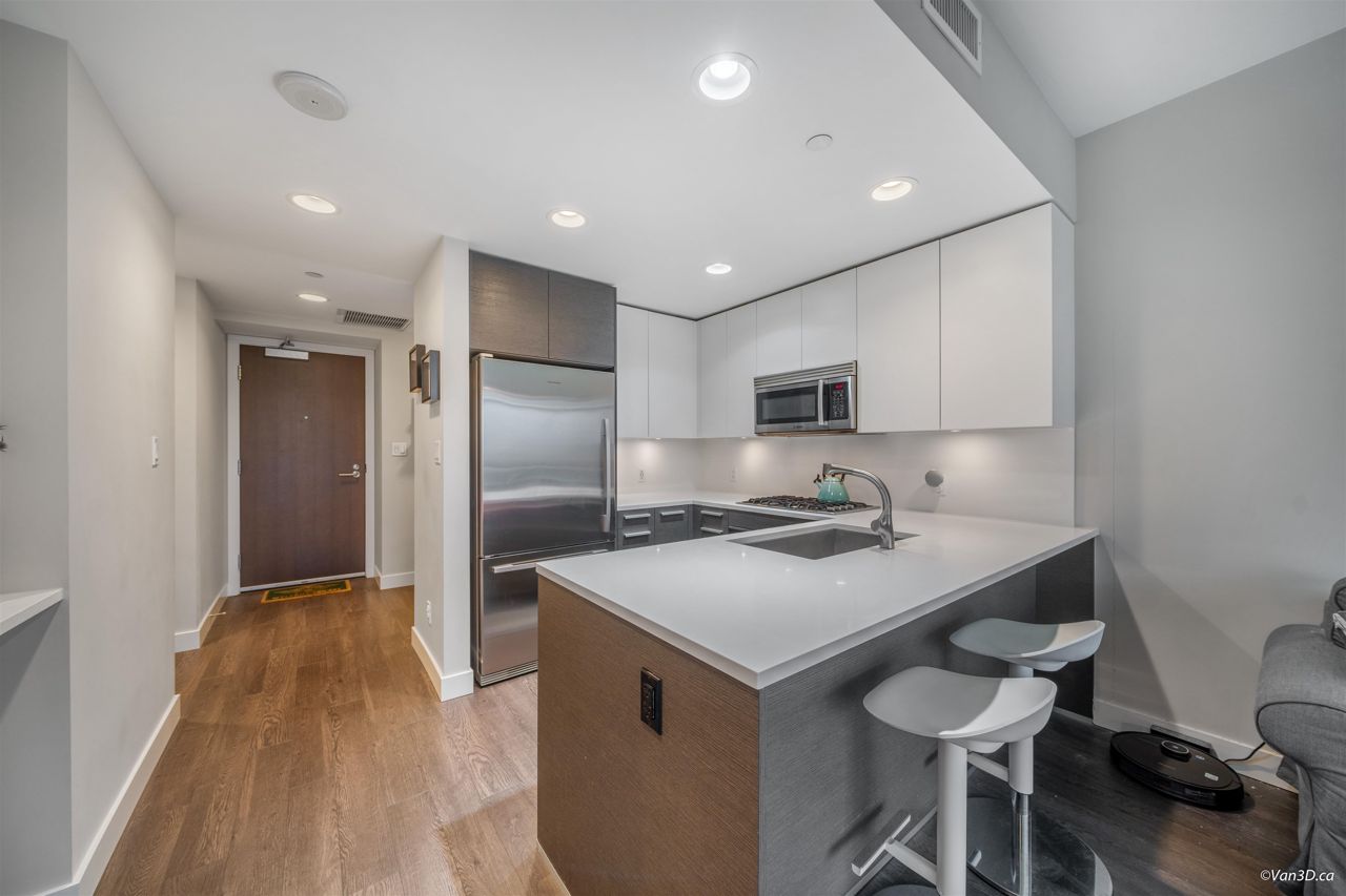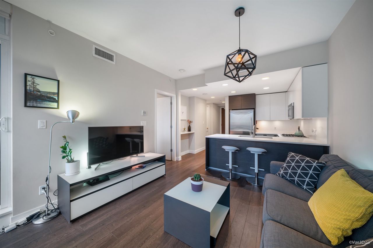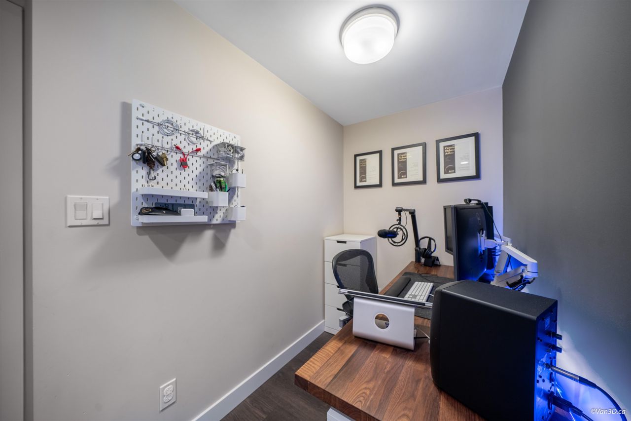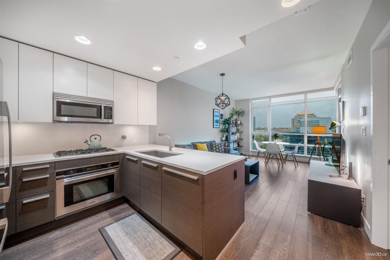 The unit is north-facing with 9 foot ceilings allowing for plenty of natural light throughout the day. Additionally, the 667 sq. ft. unit provides ample space, making it a comfortable one-bedroom unit. One of the highlights of this property is the den, which offers a great opportunity for multiple uses - office, closet, reading room. The bedroom has double closets. The kitchen features quartz counters with an eating counter that overlooks the dining/living room space. The building offers a range of great amenities, such as a fitness area with sauna/steam room, a large outdoor BBQ terrace area, a dog run area, a guest suite, and an amenity room. CONVENIENT LOCATION shopping and skytrain just steps away, easy access to everything you need. BONUS GEOTHERMAL HEAT AND A/C