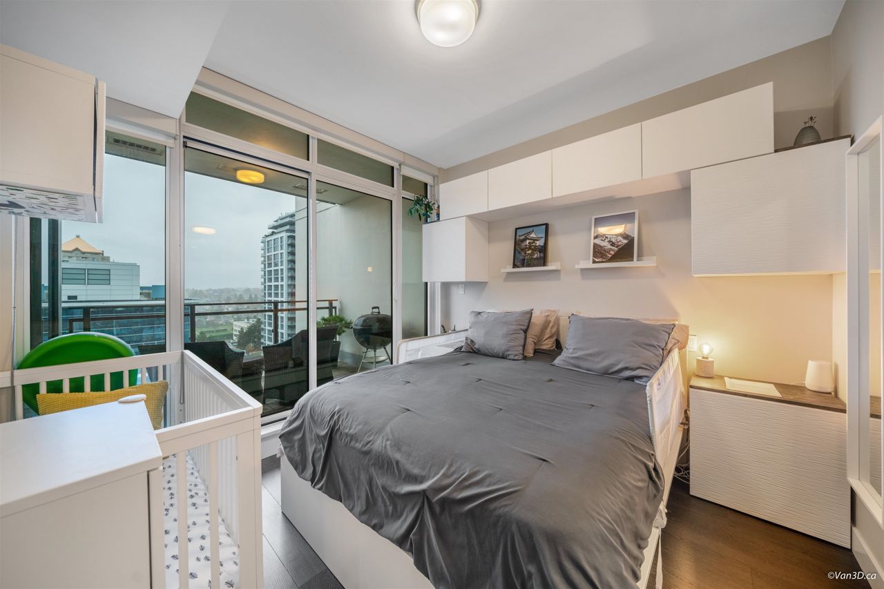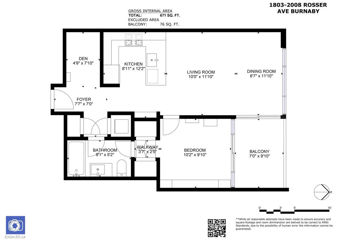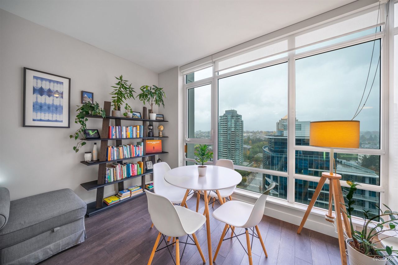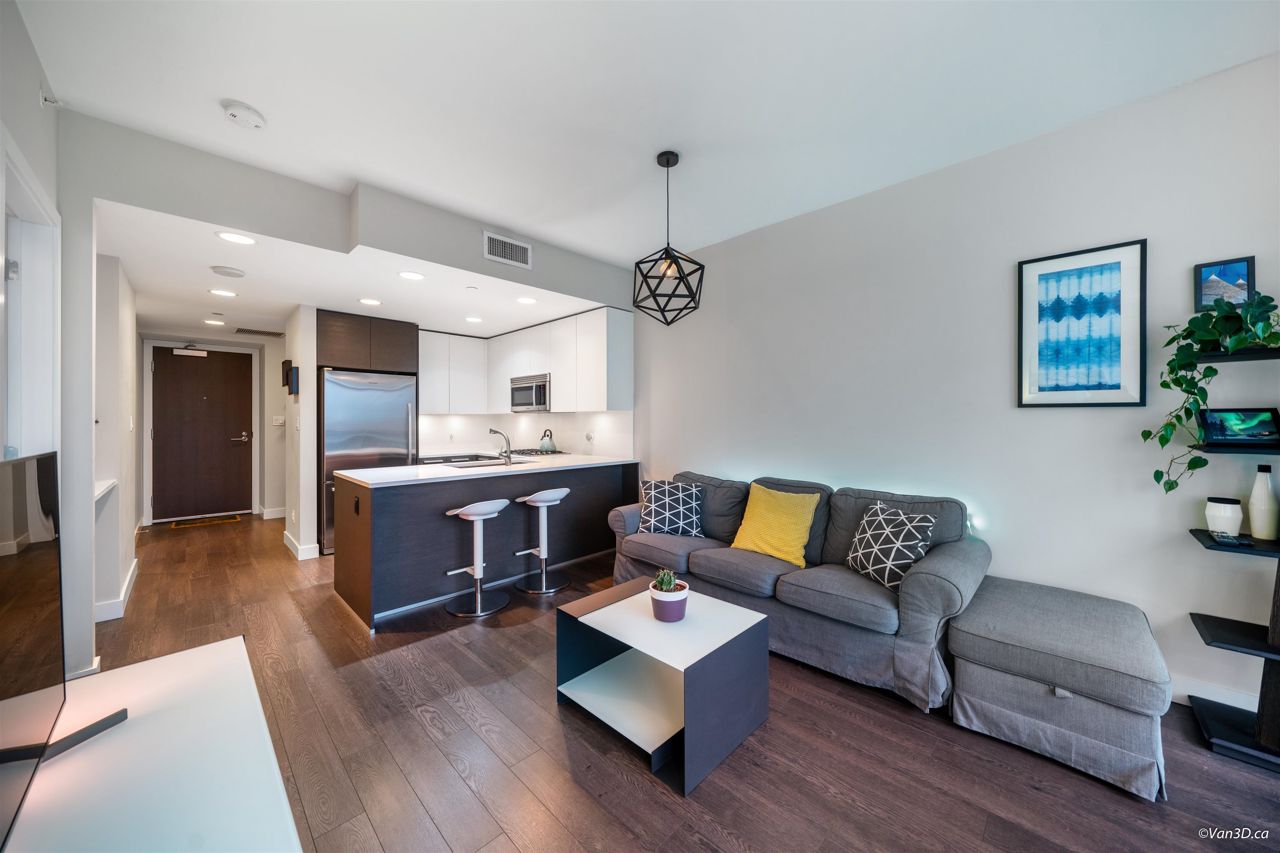 The unit is north-facing with 9 foot ceilings allowing for plenty of natural light throughout the day. Additionally, the 667 sq. ft. unit provides ample space, making it a comfortable one-bedroom unit. One of the highlights of this property is the den, which offers a great opportunity for multiple uses - office, closet, reading room. The bedroom has double closets. The kitchen features quartz counters with an eating counter that overlooks the dining/living room space. The building offers a range of great amenities, such as a fitness area with sauna/steam room, a large outdoor BBQ terrace area, a dog run area, a guest suite, and an amenity room. CONVENIENT LOCATION shopping and skytrain just steps away, easy access to everything you need. BONUS GEOTHERMAL HEAT AND A/C