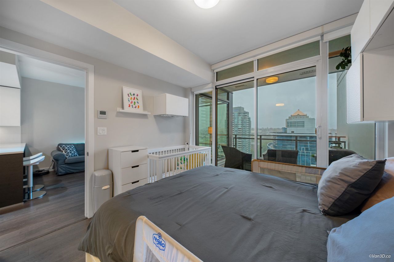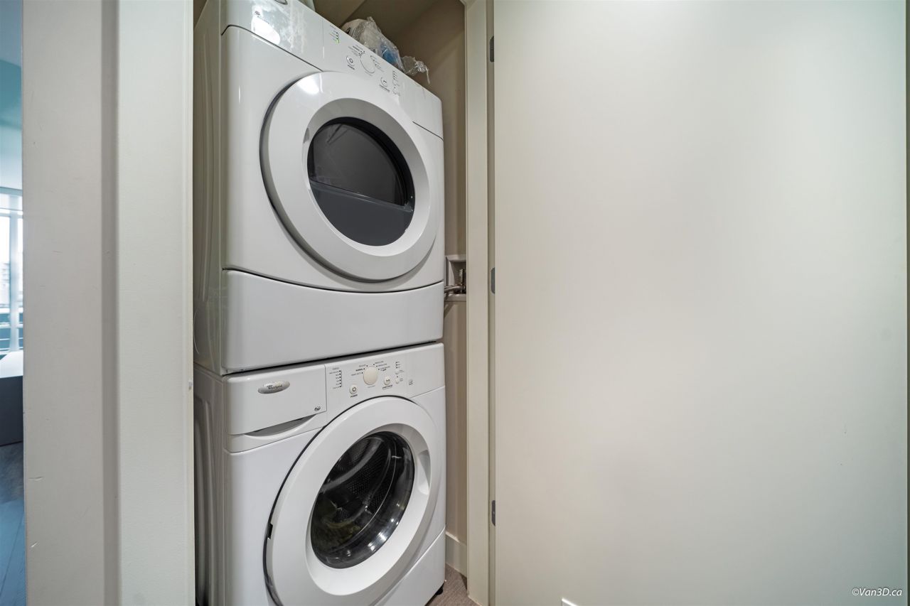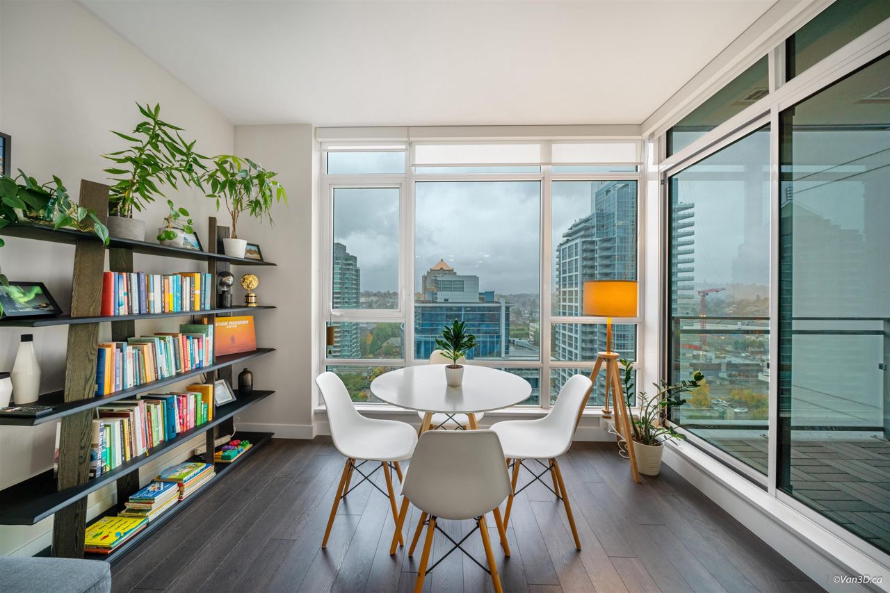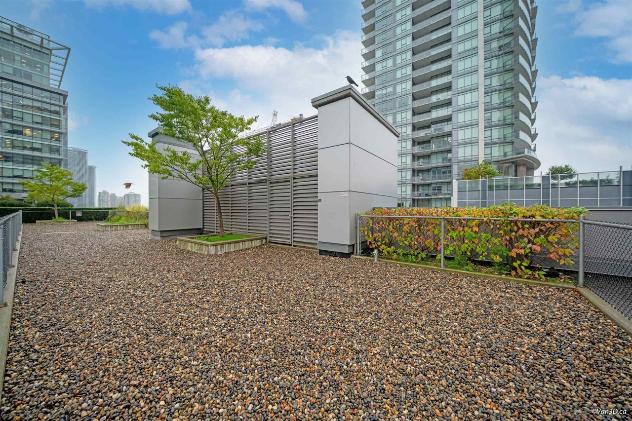 The unit is north-facing with 9 foot ceilings allowing for plenty of natural light throughout the day. Additionally, the 667 sq. ft. unit provides ample space, making it a comfortable one-bedroom unit. One of the highlights of this property is the den, which offers a great opportunity for multiple uses - office, closet, reading room. The bedroom has double closets. The kitchen features quartz counters with an eating counter that overlooks the dining/living room space. The building offers a range of great amenities, such as a fitness area with sauna/steam room, a large outdoor BBQ terrace area, a dog run area, a guest suite, and an amenity room. CONVENIENT LOCATION shopping and skytrain just steps away, easy access to everything you need. BONUS GEOTHERMAL HEAT AND A/C