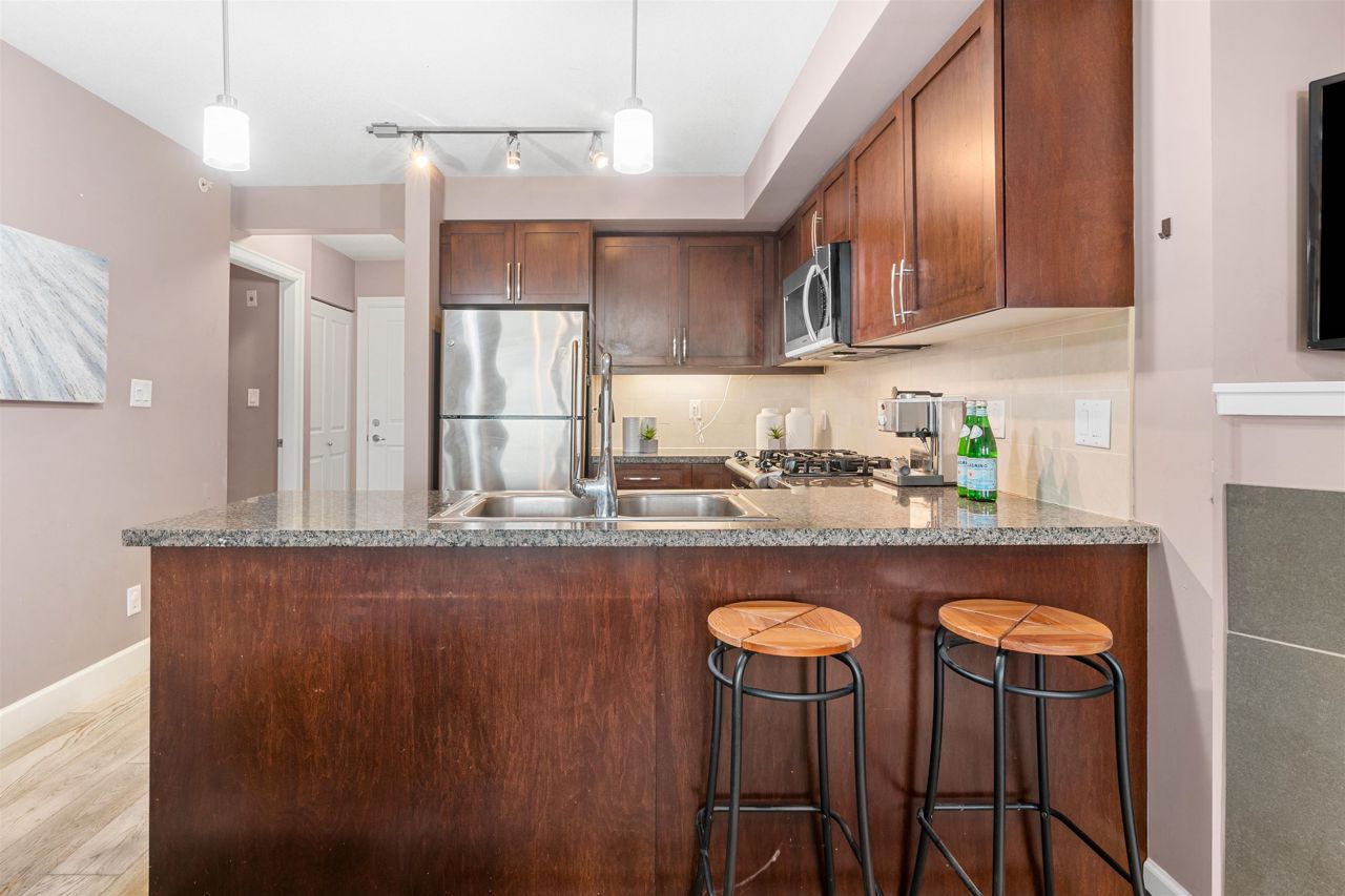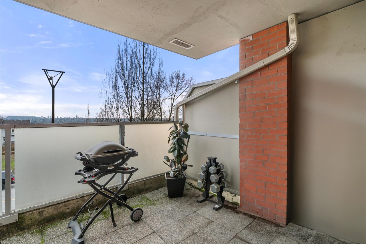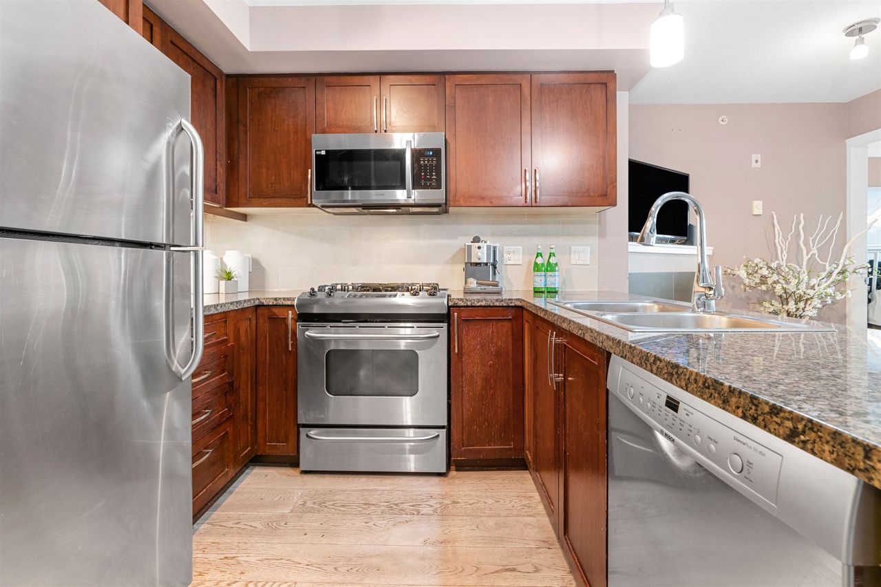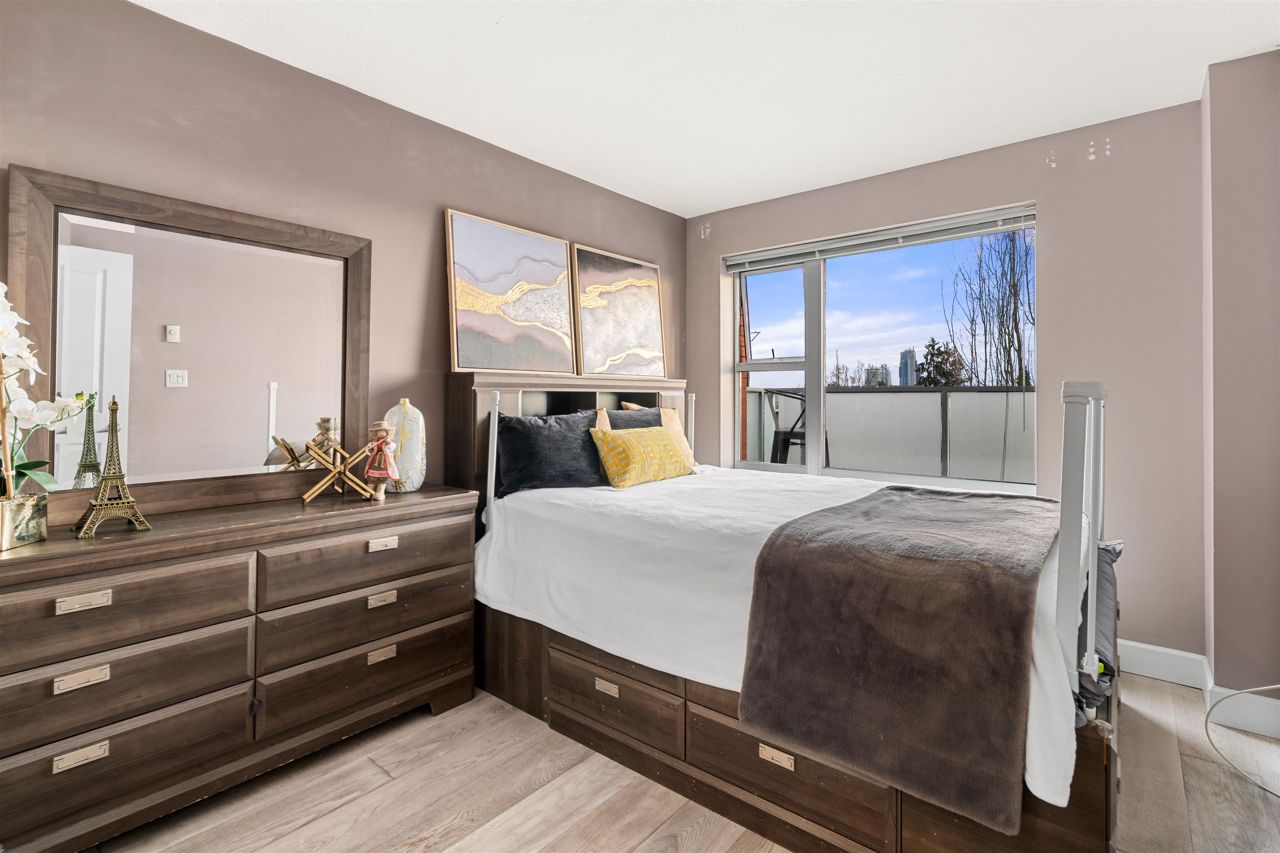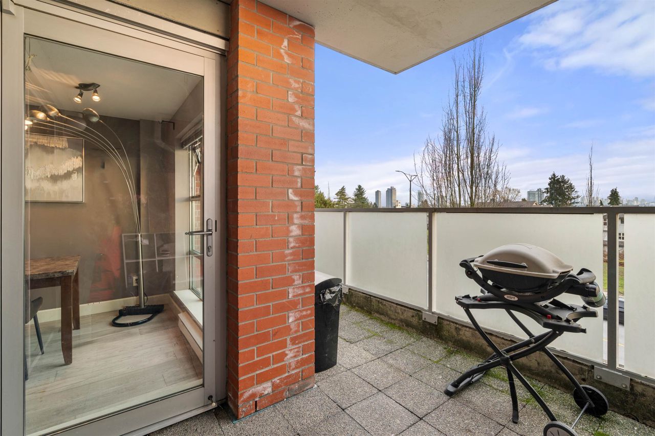 Location, location! Corner unit, 2 bed/2 full baths & den in the highly sought out CONCRETE BOUTIQUE MIDRISE-Mondeo! This SPACIOUS corner suite boasts a ton of natural light & very functional layout. The home features rich wood cabinetry, engineered hardwood floors, granite countertops, gas stove range & a LARGE KITCHEN w/plenty of cupboard space. Enjoy morning coffees or evening BBQ on the 95 sq ft patio deck. Convenient central location, close to Brentwood & Metrotown Mall, 15 mins to Downtown, walking distance to local restaurants, delis, cafes, parks & transit. 1 parking & 1 storage locker included. MUST SEE VIRTUAL TOUR!