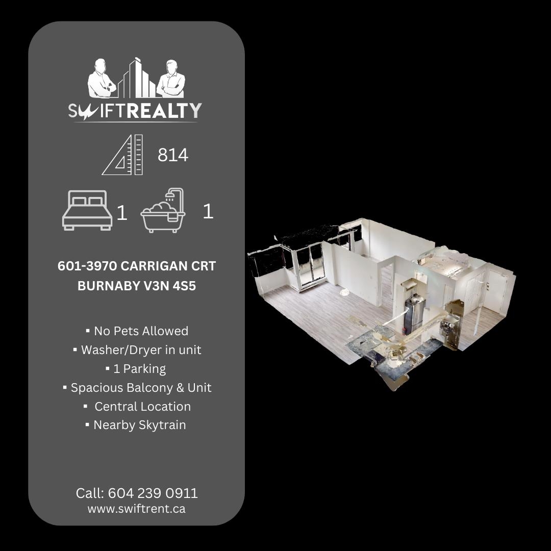 Welcome to The Harrington! Modern living meets convenience! This captivating 1 Bed 1 Bath unit boasts over 814 square feet of generous living space, featuring a spacious kitchen, a private balcony, and an open layout that invites comfort and style. Enjoy the added convenience of an in-unit washer/dryer and included parking LOCATION: Perfectly situated just steps from the Lougheed Town Centre, with easy access to the Millennium and Expo Line stations, you'll find that every essential is within walking distance. Your ideal urban lifestyle starts here! For more details or to schedule a viewing, contact our property manager, Jaeden Hildebrand, at 778-837-5240.
