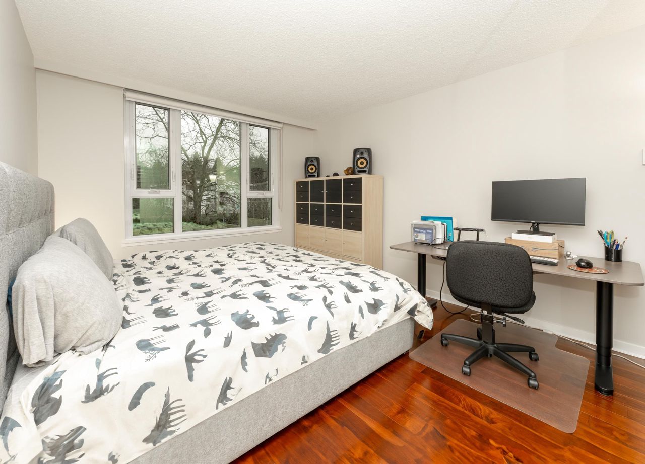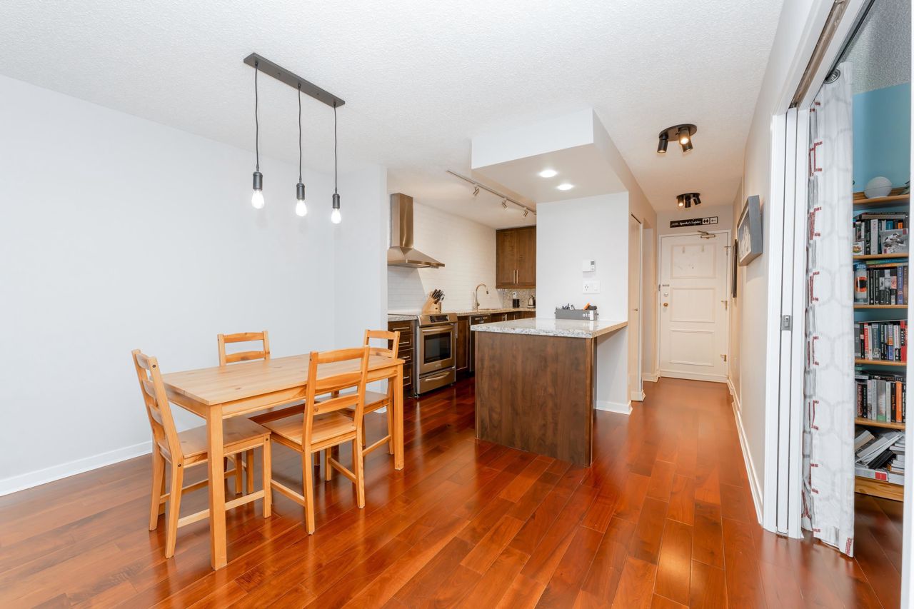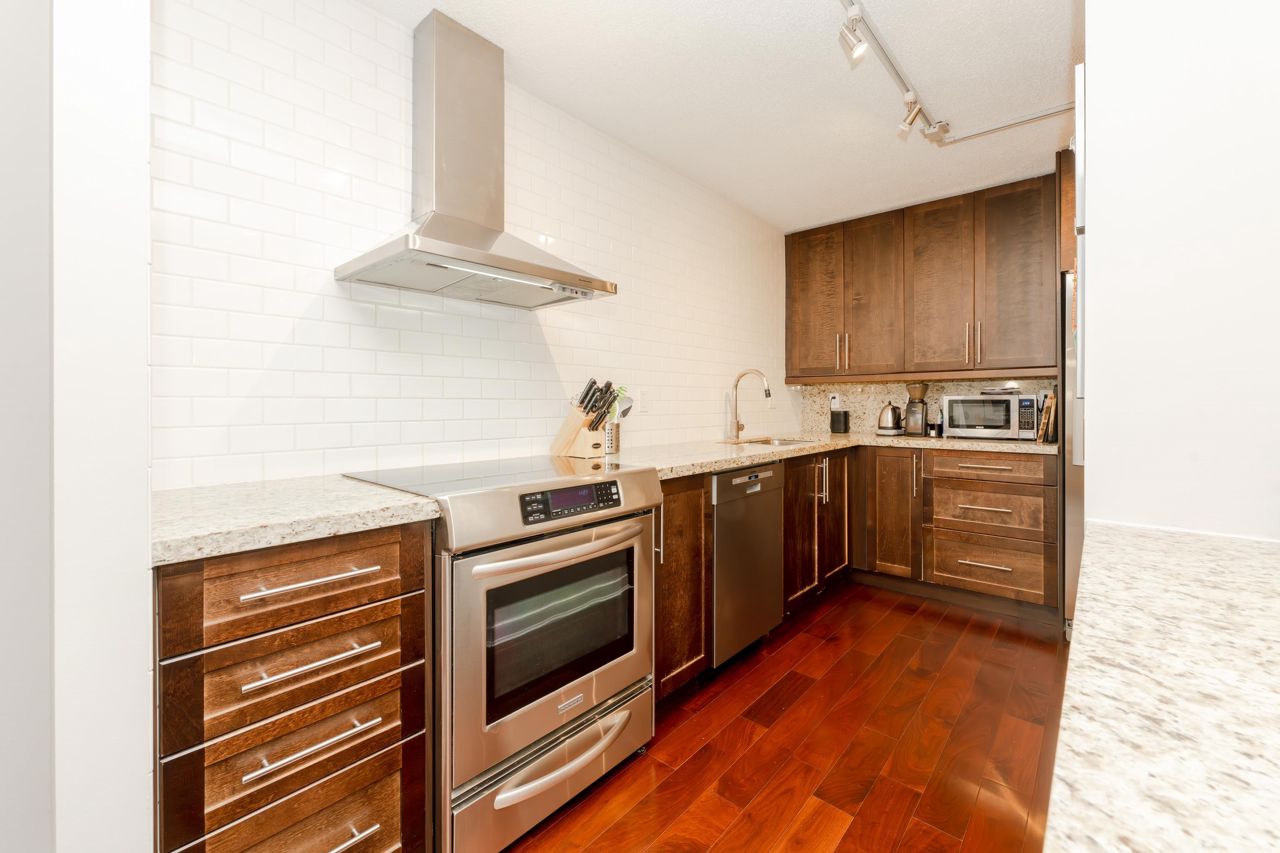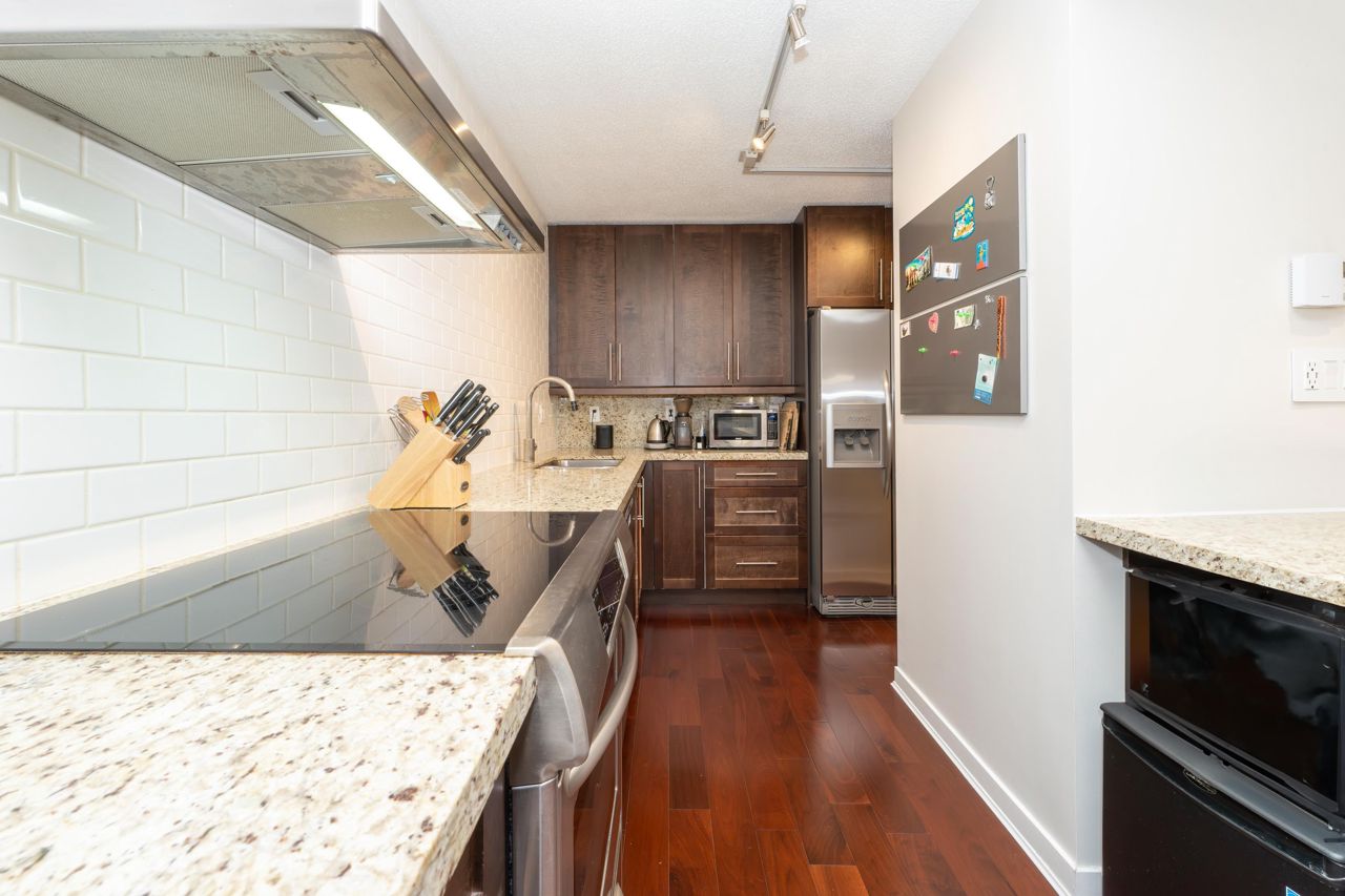 This move-in ready 2-bedroom, 2-bathroom corner unit is freshly painted and thoughtfully updated for modern living. Featuring engineered walnut floors, a gourmet kitchen with granite countertops, and stainless steel appliances, the open layout offers both style and comfort. The building features extensive upgrades, including a new envelope, windows, and sliding doors (2019), repiping (2011), updated elevators (2014), and more. Amenities include an indoor pool, exercise center, and in-suite laundry. Includes 1 parking stall and 1 storage locker.