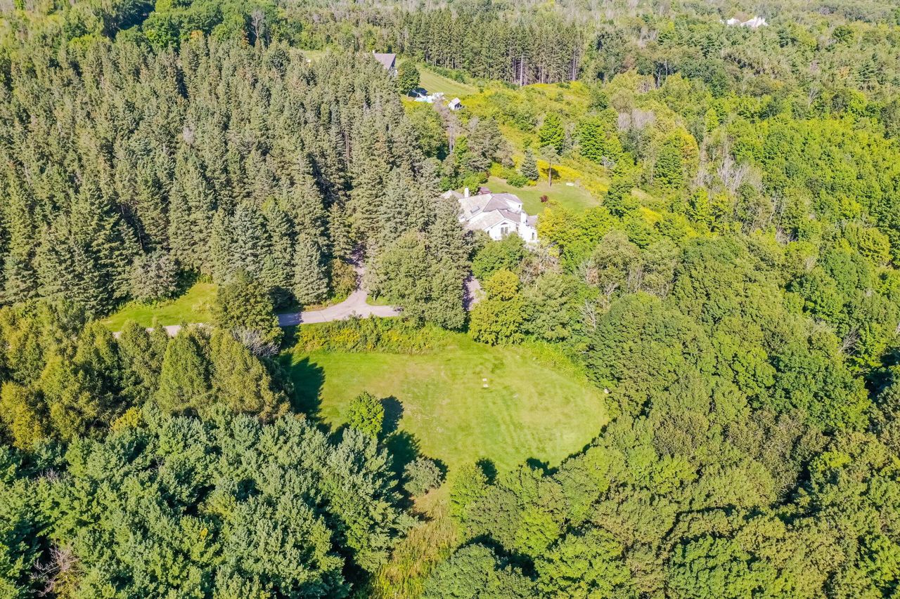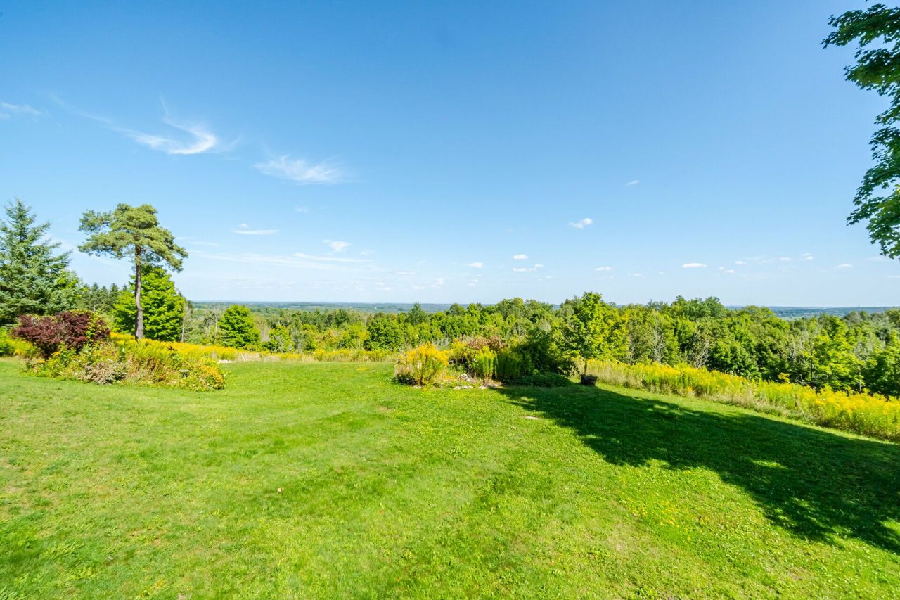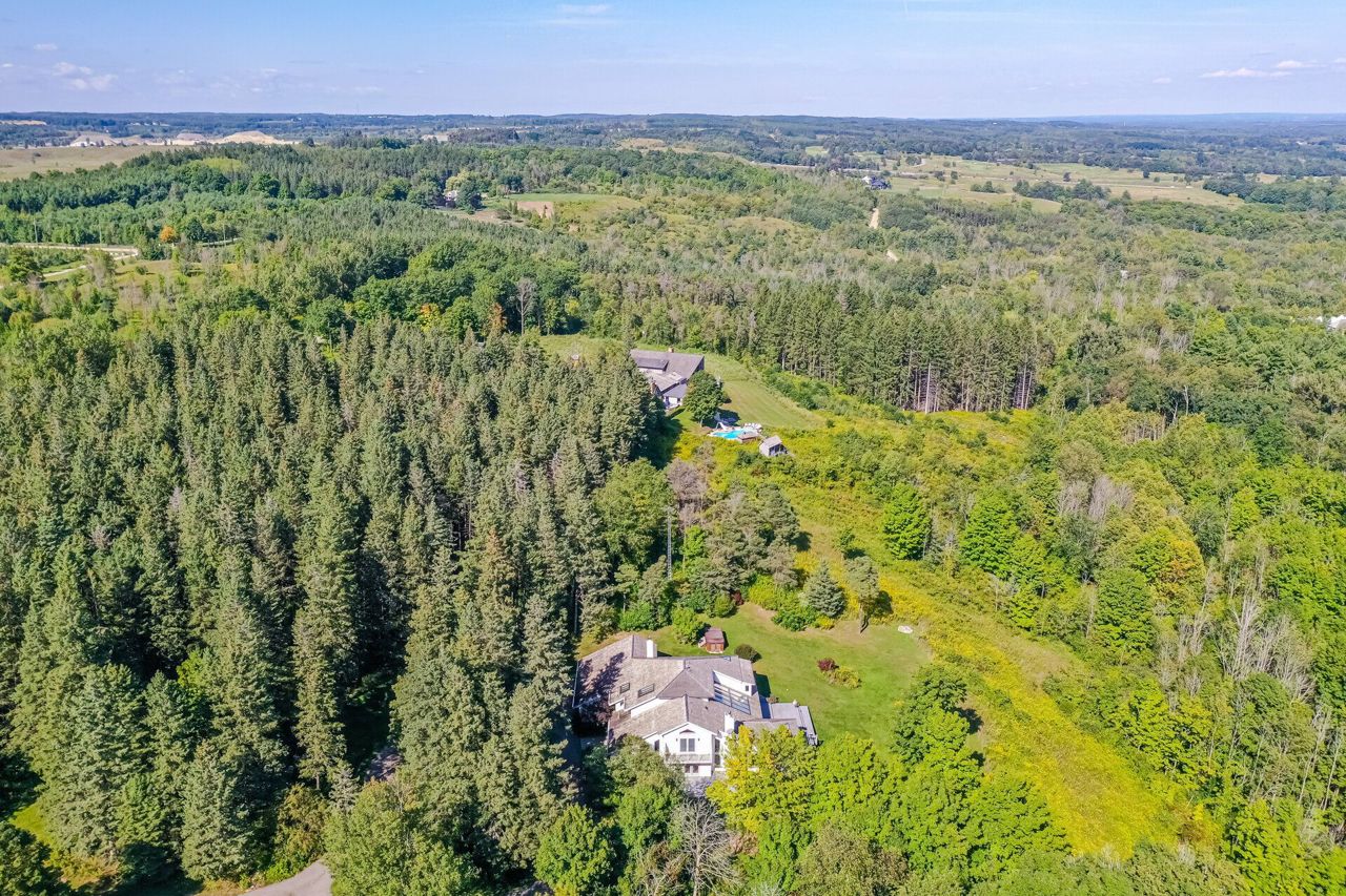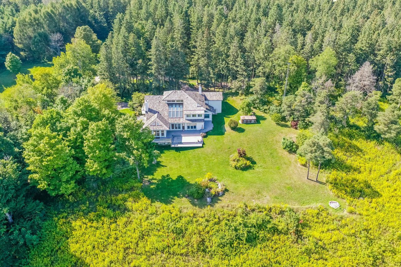 Set on 14.9 Acres on a private co-op road minute from the devil pulpit golf course. Spectacular eye-catching 360 degrees views. Enjoy the spectacular views of the Toronto skyline at the rear of the property from the wrap around deck or the spacious hot tub which is an entertainers dream in this private setting. As you enter the property thru stone pillar gates the circular driveway leads to this custom-built award-winning home with a open concept unique design that features: 3 car garage, Cedar shingles, Charming hardwood floors, Bright and spacious rooms with large windows & high ceilings, skylights and pot lights, offering amazing views throughout,4 bedrooms, sunroom, grand room, multiple walkouts Main floor prime bedroom with spiral staircase leading to upper floor private sitting room, upper level rec room/library,Finished Basement features Sauna, Shower, entertainment room, den, Large exercise room with custom fireplace, wine cellar. New well pump, new heat pumps, Kinetico water filtration system, 400amp service. Home is in need of repairs and TLC.