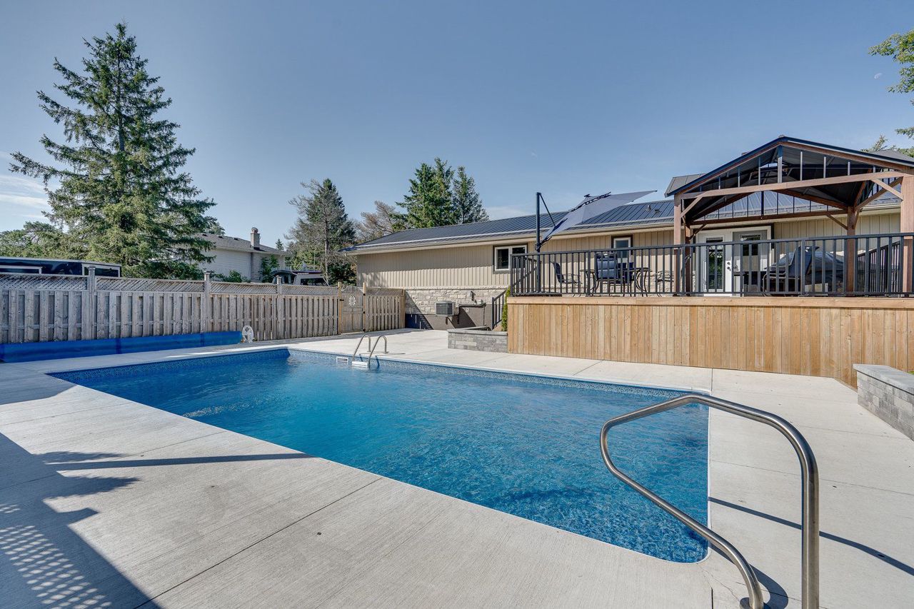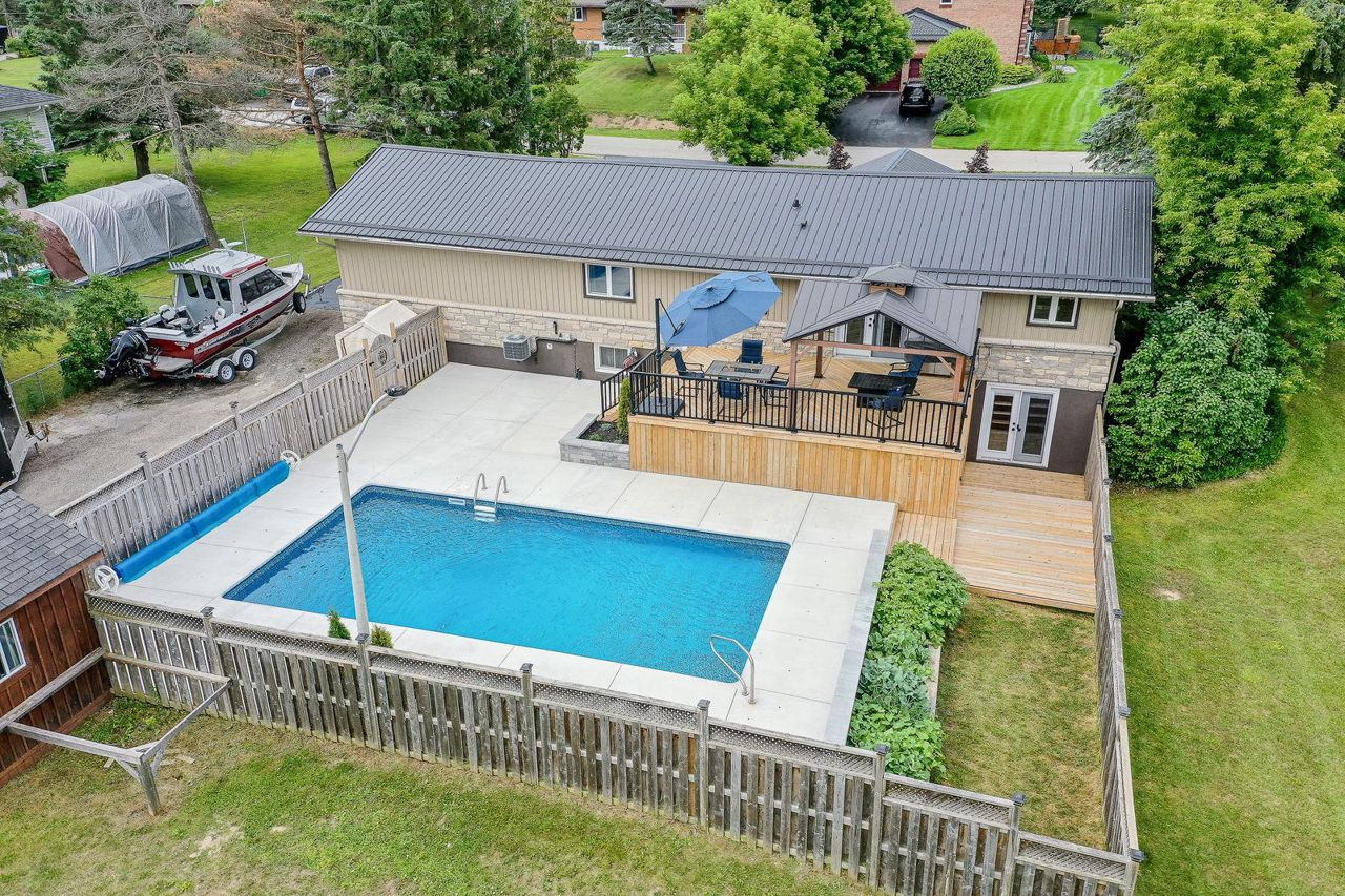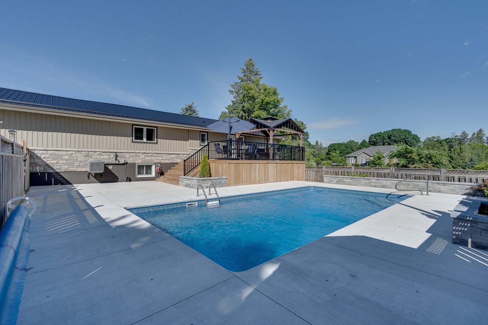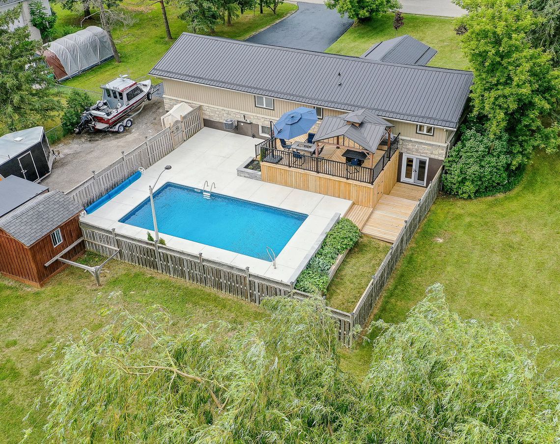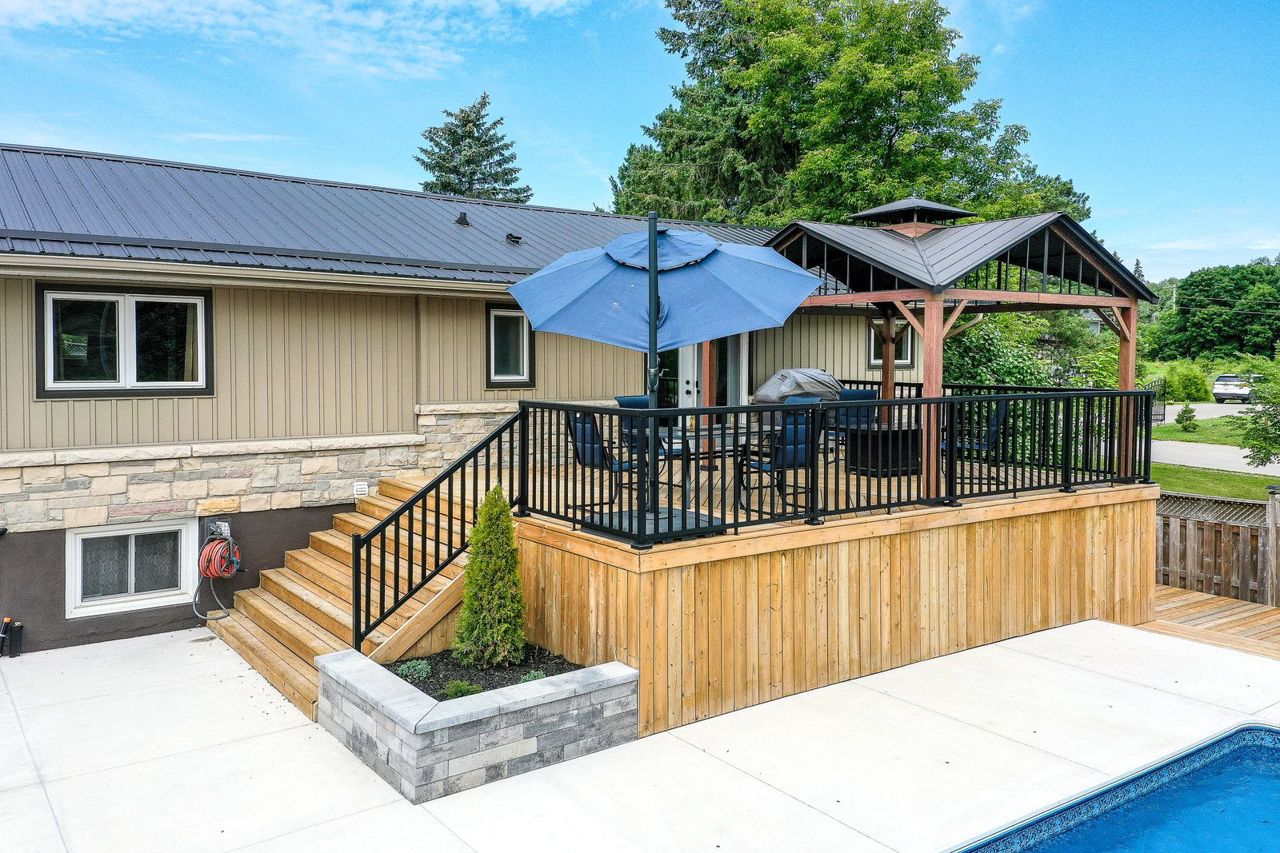 If you are looking for a home that combines the charm of country living with the convenience of in town amenities, look no further than this raised bungalow on a double lot which is 135 x 244 feet with natural gas & municipal water. This property features a large driveway that can accommodate a boat, RV, car trailer or just plenty of parking for the family. The inground pool with cement surround and updated deck with gazebo overlooking the pool are just fabulous for both relaxing and entertaining. The stunning exterior has been updated with modern armour stone and vertical siding. The steel roof, updated windows, updated doors and walkout basement with roughed in plumbing for a kitchen add to the value and potential of this home. Whether you want to enjoy the spacious backyard, have guests in the pool, or create a separate living space in the basement, this home has it all. This is a rare opportunity that combines the best of both worlds.Railroad tracks at the back of the property are decommissioned. Trains DO NOT use these tracks.
