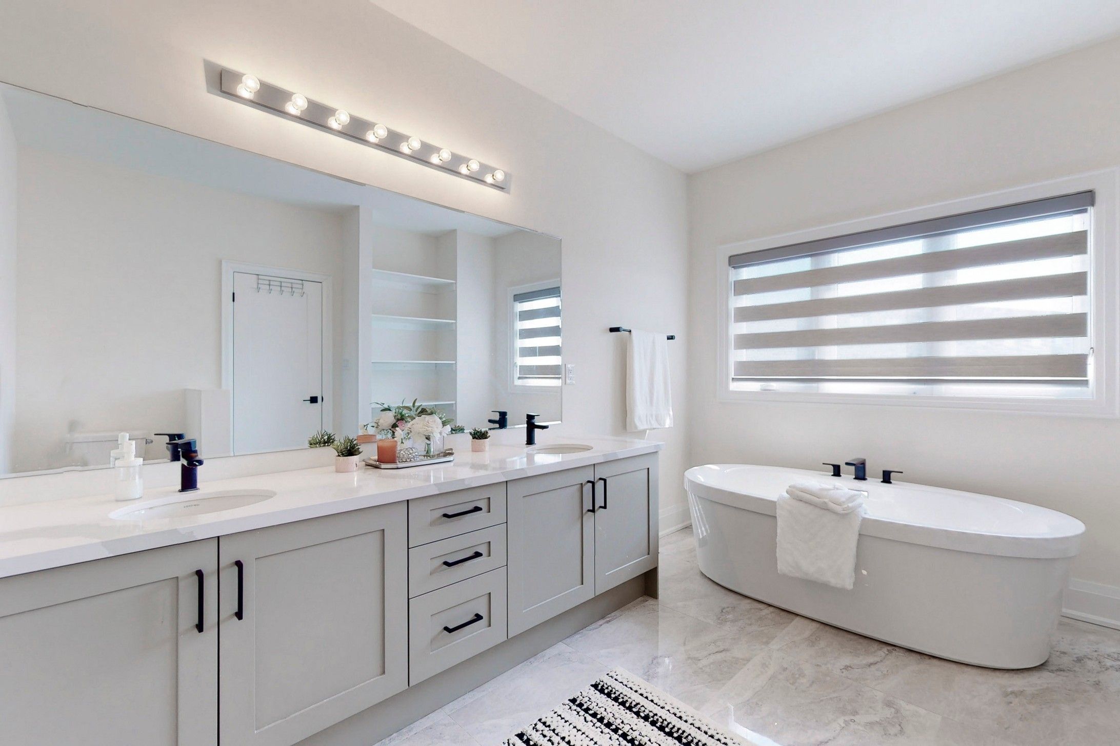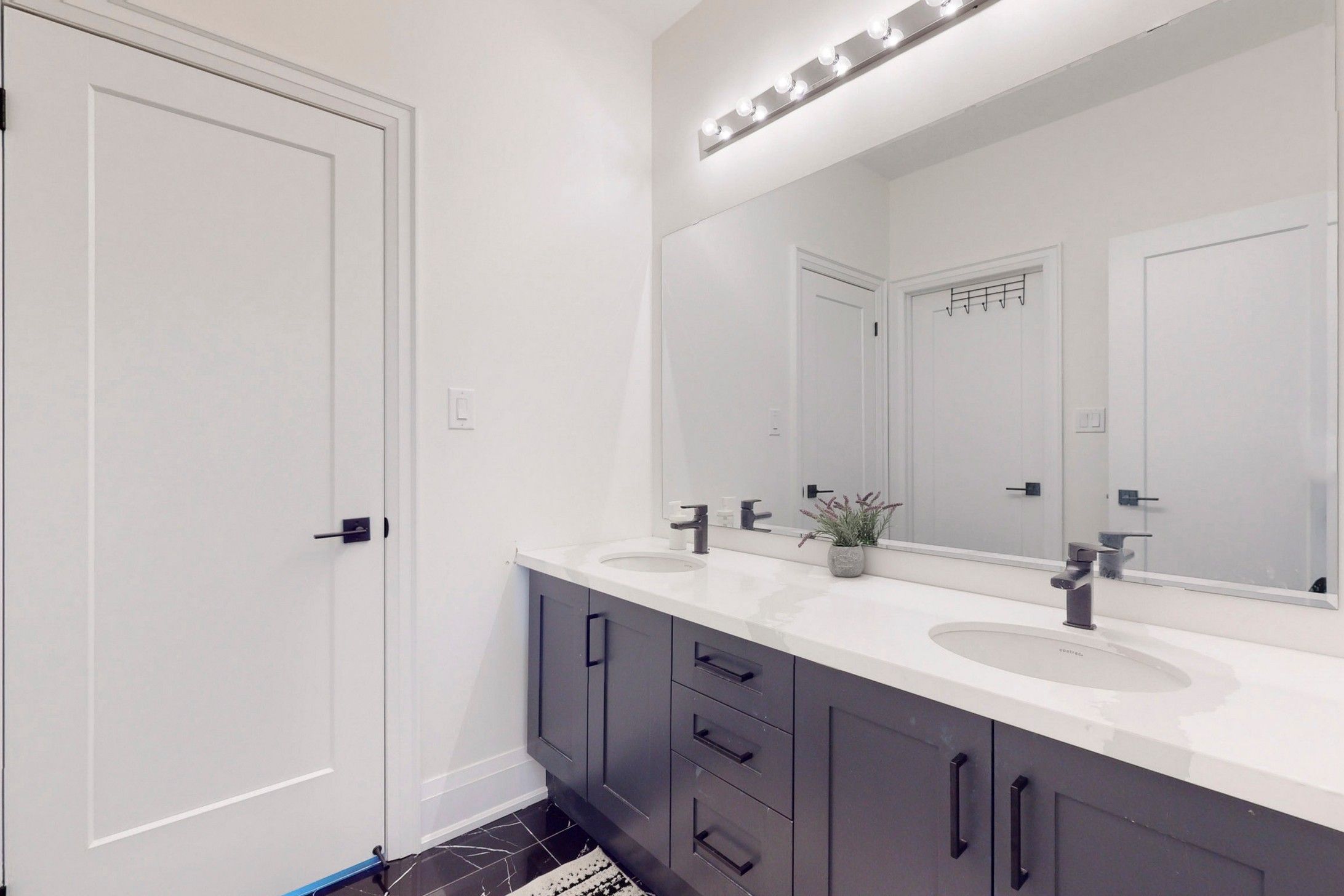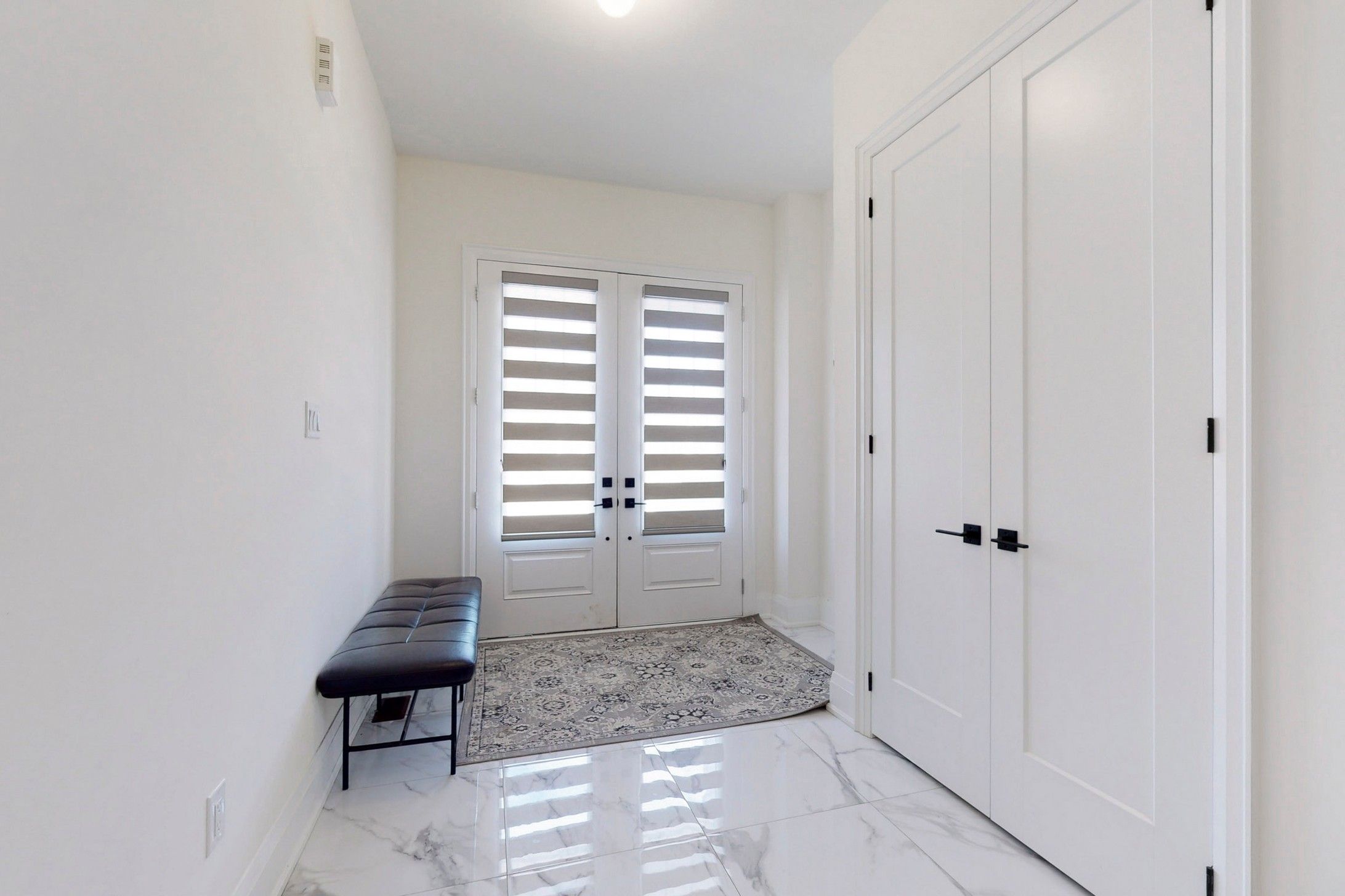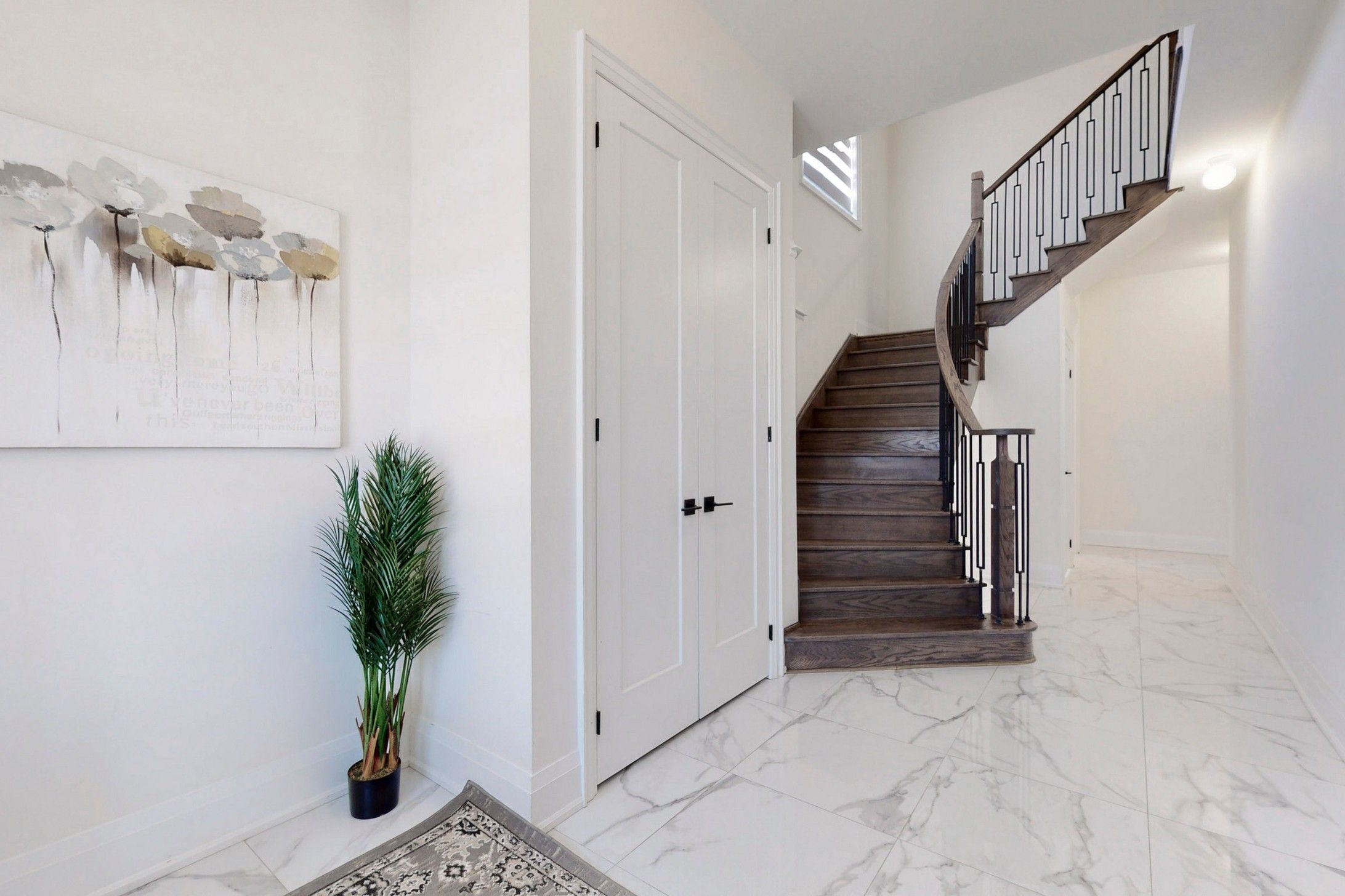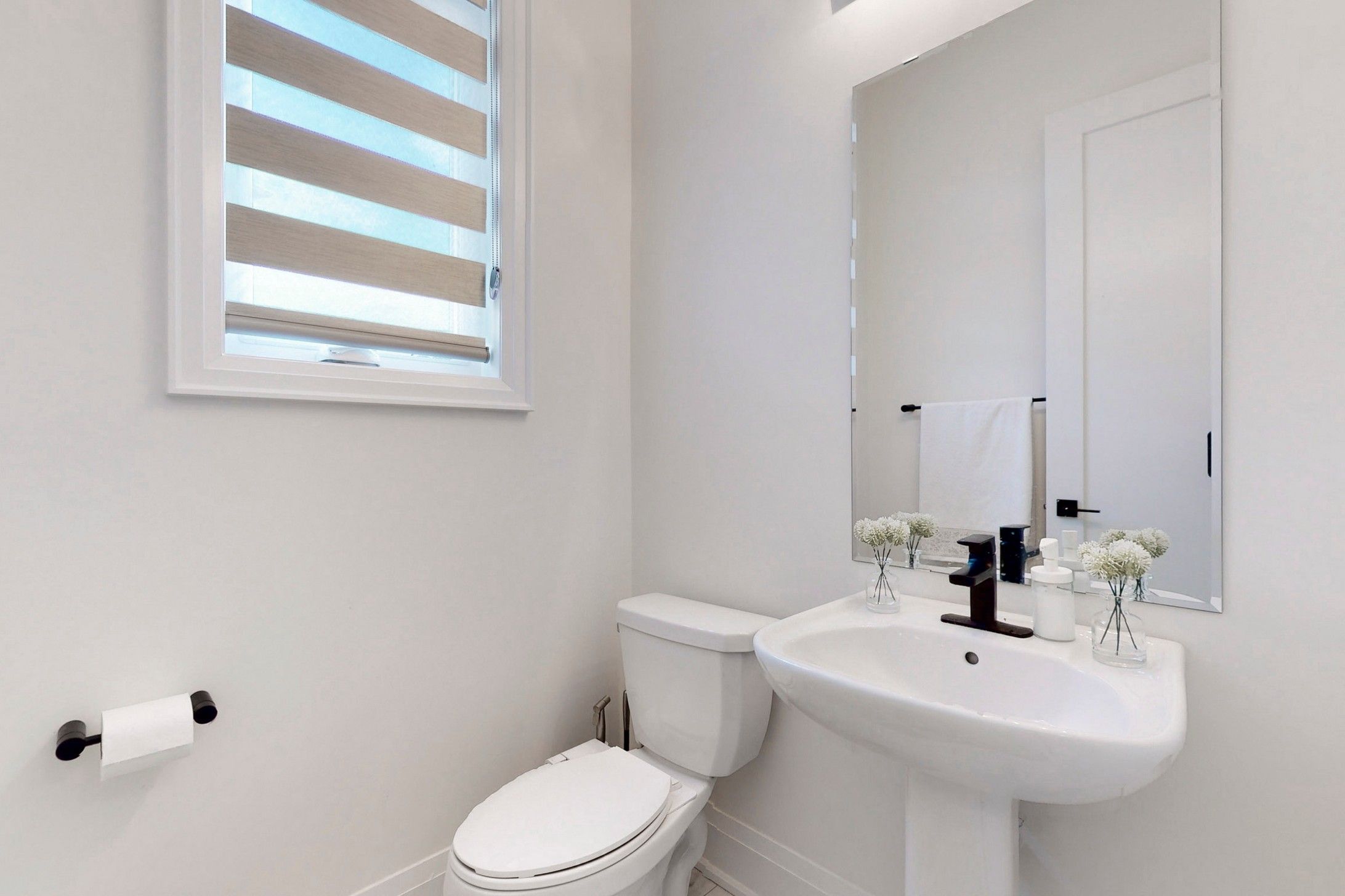washrooms. Modern theme door knobs and washroom accessories. Tall doors and windows on main floor.