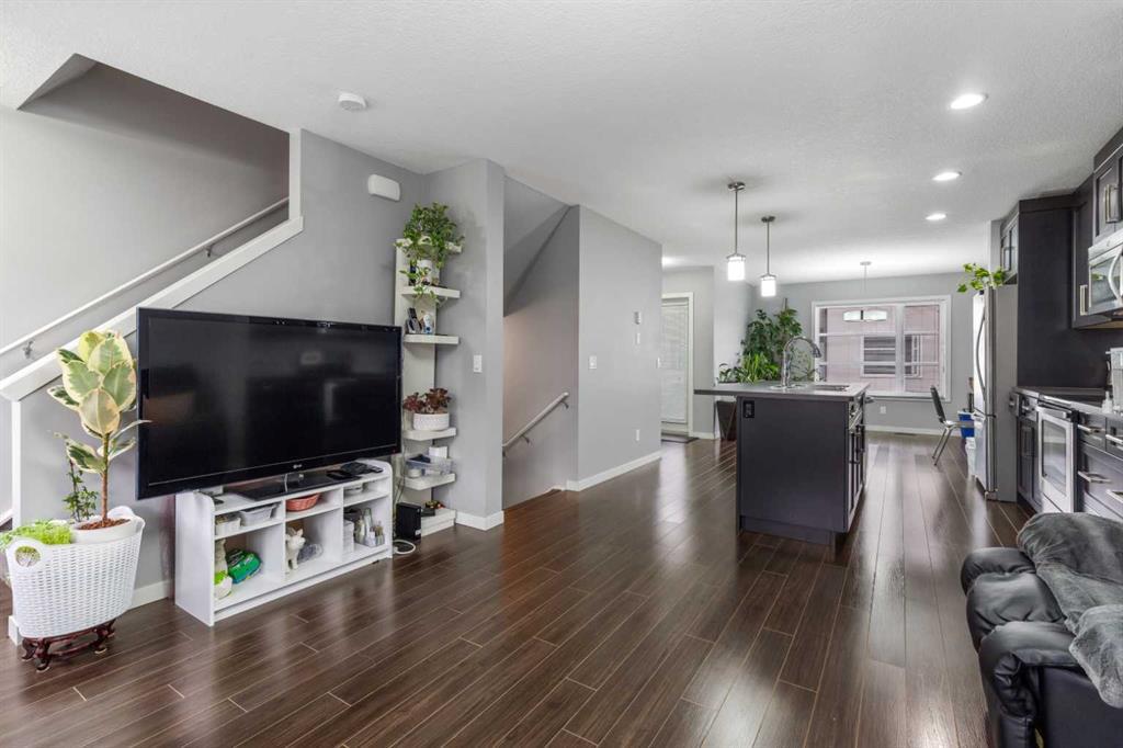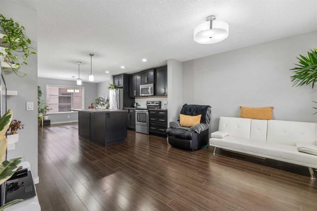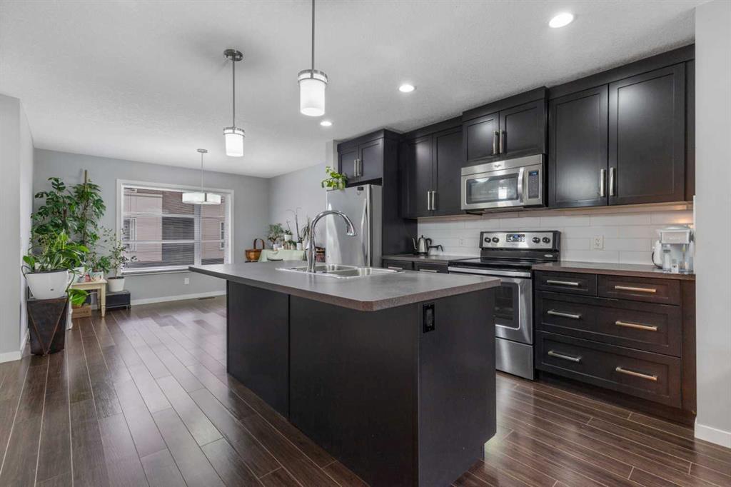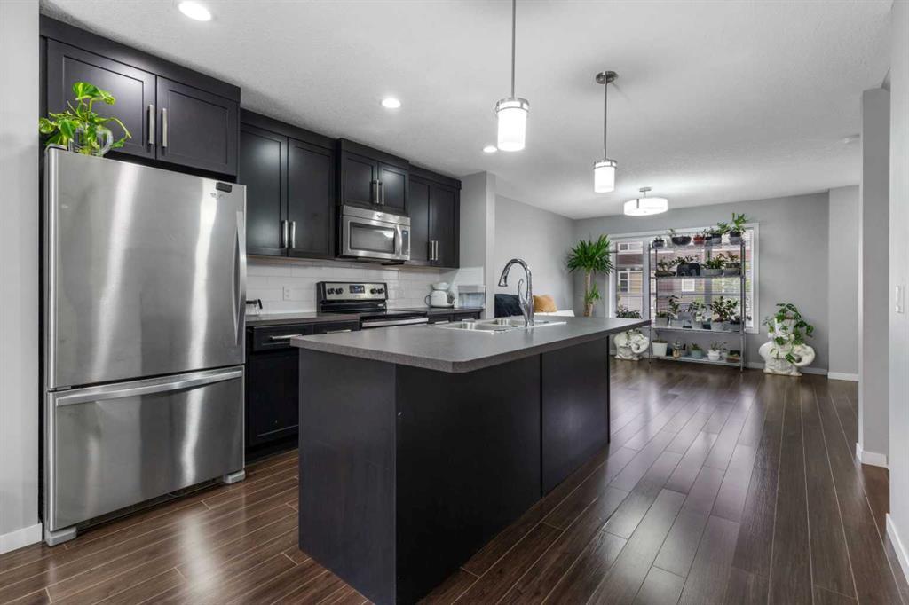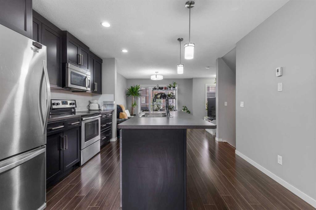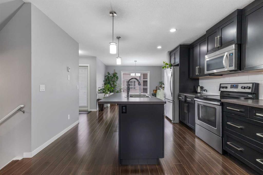 Welcome to this beautiful three-story townhome in Evanston. It is the perfect start to creating lifetime memories. Totalling 1385 SQF. As soon as you entering to the front Foyer, there is a Den/ office on your right that can be the 4th bedroom with hallway to the back of double attached garage and stairway leads you up to the second level that features a bright & open concept layout with living room, kitchen, and dining room with large windows that filled in abundant of natural light. Entertain your guests or cook homemade meals in a modern kitchen complete with a large island, STAINLESS STEEL appliances and a separate pantry offers plentiful storage. Upgrade laminated flooring throughout the main floor includes a powder room. In addition, there is a covered private deck with a built-in gas line for your summer BBQ. Move upstairs to relax in one of 3 bedrooms, complete with two full bath and a laundry room. The master bedroom features a walk-in closet & full ensuite bath. Visitor parking is just steps from the door, making it easy to invite guests to this house that guarantees PRIDE OF OWNERSHIP. This wonderful house is in Evanston, a vibrant, family-friendly community. Amenities including a school just across the street with a bus stop , also restaurants, shops, and a walking path is within walking distance and short drive to all the major highways. Come visit your new dream home today! You won’t be disappointed. (id:22211)
