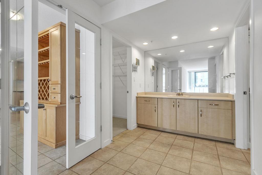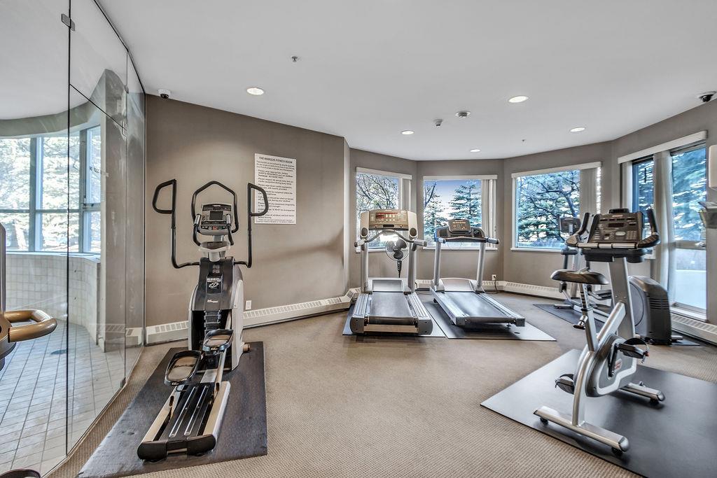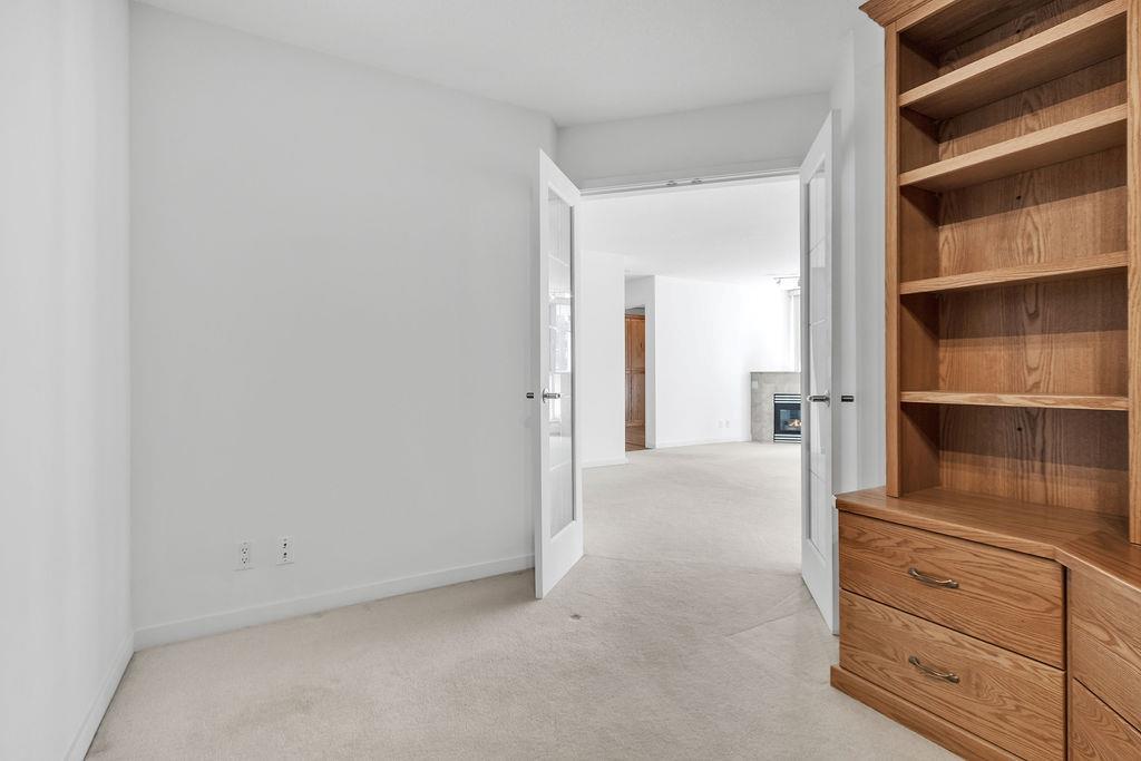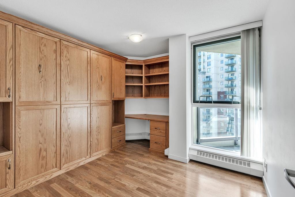 Make your Mark in The Marquis! Imagine a massive condo spanning nearly 2200 sf on a single level in Calgary's downtown west end next to the Bow River. This outstanding double suite is quite unique so please refer to the floorplan for guidance. You will enter the unit into the living room that has a natural gas burning fireplace and access to 1 of 2 balconies. A dedicated office space/den with built-in shelving is through the French doors. The primary ensuite is on through another set of French doors, with dual closets and 3 piece ensuite bathroom including a jetted tub. Make your way to the other wing of the suite and you will find the 2nd bedroom with a built-in Murphy bed and desk that could be used as a second office. There is another 3 piece bathroom with shower and hallway to the in suite laundry room. The large tile-floored gourmet kitchen has a center island with granite countertops, plenty of cupboards, walk-in pantry and opens up to an expansive dining room with access to the second balcony. The sunny south facing family room would be a perfect room for your favorite crafts or reading room with the 2nd gas fireplace. At the far end of the unit is the 3rd bedroom through another set of French doors with a large 3 piece ensuite and walk-in closet. The Marquis offers owners indoor visitor parking, exercise facilities with his/her change rooms and a party room for gatherings. Whether you are interested in walks by the Bow River, specialty shops, restaurants, theatres or transit, all are within walking distance. (id:22211)