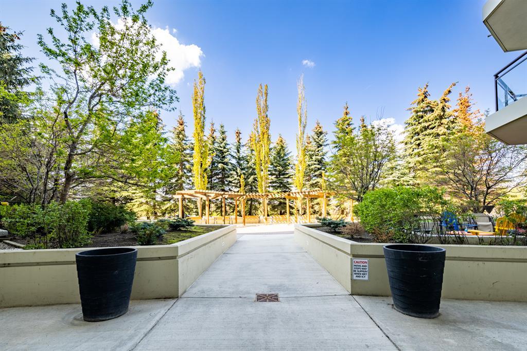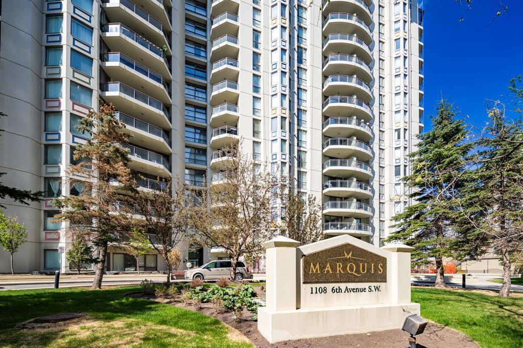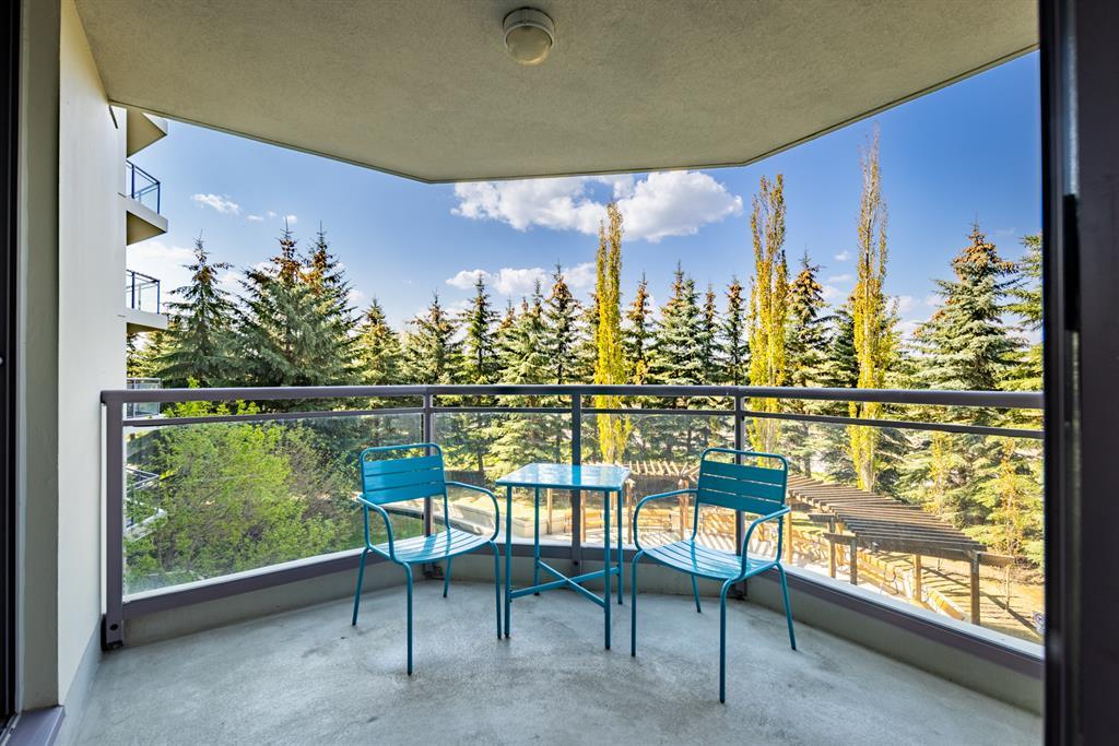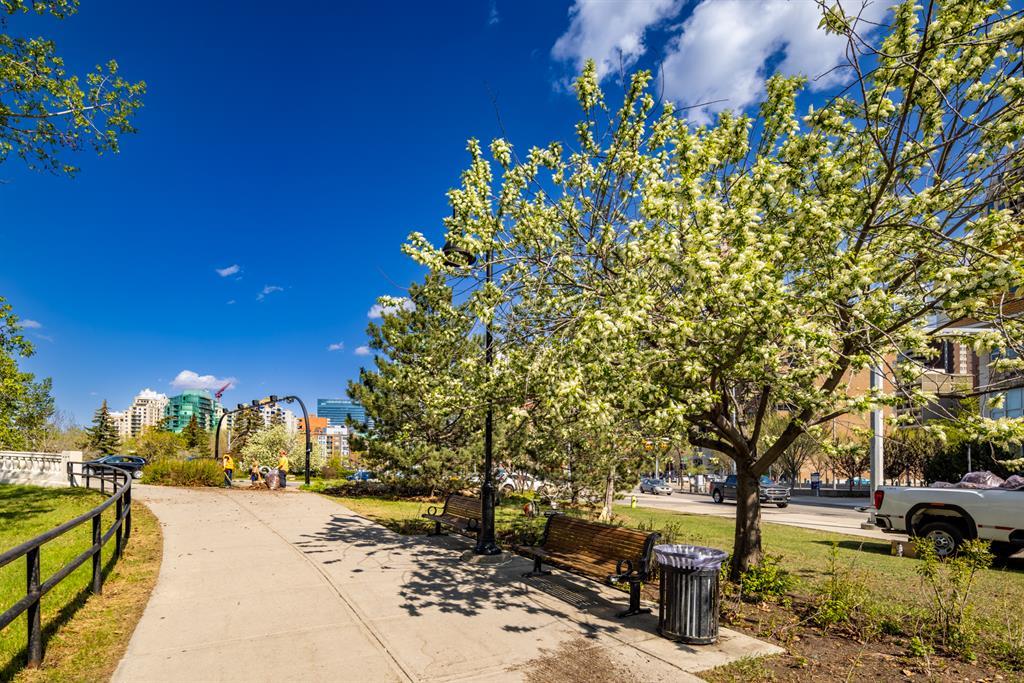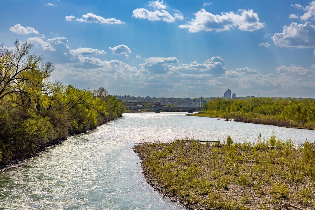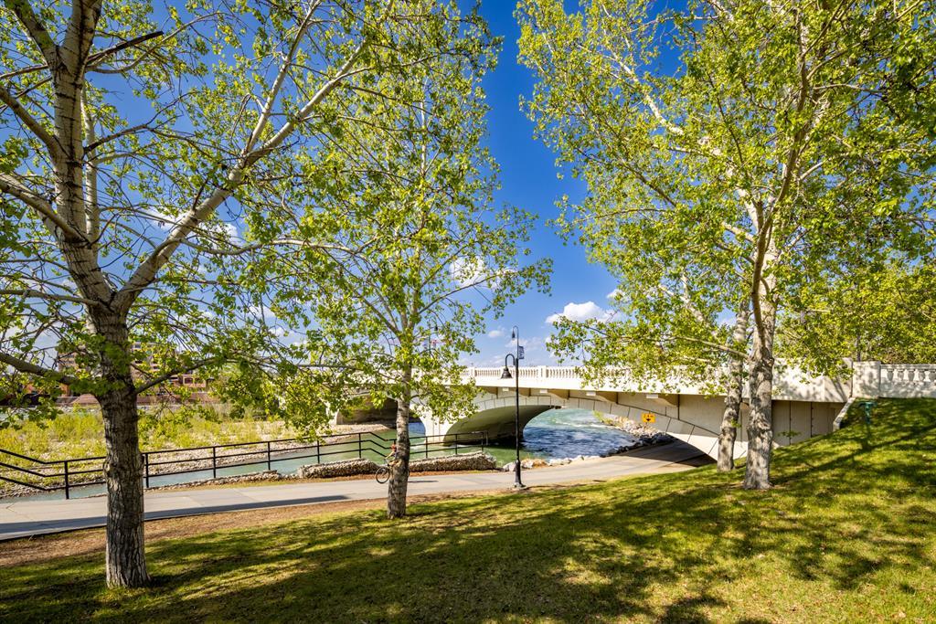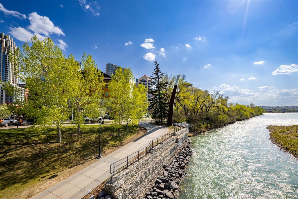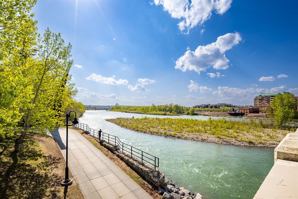 Looking to live in style in the heart of the city? Feast your eyes on this impeccable 2 bedroom + den condo in THE MARQUIS - a luxurious concrete high-rise on the western edge of the bustling downtown core. As you step inside, be prepared to be awed by the breathtaking views of the Bow River and the lush surrounding trees.This third-floor unit is the epitome of modern, maintenance-free living, perfect for those who crave the hustle and bustle of the city. Entertaining in the open-concept living/dining room is a breeze, with a cozy gas fireplace and built-in shelving, while the upgraded stove in the chef's kitchen will make cooking a breeze. And for those working remotely, the den/office with a window bringing in natural light from the great room is a game-changer.The bedrooms are cleverly situated at opposite ends of the condo, ensuring maximum privacy for all residents. The master bedroom boasts not one, but two mirrored closets, and a luxurious ensuite featuring heated tile floors, a soaker tub, and a separate shower. The second bedroom offers a private entrance to the balcony, making it the perfect spot to unwind with a cup of coffee or a glass of wine.This condo also comes complete with in-suite laundry and storage, titled tandem underground parking stalls, and a separate storage locker for your exclusive use. Enjoy the natural beauty of the river and trees from your covered balcony, which also includes a natural gas line for your BBQ.In addition to its stunning location, the complex boasts a wide range of top-of-the-line amenities, including underground visitor parking, a courtyard with a stylish pergola and benches, meeting rooms, and a fitness center, with an expanded fitness area. With quick possession available, you could be enjoying all the perks of downtown living in no time. Don't miss out on this incredible opportunity to live in style and convenience! (id:22211)