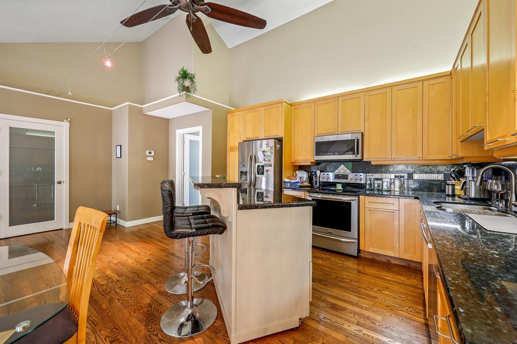 Located in the quiet enclave of Patterson Bluffs with Ponds, Manicured Lawns, Mature Trees & Visitor Parking for Family & Friends this home is sure to impress. Well maintained & cared for with 1,745SF of developed living space. The open concept floorplan with vaulted ceilings & numerous large West facing windows provide an abundance of natural light throughout the day. The home is decorated in soft contemporary colours, upgraded lighting package, dark polished oak hardwood floors, open riser stairs w hardwood treads, metal spindles, maple rails & posts. The Kitchen & breakfast nook, include SS appliances, an Island with raised coffee bar & numerous maple cabinets with large granite counters for your entertaining pleasure. The Living/Great room & adjoining dining area have a gas fireplace with tile surround & white mantle with access to the large deck for your summer BBQ pleasure. The large primary bedroom will accommodate oversize furniture pieces, has its own balcony for private moments, 2 closets and 4 piece ensuite with twin raised sinks & large shower with tiles & glass enclosure. The 2nd bedroom is large as well with a Jack & Jill 4 piece ensuite, with a raised sink, granite counters, traditional white cabinet, tile floors & tub & shower combination. The lower level with plush carpet has a large flex room that is ideal as a rec room for entertaining, or as a media room, office or work out area. There is an attached finished double garage that is extra deep & ideal for additional storage or the larger vehicle. Other appliances include: Central Air (2015), High Eff Furnace (2017), Thermostat (2017), Humidifier with Water Saver (2020), Hot Water Tank (2018), Microwave Oven (2019), Electric Stove (2018), Stacked Front Loading Washer & Dryer( 2015), Window UV Protection Covering (2015), Vacuflo with Attachments (2021), 3 Storm Doors (2021) & Water Softener. The Monthly Condo fees include a partial credit for furnace & hot water tank repair & replacement (buyer’s responsibility to review condo docs and consult with condo Management Company for specific details). The Home is Tenant occupied until July 31, 2023. Tenant Rights Apply. Patterson is a Preferred Community Close to Shopping, Parks, Schools, Public Transportation & Downtown. Welcome Home!!! (id:22211)