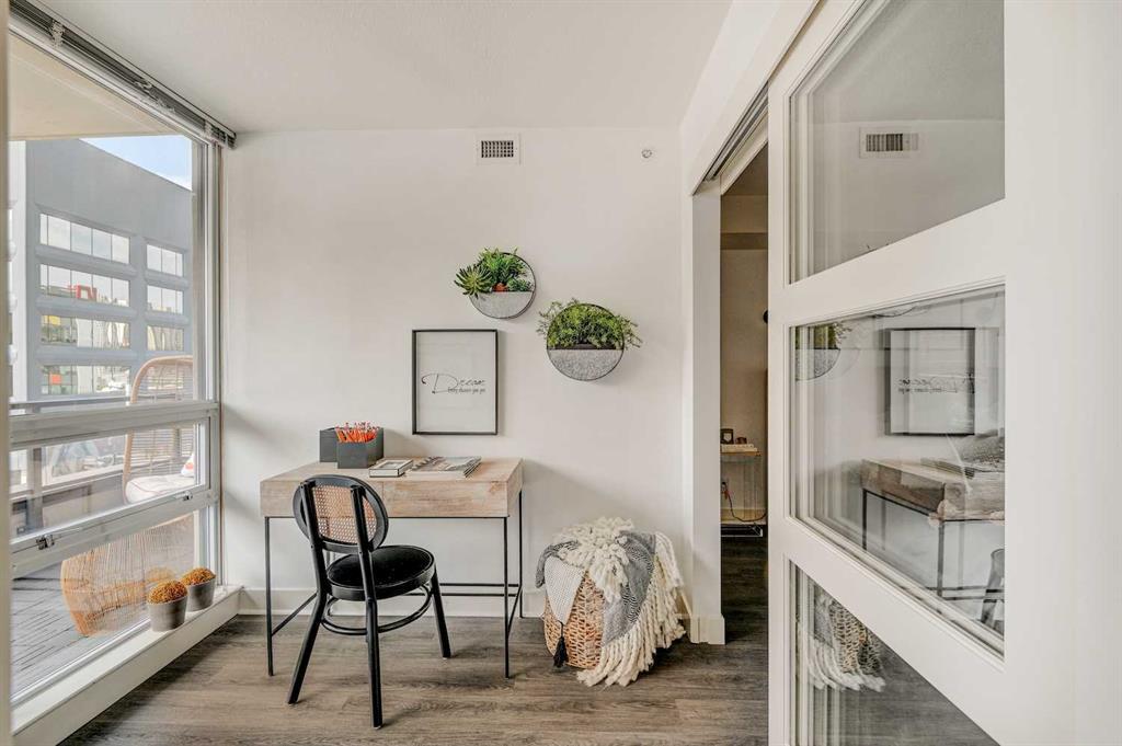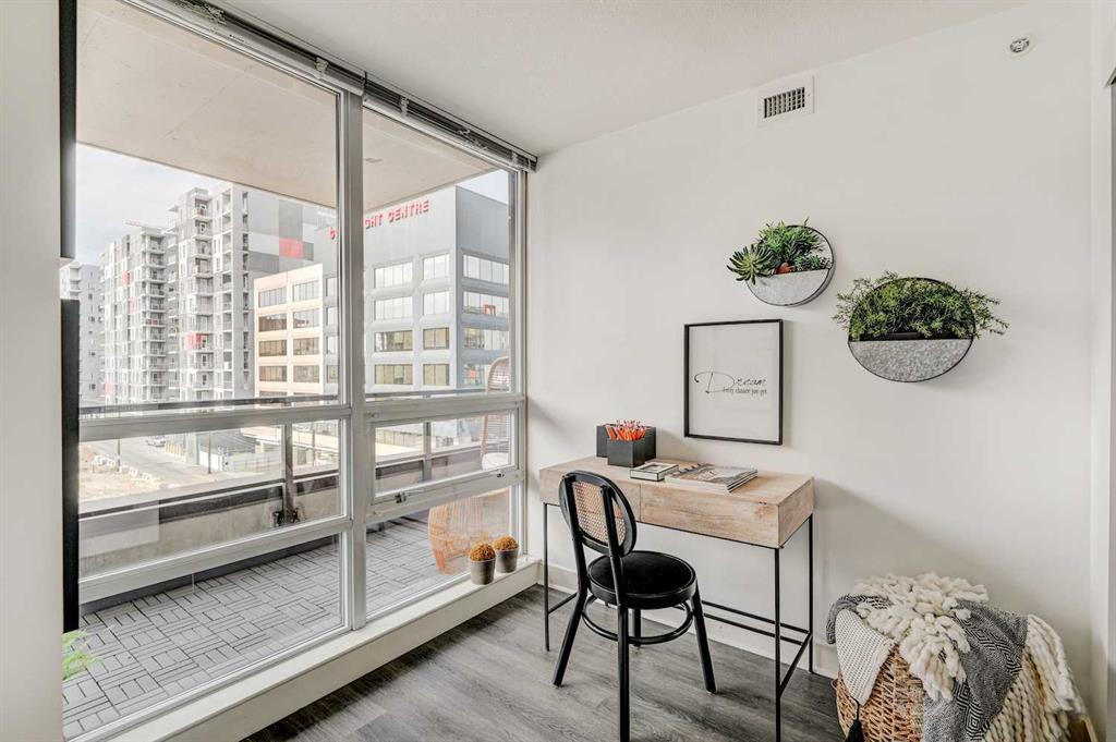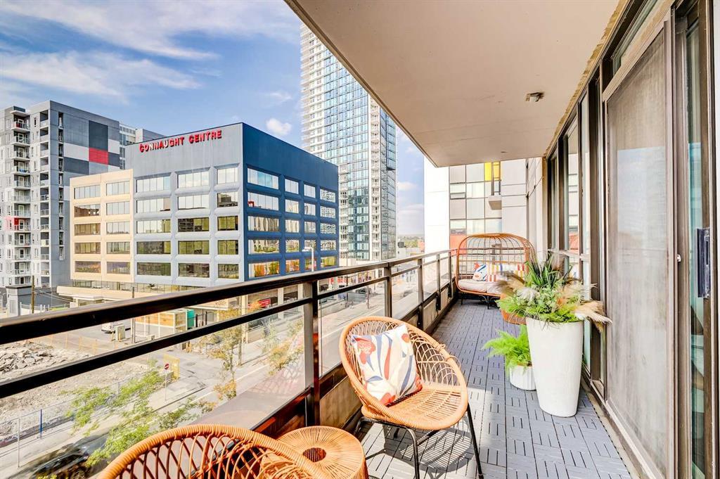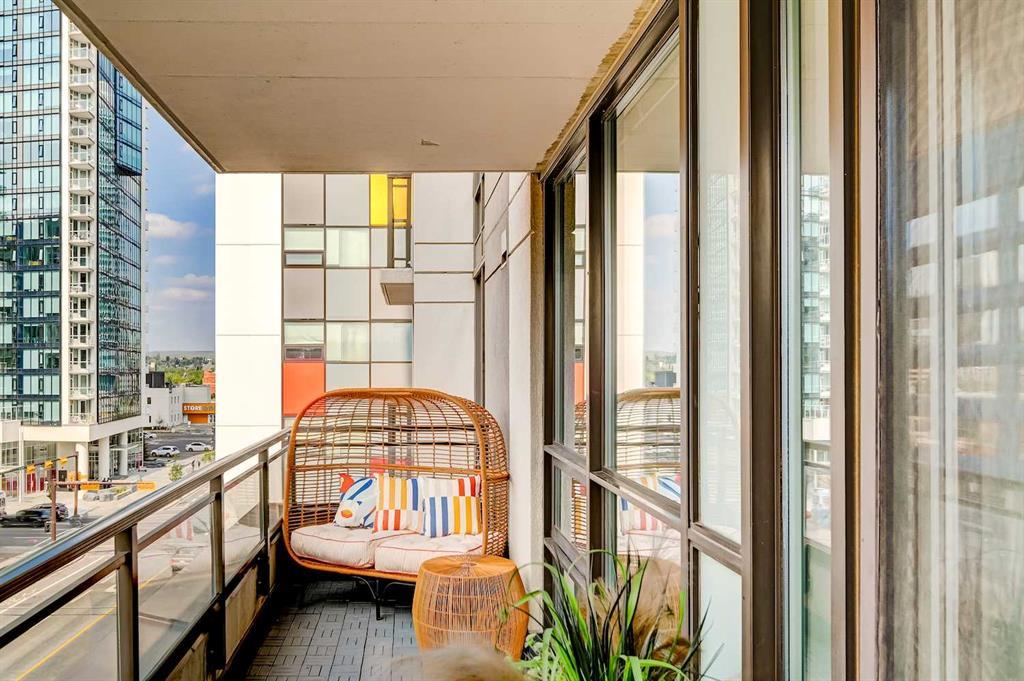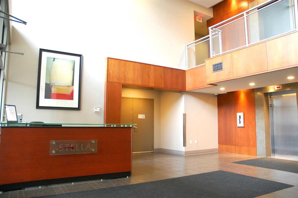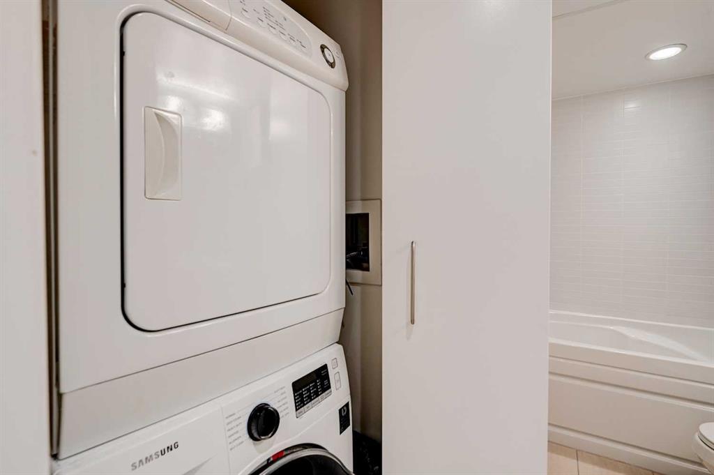 Welcome to STELLA, a concrete building by Qualex-Landmark. Upon entering this immaculately kept home, your eye will be drawn outside towards the expansive terrace beckoning you to indulge in 150 square feet of outdoor living; this space is partially covered to protect you from the elements. Freshly painted walls and newly installed vinyl plank floor finished in a grey barn-board create a contemporary and inviting atmosphere. This home boasts a generous 1-bedroom plus den layout where the den itself becomes a striking feature. Encased in floor to ceiling windows, the den is adorned with architecturally exquisite sliding glass doors that elegantly separate the bedroom area adding a touch of versatility to the space. The primary bedroom is sanctuary of comfort generously sized to effortlessly accommodate a king size bed and charming sitting area. The walk-in closet, extending over 7.5 feet provides an abundance of storage for your wardrobe essentials and accessories, ensuring everything is meticulously organized. A spa-inspired bathroom awaits, accessible through duel entryways and adorned with a soaker tub. The white stacked tiles create a fresh Scandinavian vibe. The strategically positioned washer and dryer within the bathroom not only offer convenience, but also elevate the functionality - whether it's pre-soaking laundry or enjoying a heated towel post-shower. Ample storage if further provided by a linen closet, enriching the space with practicality. The galley kitchen stands a testament to modern culinary elegance, featuring high-gloss white cabinets with a 24" deep pantry that cater to both aesthetics and storage needs. Stainless steel appliances seamlessly integrate into the space, harmonizing with the pristine granite countertops. Open shelving above the peninsula serves as an artful display area, while the extended granite countertops offer a perfect spot for bar stools, making it an inviting hub for socializing. STELLA presents an array of exceptional a menities, including Concierge/Security service, a fully equipped gym for your fitness pursuits, a tastefully appointed guest suite, and an Owner's Lounge designed for relaxation and connection. Underground visitor parking ensures convenience for your guests. Nestled within this vibrant locate, you'll find yourself mere blocks from two grocery stores, an organic market, charming boutique shops, a variety of restaurants and inviting pubs. STELLA not only offers a home but a lifestyle of convenience and sophistication. (id:22211)