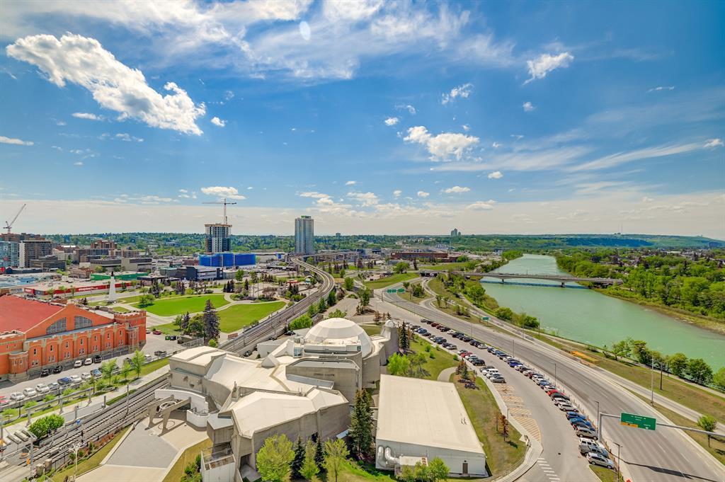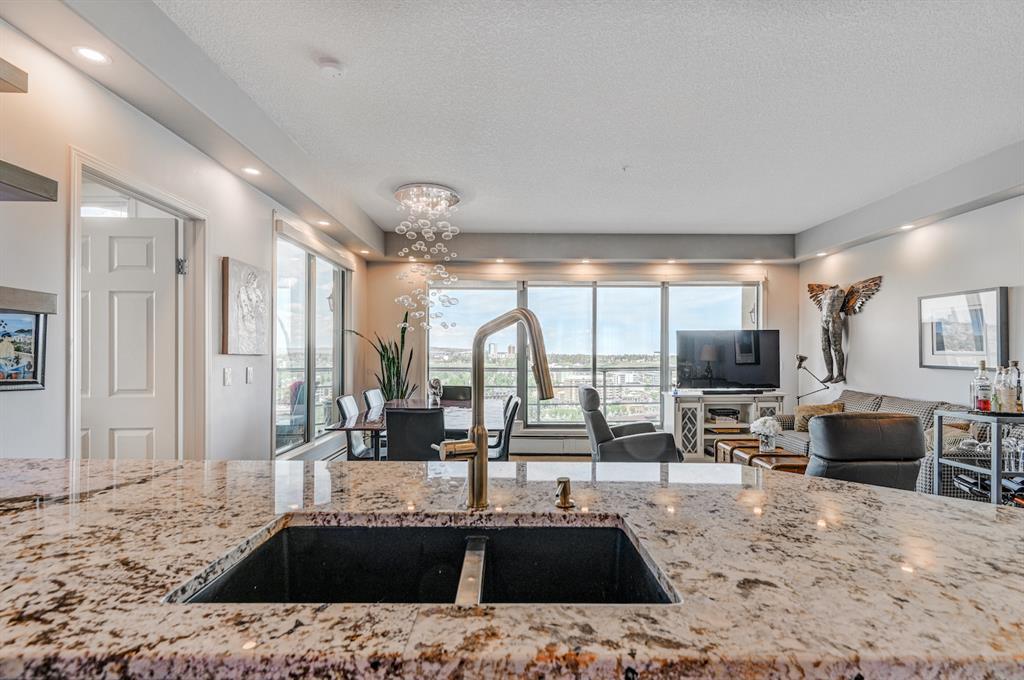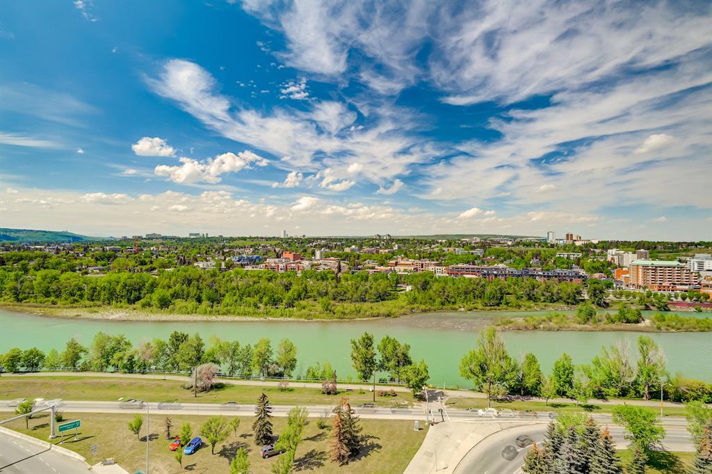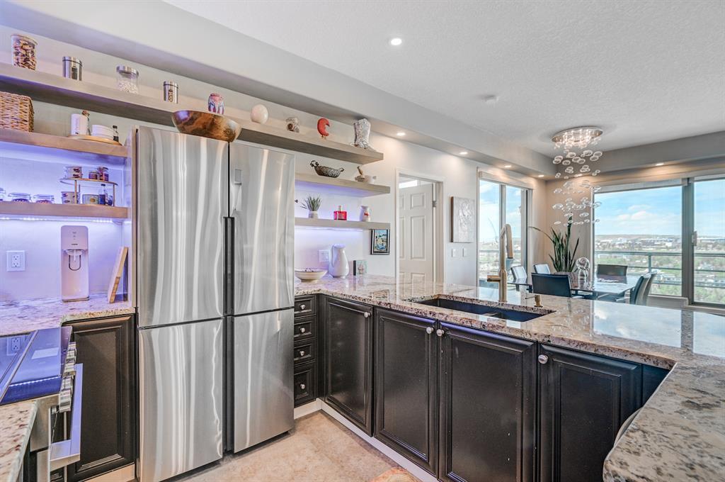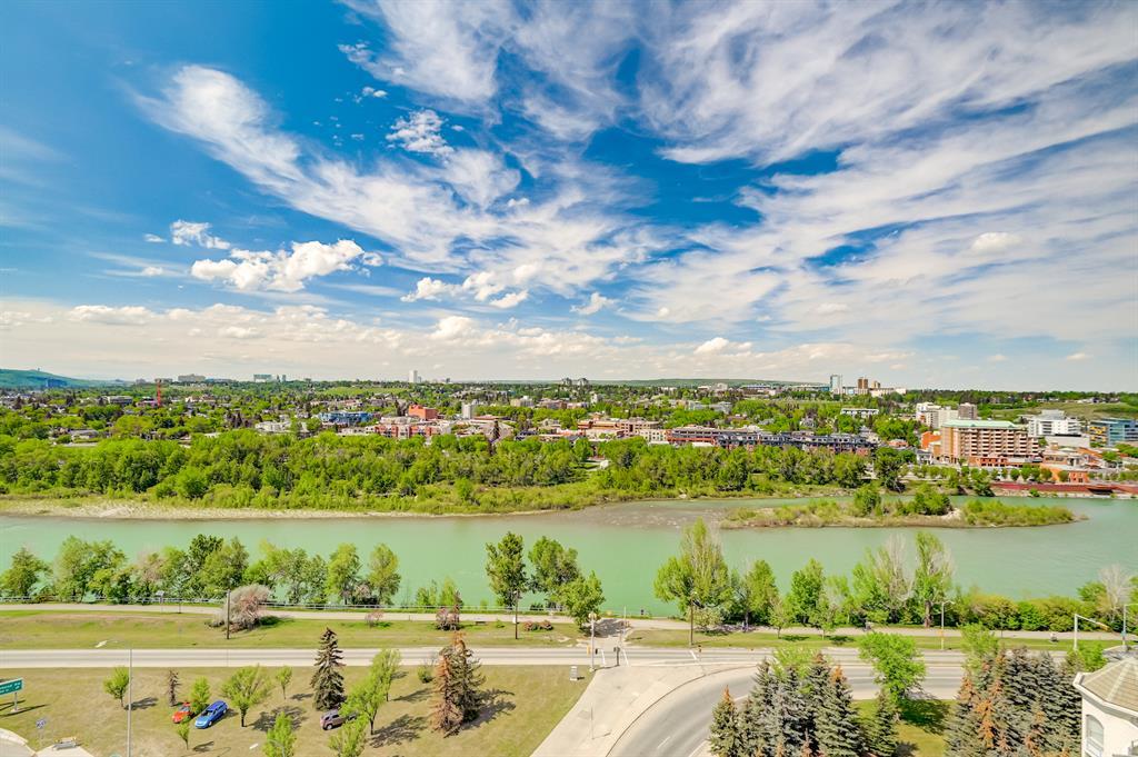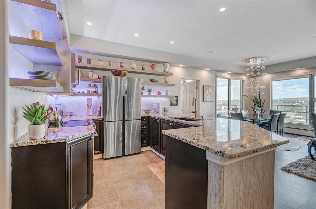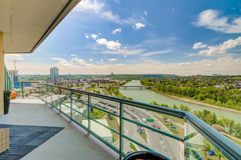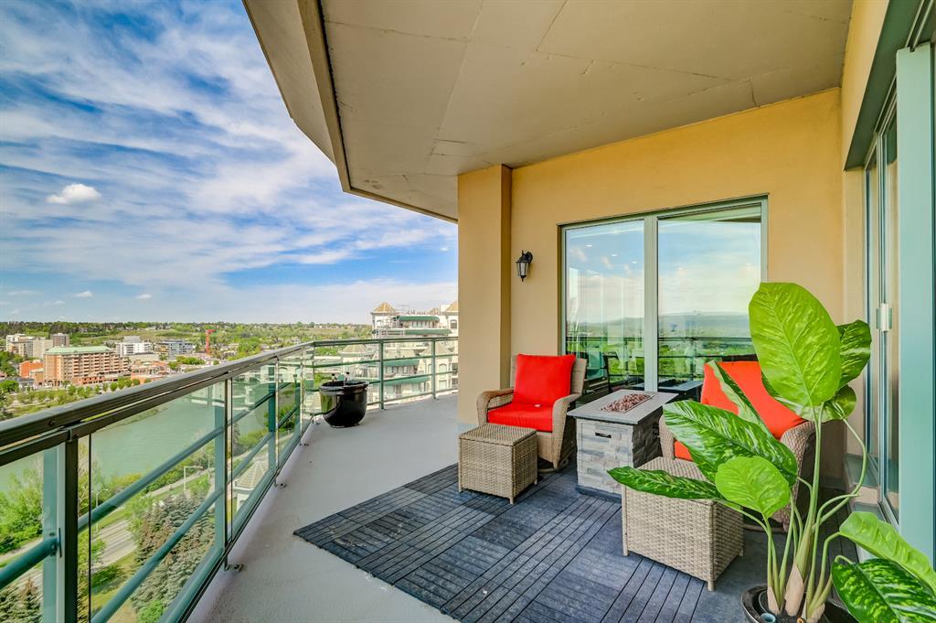 Live a lifestyle of affordable luxury with this immaculate 2 bed/2 bath penthouse suite. Homeowners can enjoy a quiet home base with on-site access to the well equipped fitness centre, roof top terrace, lounge, and party room. Made to fit your style, this sophisticated unit showcases a bright open floor plan with a massive wrap-around deck that capitalizes on the unobstructed views of the Bow River and vistas of the Rocky Mountains. The open main floor kitchen features granite counters, raised breakfast bar, open shelving, and overlooks the dining and living room with gas fireplace. A large den ideally functions as a mudroom or home office while the in-suite laundry is of the utmost convenience. Two generous bedrooms, including the master retreat with it's own ensuite, boasts an impressive amount of natural light from the floor to ceiling windows and include their own walk-in closet. This well managed condo also comes with 2 titled parking stalls in a secured underground parkade! Located just steps to the Downtown West/Kirby LRT Station, the Bow River Pathway System, shopping, and fantastic restaurants. Come experience all that this elegant sanctuary has to offer. (id:22211)