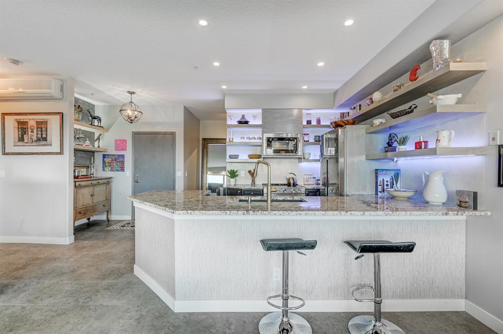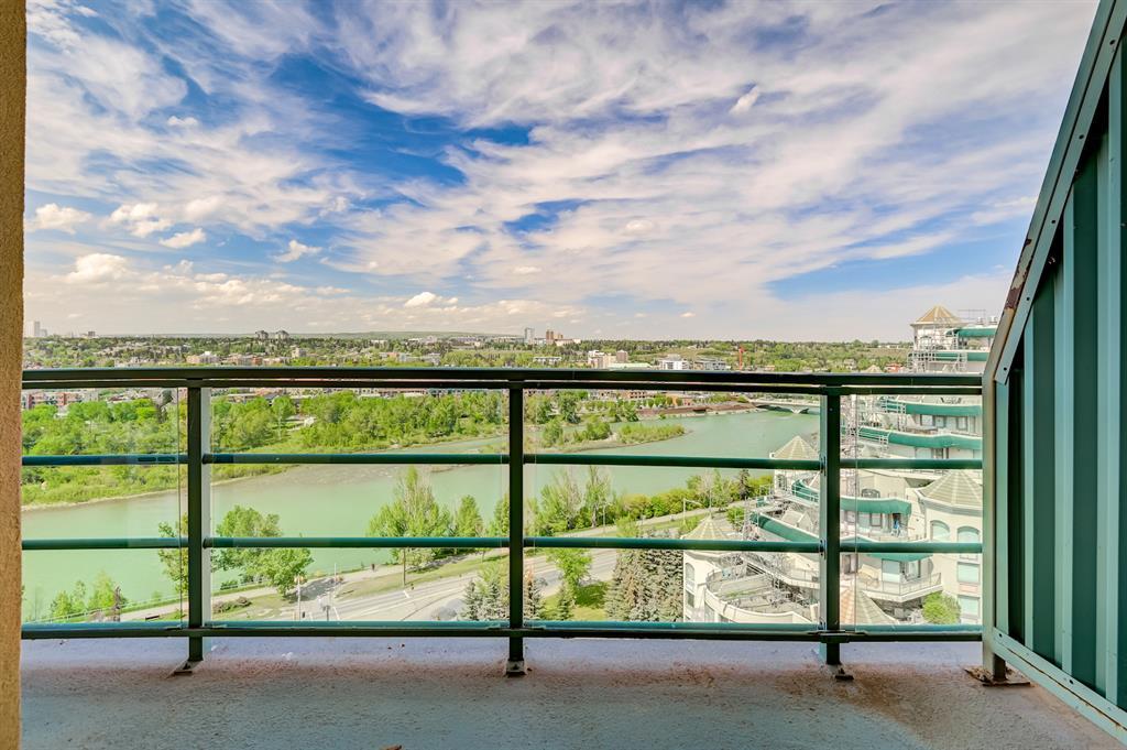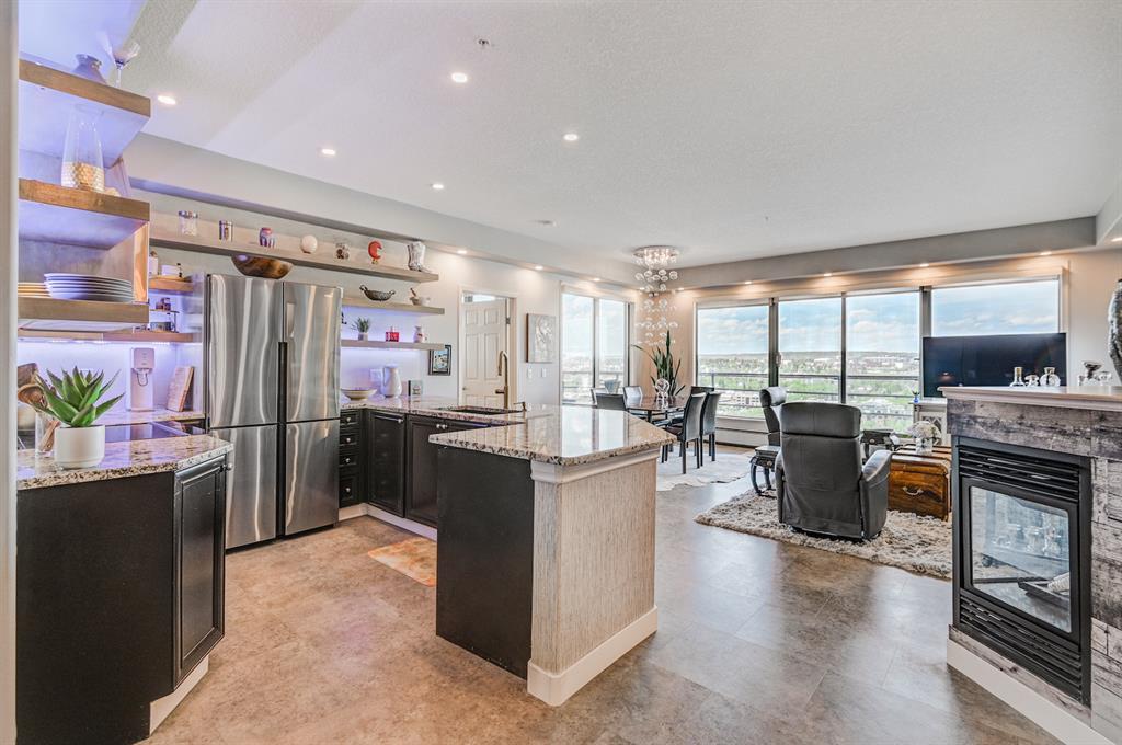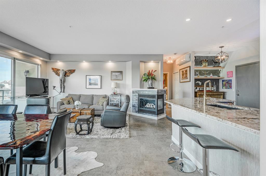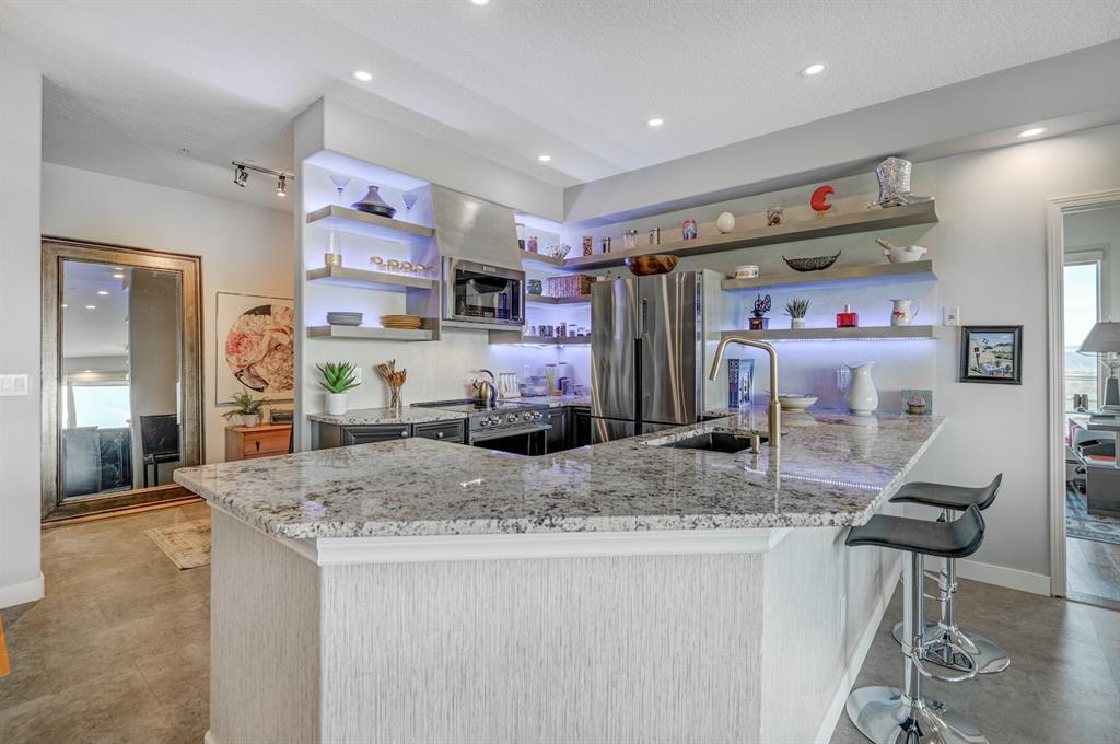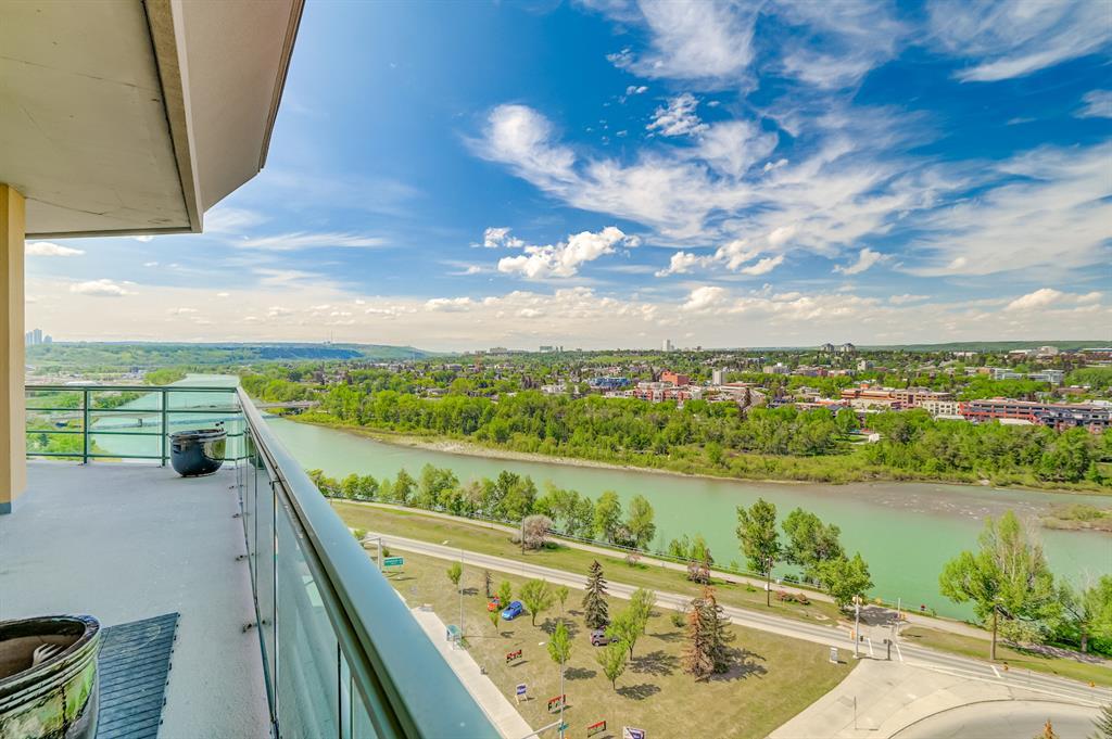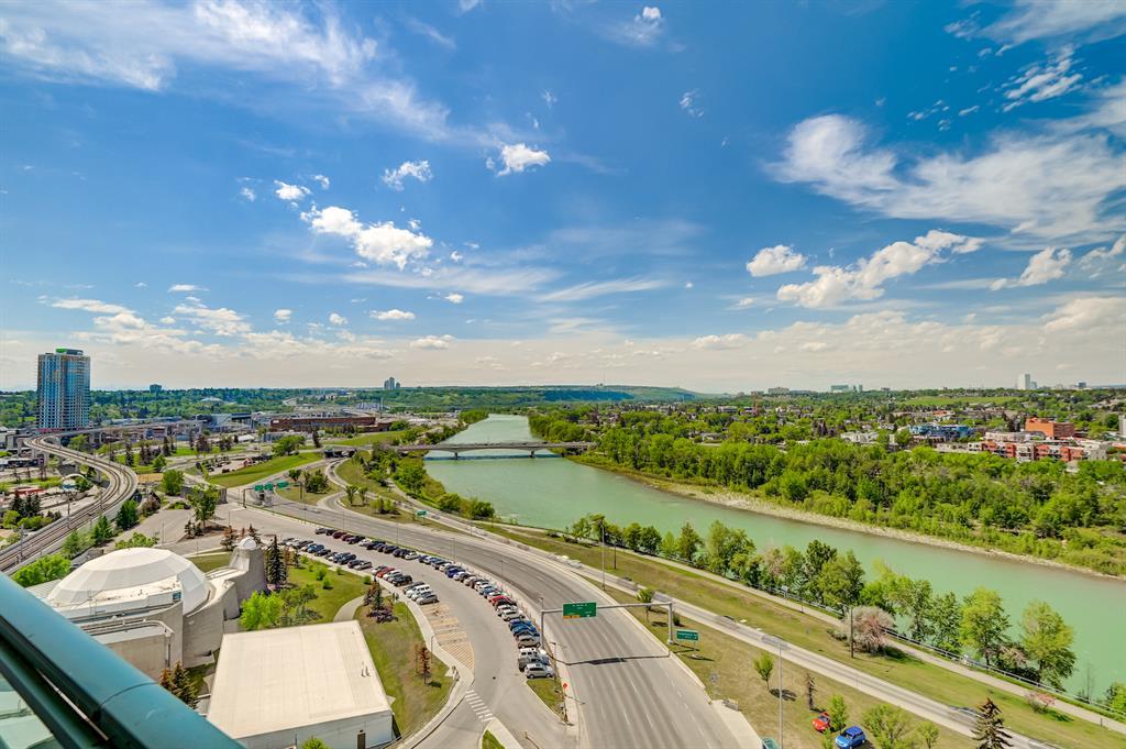 Live a lifestyle of affordable luxury with this immaculate 2 bed/2 bath penthouse suite. Homeowners can enjoy a quiet home base with on-site access to the well equipped fitness centre, roof top terrace, lounge, and party room. Made to fit your style, this sophisticated unit showcases a bright open floor plan with a massive wrap-around deck that capitalizes on the unobstructed views of the Bow River and vistas of the Rocky Mountains. The open main floor kitchen features granite counters, raised breakfast bar, open shelving, and overlooks the dining and living room with gas fireplace. A large den ideally functions as a mudroom or home office while the in-suite laundry is of the utmost convenience. Two generous bedrooms, including the master retreat with it's own ensuite, boasts an impressive amount of natural light from the floor to ceiling windows and include their own walk-in closet. This well managed condo also comes with 2 titled parking stalls in a secured underground parkade! Located just steps to the Downtown West/Kirby LRT Station, the Bow River Pathway System, shopping, and fantastic restaurants. Come experience all that this elegant sanctuary has to offer. (id:22211)