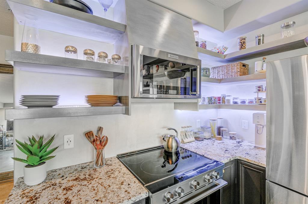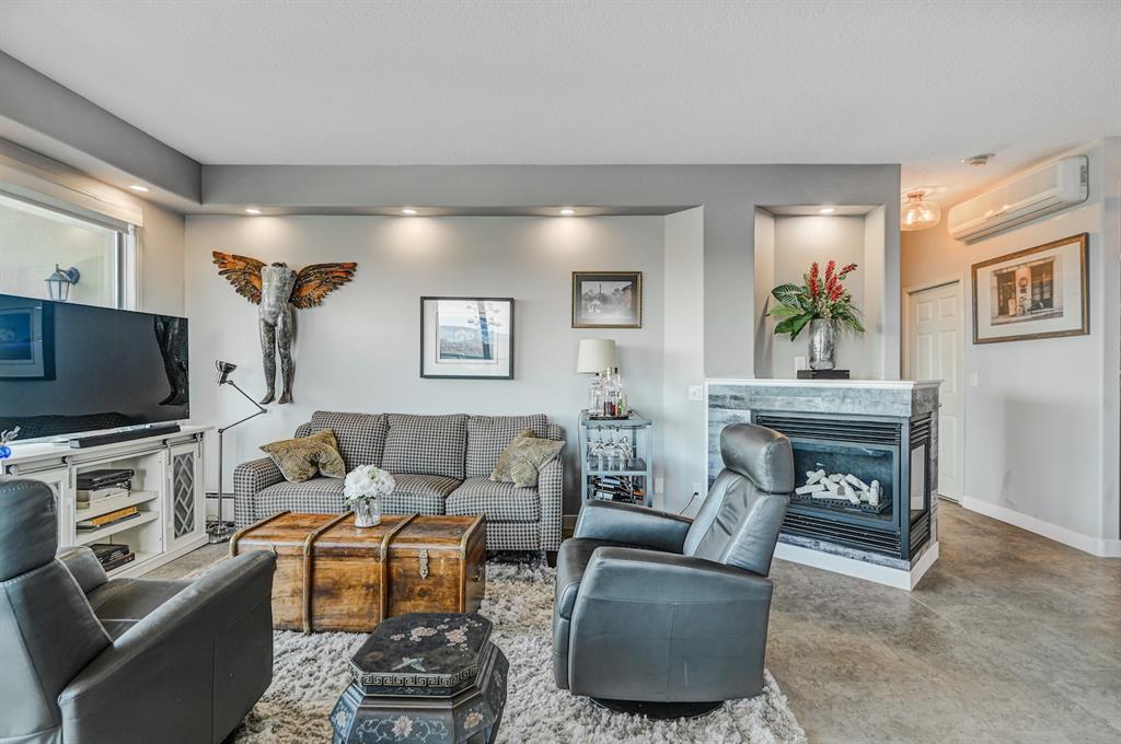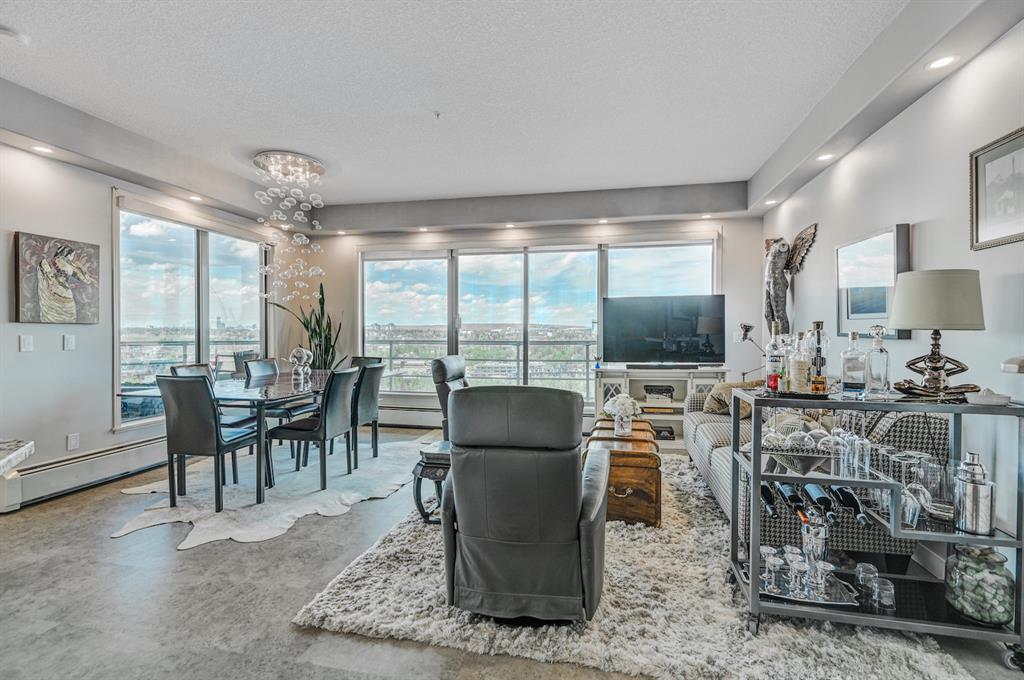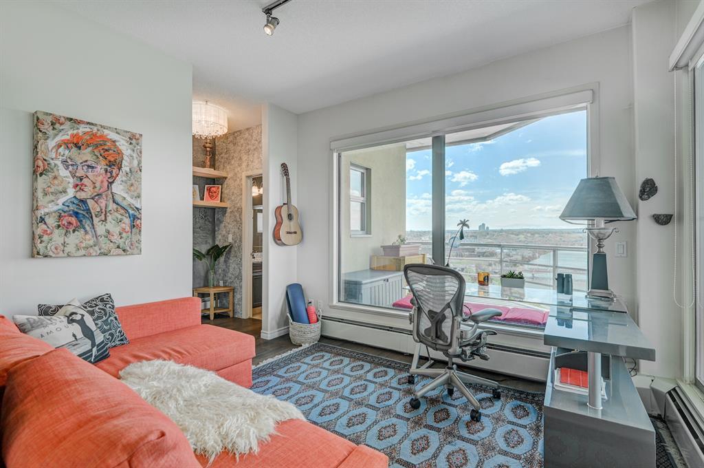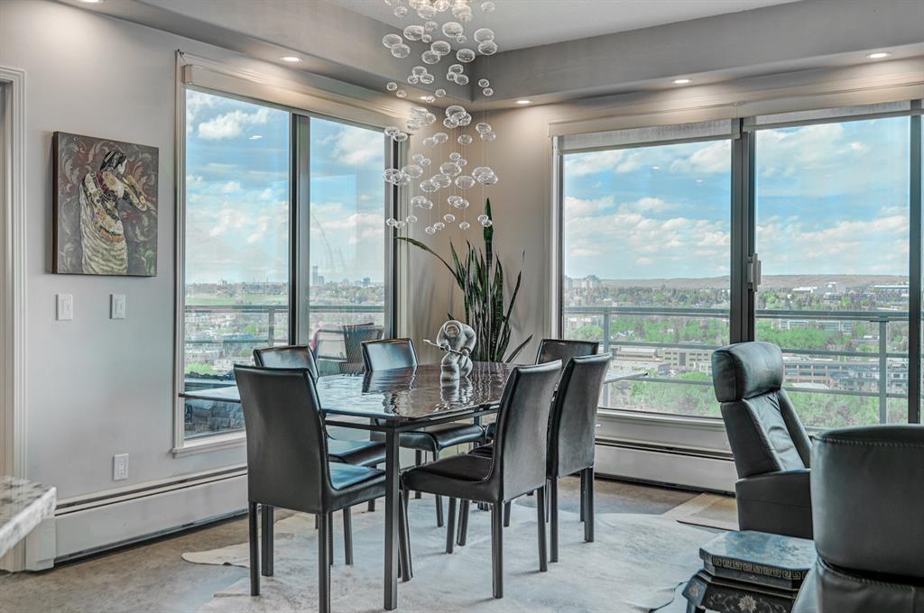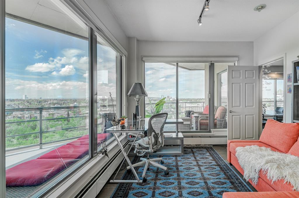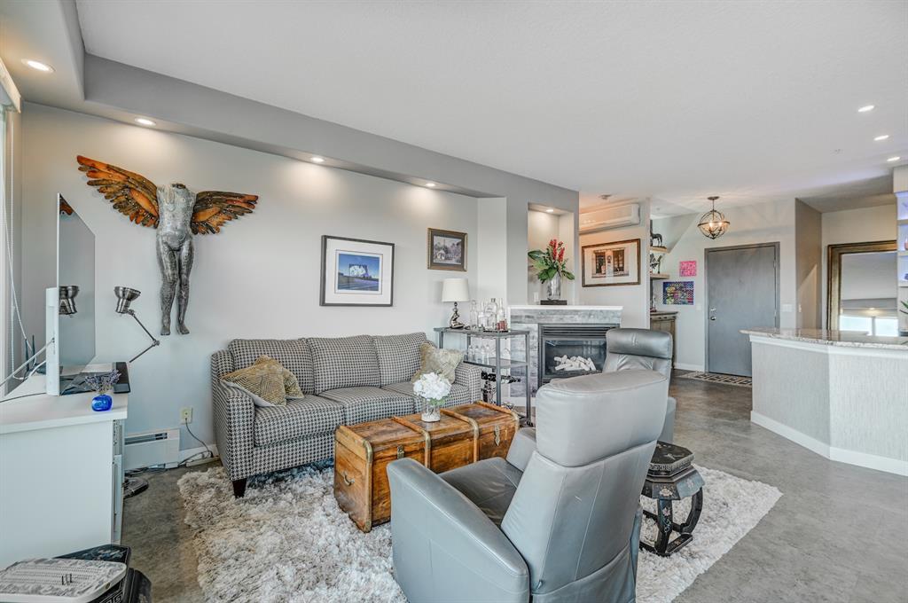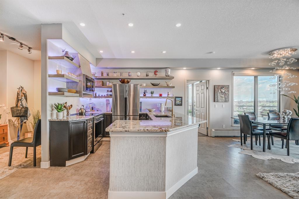 Live a lifestyle of affordable luxury with this immaculate 2 bed/2 bath penthouse suite. Homeowners can enjoy a quiet home base with on-site access to the well equipped fitness centre, roof top terrace, lounge, and party room. Made to fit your style, this sophisticated unit showcases a bright open floor plan with a massive wrap-around deck that capitalizes on the unobstructed views of the Bow River and vistas of the Rocky Mountains. The open main floor kitchen features granite counters, raised breakfast bar, open shelving, and overlooks the dining and living room with gas fireplace. A large den ideally functions as a mudroom or home office while the in-suite laundry is of the utmost convenience. Two generous bedrooms, including the master retreat with it's own ensuite, boasts an impressive amount of natural light from the floor to ceiling windows and include their own walk-in closet. This well managed condo also comes with 2 titled parking stalls in a secured underground parkade! Located just steps to the Downtown West/Kirby LRT Station, the Bow River Pathway System, shopping, and fantastic restaurants. Come experience all that this elegant sanctuary has to offer. (id:22211)