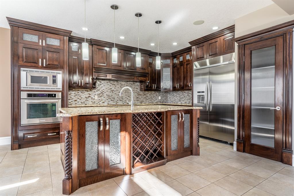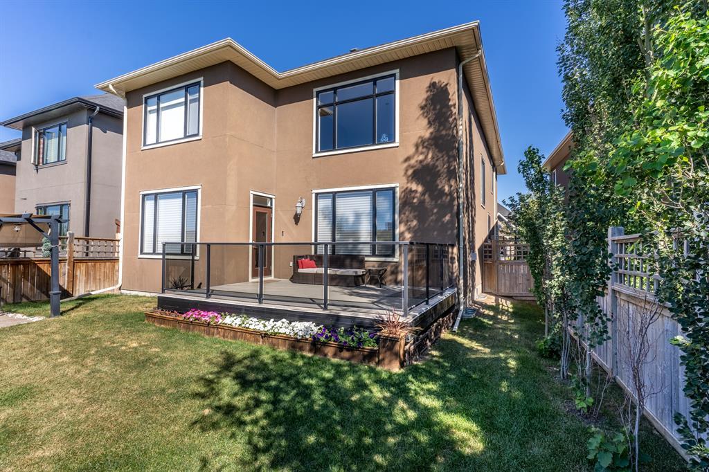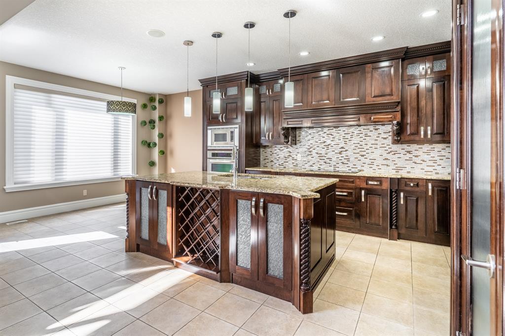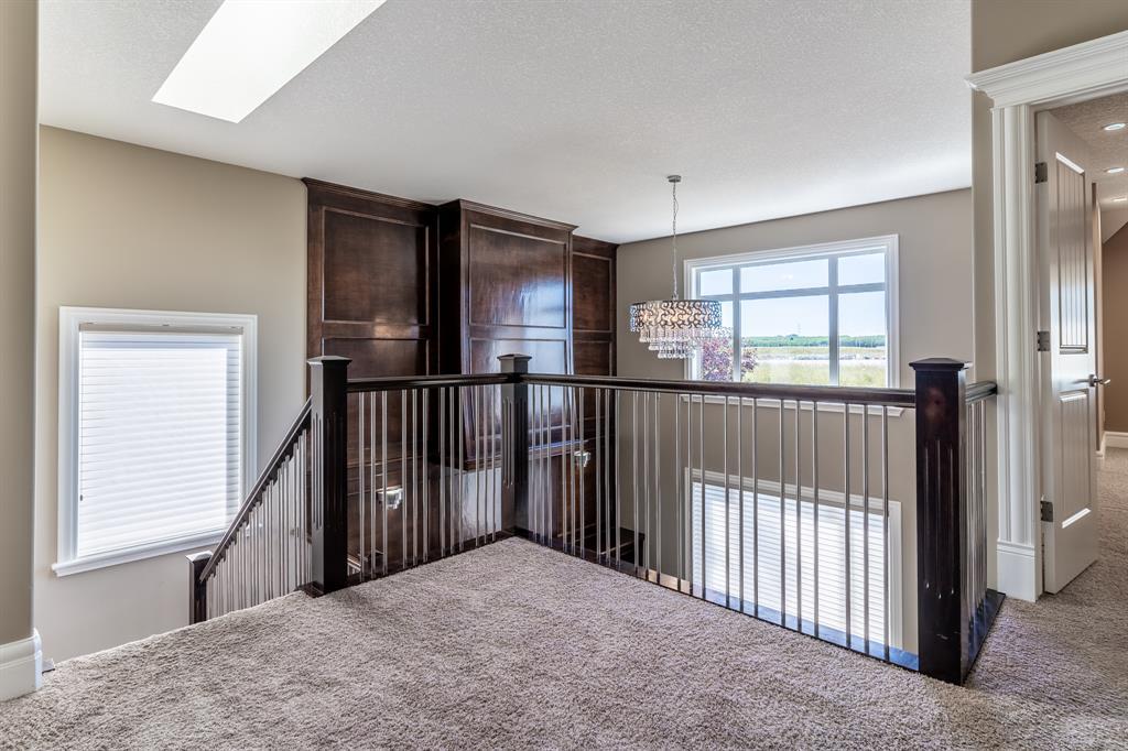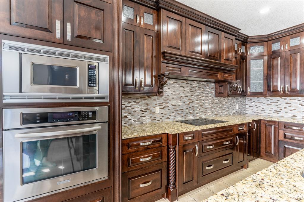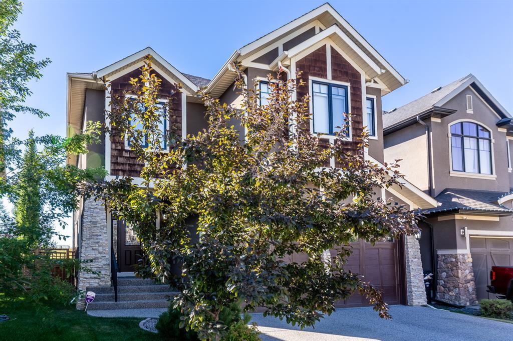 Welcome to your stunning new estate home located in the sought-after Wentworth Hill SW neighborhood. The exterior of the house is truly impressive, with stone pillars, metal clad Low-E windows, and an exposed aggregate driveway that leads to your twin door double garage. This spacious home boasts 4 bedrooms and 2.5 bathrooms and was previously a show home, featuring luxurious touches throughout.Step inside, and you'll find yourself in a well-appointed space adorned with upgraded trim, baseboards, crown moulding, and custom woodworking. LED lighting and ceiling speakers are tastefully spread throughout the home, creating a welcoming ambiance. The bright and open floor plan seamlessly combines areas for relaxation, cooking, entertaining, and even working from home, thanks to the main floor study.The kitchen is a true masterpiece, with extravagant custom cabinets, beautiful granite countertops, and stainless steel appliances. A central island with a wine rack and beverage cooler adds a touch of elegance, while the tile backsplash and glass top stove with a built-in microwave and oven complete the modern look.The great room is a highlight of the home, boasting a soaring 20ft ceiling, oversized windows, and a skylight that floods the space with natural light. Hardwood floors, a chandelier, and a striking two-storey wood mantel surrounding the gas fireplace add to the grandeur.The spacious master bedroom and ensuite bathroom are a private retreat within the home. The master suite features separate double enclosed closets, his and her sinks with granite countertops, a luxurious soaker tub, and a stunning 5-faucet tile shower.Three additional bedrooms are complemented by a deluxe media room, a full bathroom with floor-to-ceiling tile, and a convenient top floor laundry room.Stepping outside, you'll discover a backyard designed for relaxation and entertainment. An oversized vinyl deck, protected by a glass railing, provides the perfect space for outdoor gathering s. A natural gas BBQ hookup is available for grilling enthusiasts, and a pergola offers a shaded area to enjoy the evening sunsets.Welcome to your new home, where luxury, style, and comfort come together in perfect harmony. (id:22211)