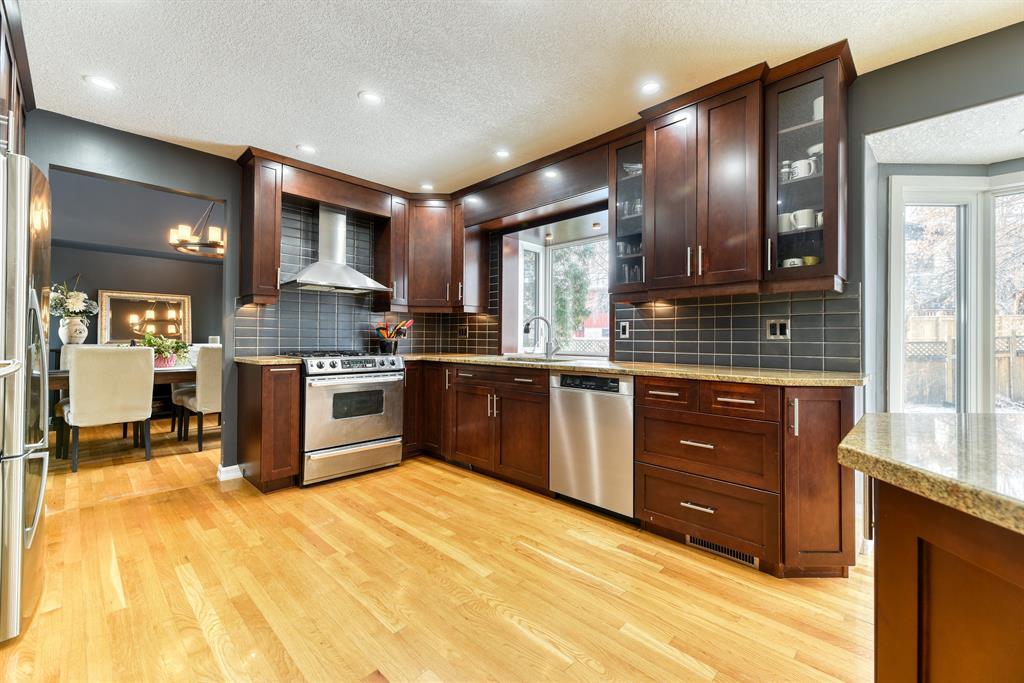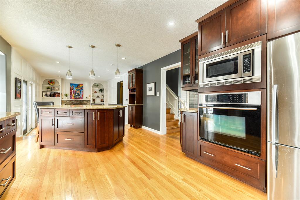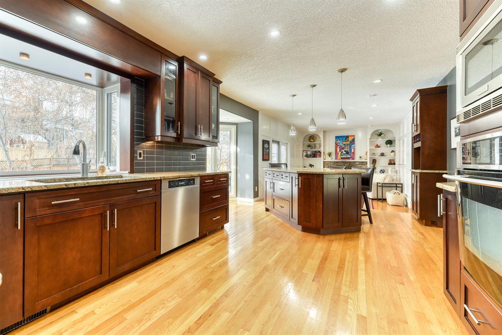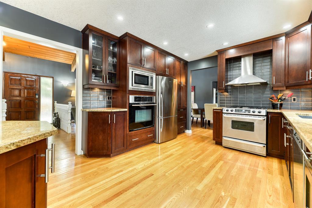 WOW! One-of-a-kind house, one-of-a-kind location, one-of-a-kind lot! Across from Oakside Park/Playground, steps from South Glenmore Park, Oakside Place Playground, and Poohe Park, in the sought-after community of Oakridge, SW Calgary! This is a sprawling 0.21 acre corner lot (9,117 SQ FT), with extraordinary outdoor living space, garden beds, and mature trees! This spectacular home boasts nearly 3,400 square feet of fully developed living space with 5 spacious bedrooms (including a main floor bedroom!), 2.5 bathrooms, extravagant renovated Chef’s kitchen, family room with soaring vaulted ceilings, living room with wood burning fireplace and patio doors that lead out to your private backyard oasis, large formal dining room, main floor laundry room with built-in cabinetry, upper floor den/office with a built in workstation, a recreation/media room, an abundance of storage, and a drywalled/insulated double attached garage! Upgrades/updates here include: newer asphalt shingles, upgraded attic insulation, renovated balcony off the primary bedroom, stainless steel kitchen appliances, granite countertops, hardwood floors (on main and upper levels!), central vacuum system, Kinetico water softener system, some newer vinyl windows, newer garage door, and some newer lighting and paint. This house has 2 furnaces and 2 hot water tanks. Close to all amenities and major roadways! Don’t miss out on this rare opportunity! Call now! (id:22211)