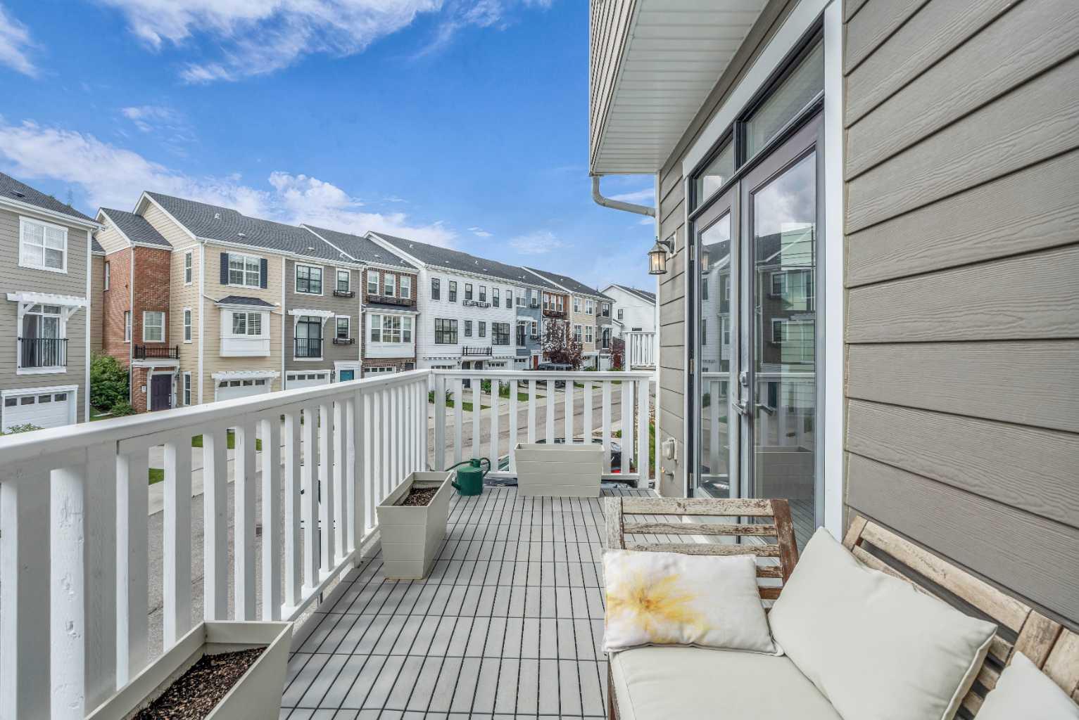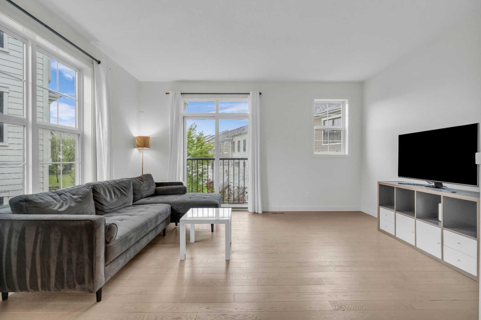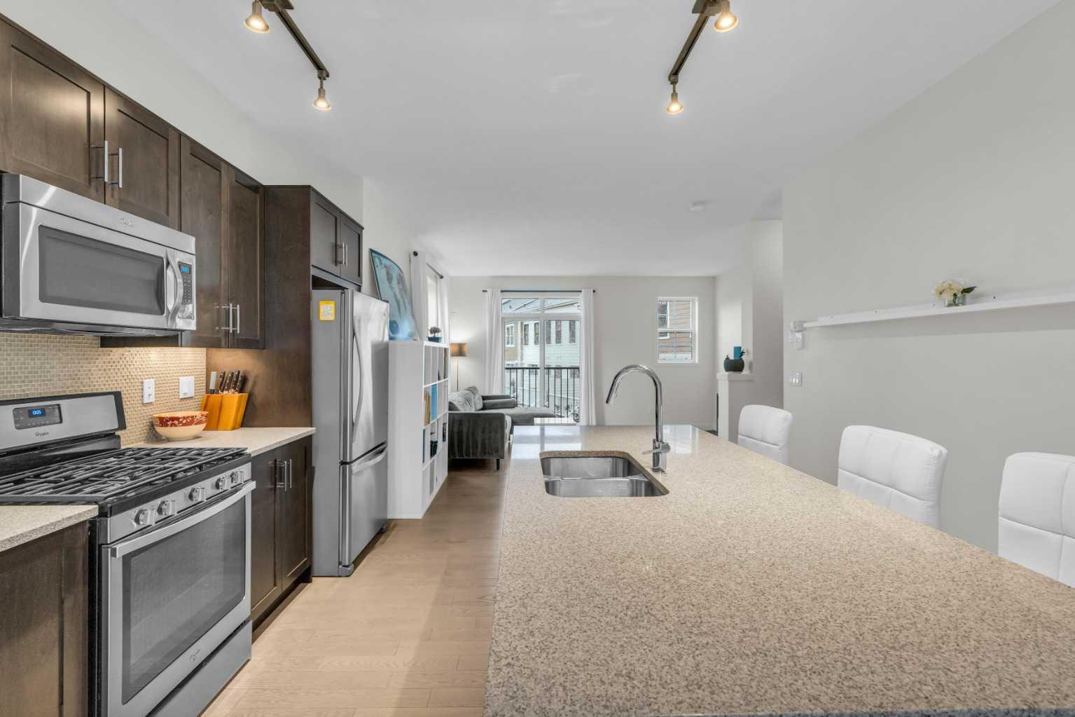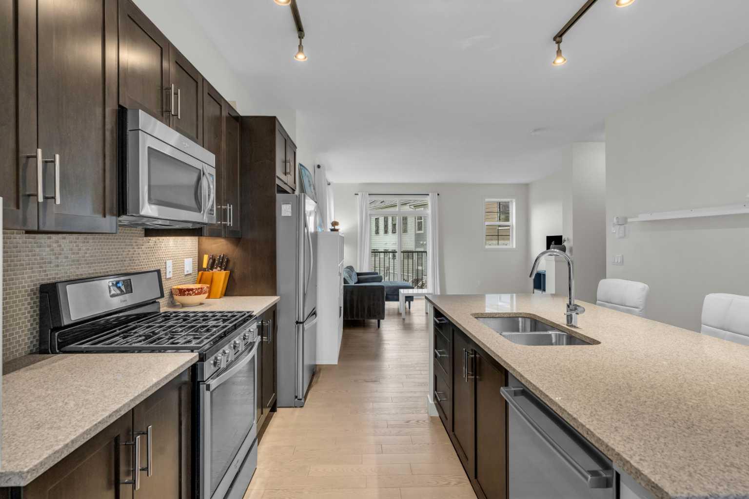 The main floor features a modern open-concept layout with 9-foot knockdown ceilings and handsome engineered hardwood flooring. The chef’s kitchen is the heart of the home, showcasing quartz countertops, a gas stove, oversized island, large walk-in pantry, and plenty of prep space for cooking and entertaining. Just off the kitchen, enjoy a spacious balcony with peaceful views of the playpark — perfect for morning coffee or evening relaxation.