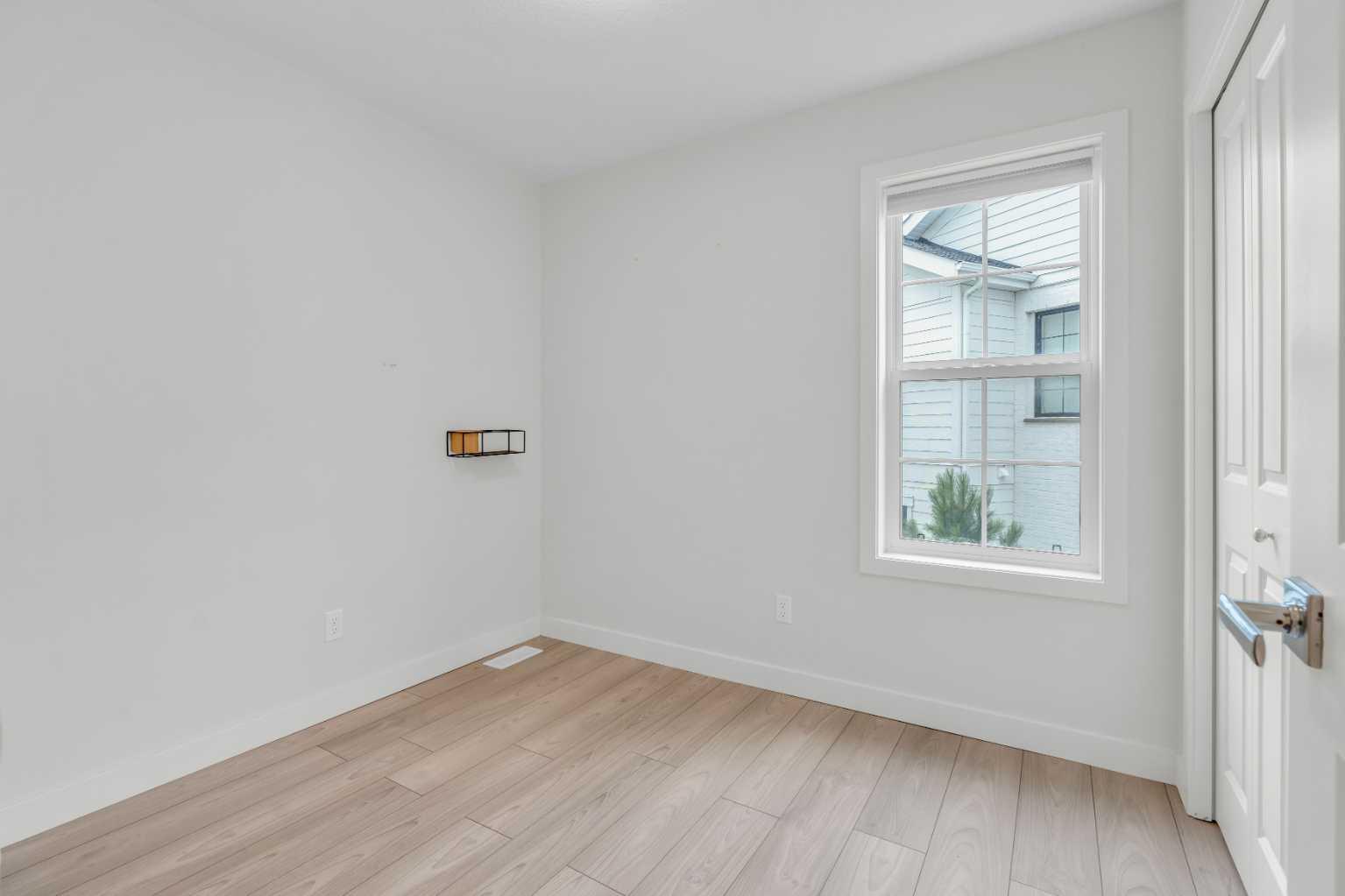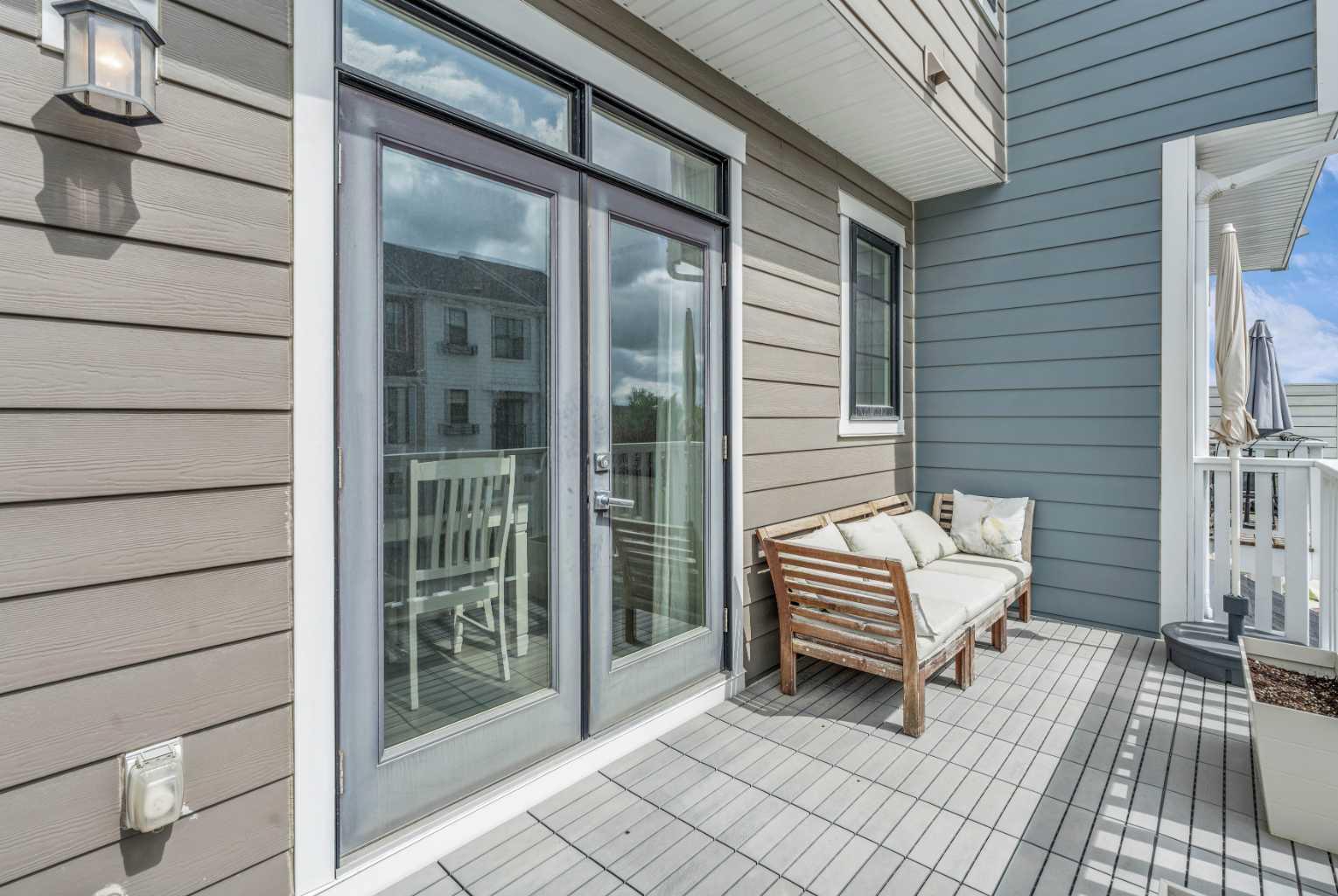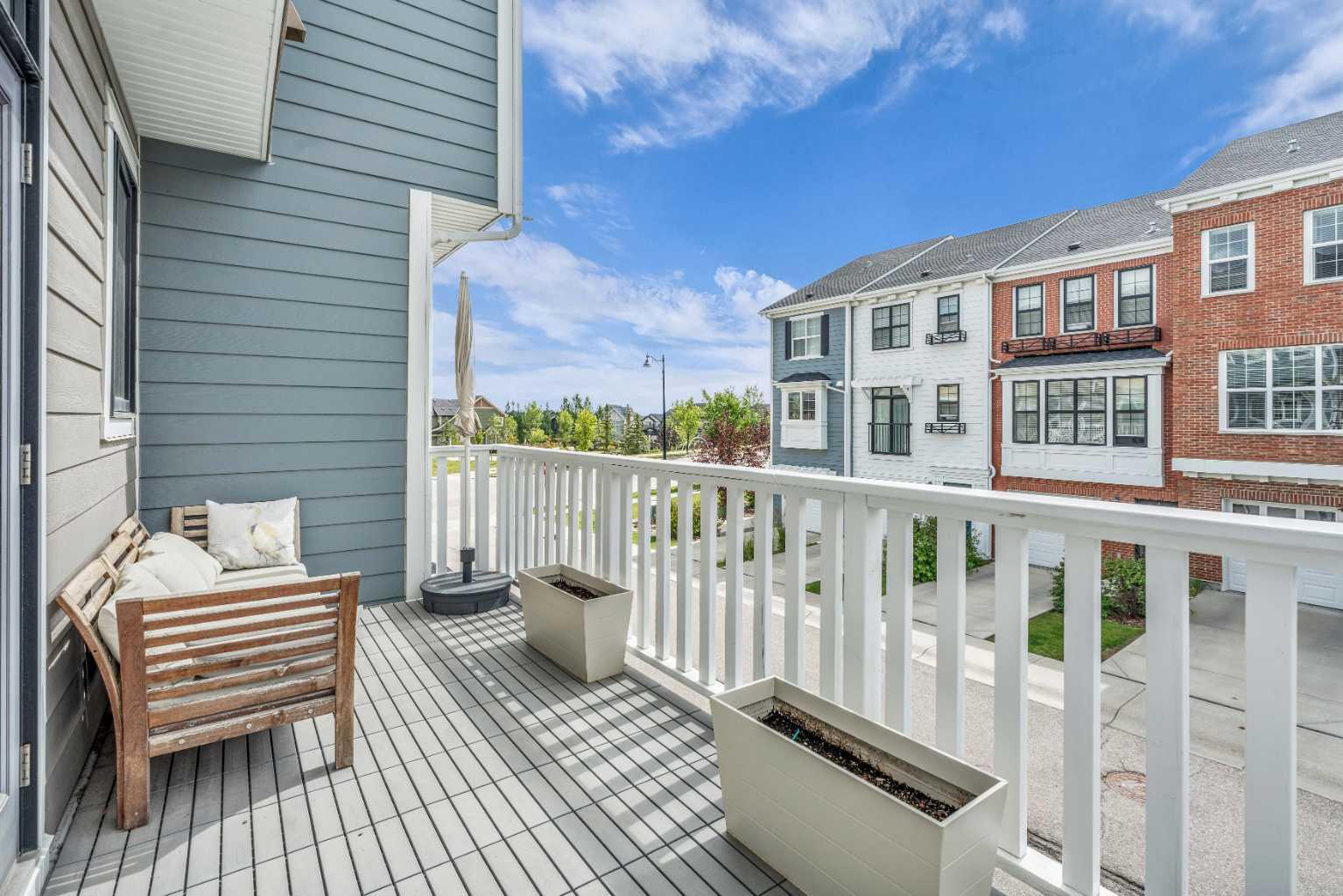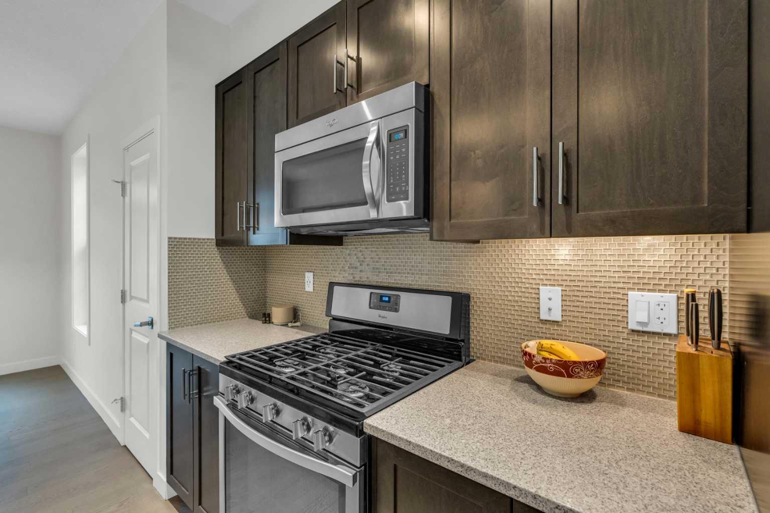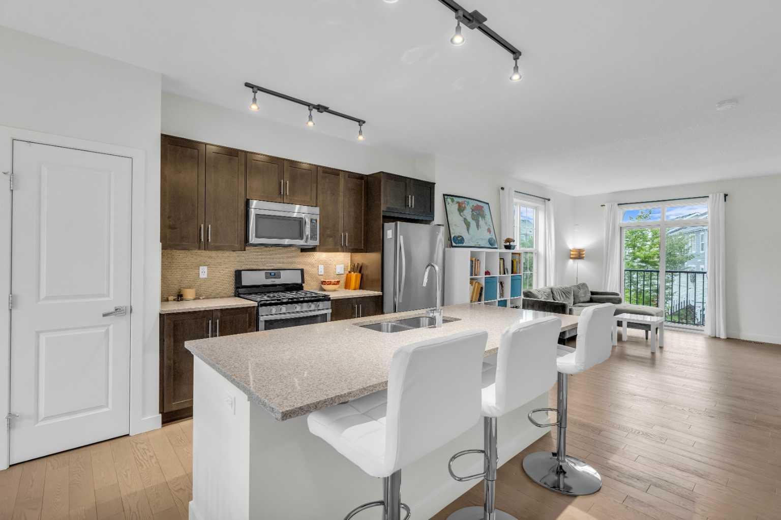The main floor features a modern open-concept layout with 9-foot knockdown ceilings and handsome engineered hardwood flooring. The chef’s kitchen is the heart of the home, showcasing quartz countertops, a gas stove, oversized island, large walk-in pantry, and plenty of prep space for cooking and entertaining. Just off the kitchen, enjoy a spacious balcony with peaceful views of the playpark — perfect for morning coffee or evening relaxation.