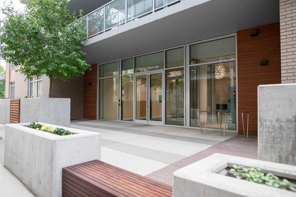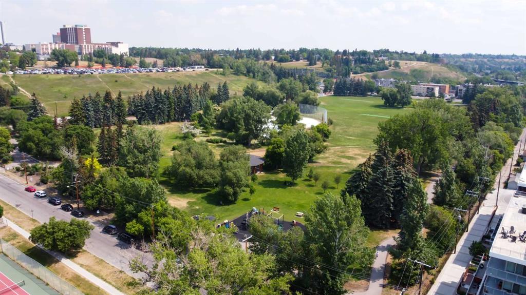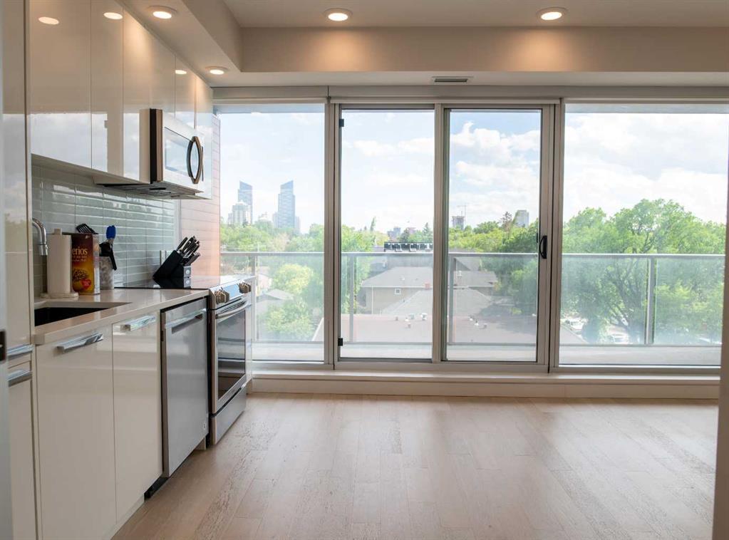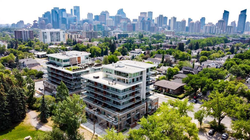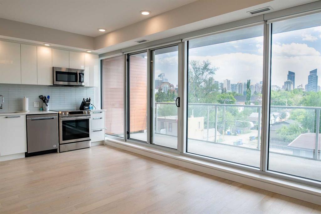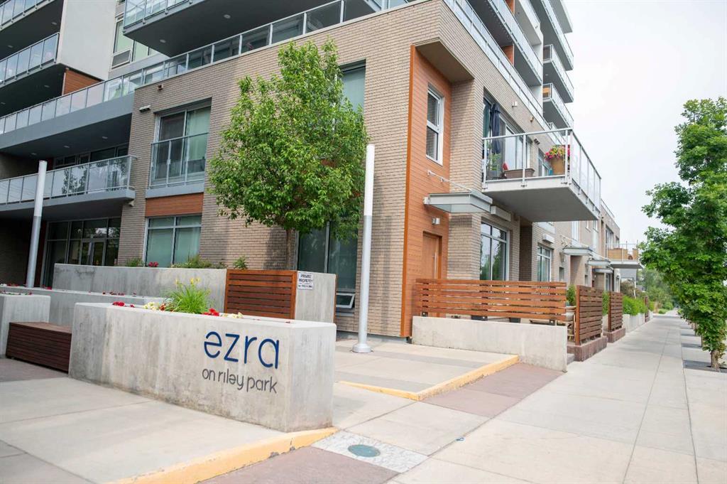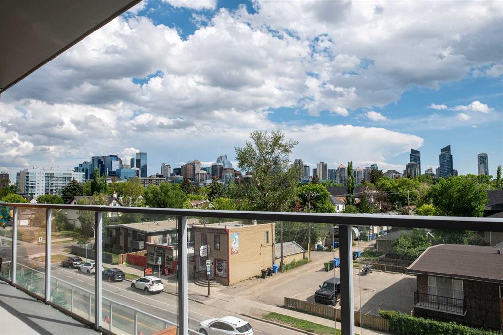 South Facing Unit, Views of Downtown, Backs onto Riley Park, Walking Distance to Kensington & Built in 2017! It doesn't get much better than this! Arguably one of the best locations in Calgary, this Hillhurst apartment is within walking distance to trendy restaurants, close to SAIT, in the heart of downtown Calgary & provides a lifestyle that can't be beat. With Riley Park as your backyard, go with the flow & make everyday different by enjoying the various amounts of amenities outside your doorstep. This 4th floor unit is conveniently located right across from the elevators, enabling quick an easy access in & out of the building. The unit itself is pretty much brand new & features quality upgrades that creates a premium feel. These upgrades include: Quartz countertops, Luxury vinyl flooring, European style built-in Refrigerator & Freezer, Air conditioning, Fully tiled shower, Tons of recessed lighting & much more! The galley kitchen is positioned along the back wall next to the primary bedroom; Both spaces provide ample storage & can efficiently be used. While this well utilized layout with 9 Ft ceilings (in the living room) is something to be admired, the most extravagant element to this apartment is the full wall of windows that are facing south, focused towards the DT Calgary skyline! This south facing large balcony (6'6" x 20'10") is equipped with a gas line, so you can BBQ & soak up the sun with a view! There is an end of row titled parking stall, an assigned storage locker & underground bike storage that follows with the unit. The West EZRA building has a gym located on the 2nd floor, while the East EZRA building has a Lounge/Party room that is included with your condo fees. Come take a look to appreciate this awesome unit! (id:22211)
