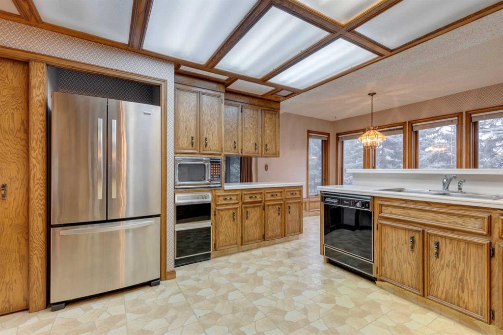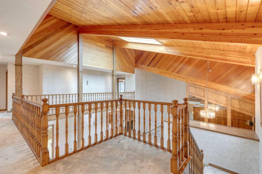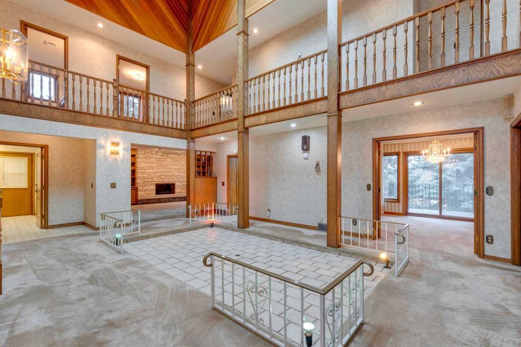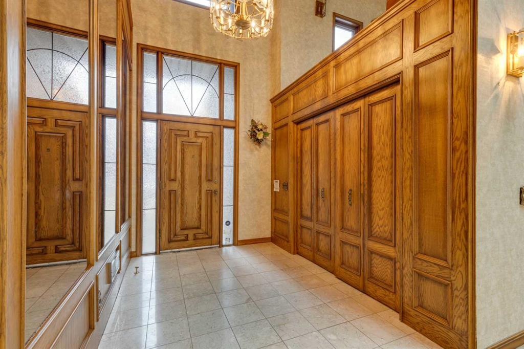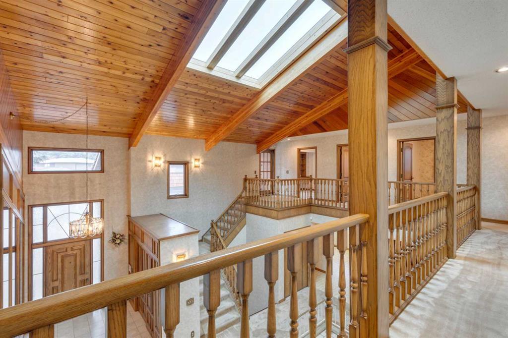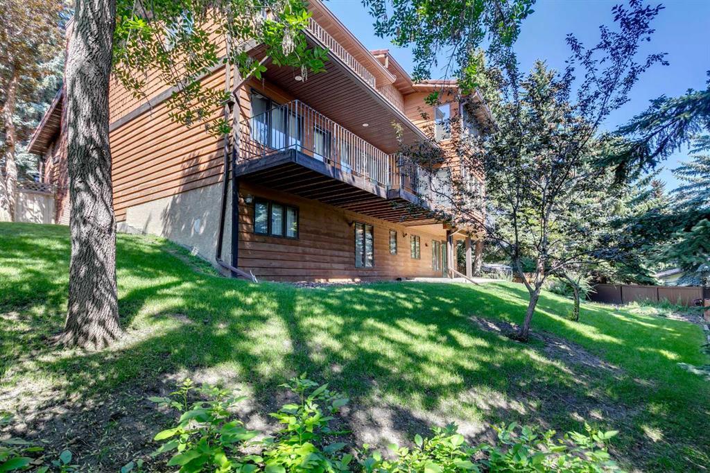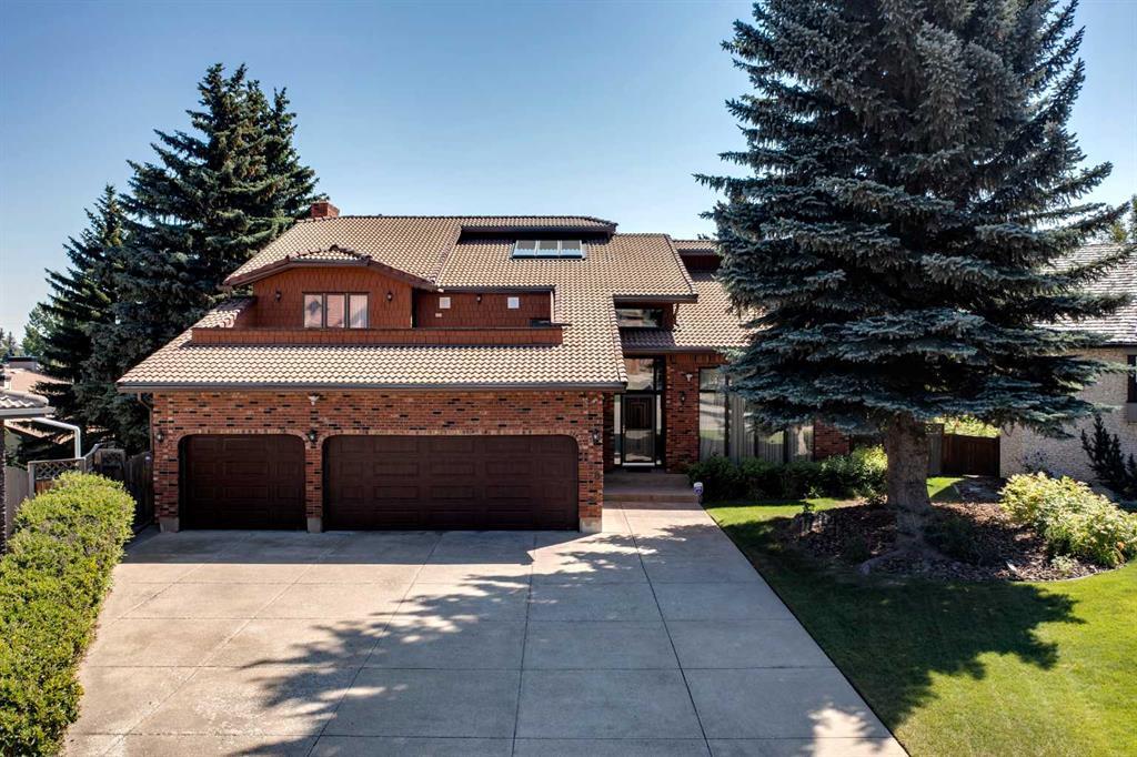 Located on a quiet cul-de-sac in the exclusive community of Coach Manor Estates, this custom built home is being offered for sale for the first time! Situated on an oversized pie shaped lot, and with over 5,400 sq ft of living space, this 5 bedroom, 3.5 bathroom home is ideal for growing and multigenerational families. Well built with wood plank ceilings, solid oak doors, solid wood bannisters, railings and built-in's through out. The grand foyer is the heart of the house, featuring soaring beamed ceilings, dedicated plant area with tile floor and skylights. The main level of this home is perfect for entertaining and family living. The sunken living room with wood burning fireplace makes for a great sitting room while the family room on the other side of the house provides a great space for family with a 2nd wood burning fireplace, built-in book shelves, it's own balcony and access to the kitchen and breakfast nook. There is a formal dining room with deck and kitchen access; it features a beautiful chandelier and French doors. Also on this level is a home office with built in shelves and credenza, a 2 pc bath and large laundry room. On the second level you will find the master suite with vaulted ceilings, walk-in closet, 4 pc ensuite and private balcony. Perfectly designed for family, the 3 additional bedrooms are uniform in size, 2 with balcony access. A 5 pc bath and huge study complete this level. The walk-out basement features a huge rec room with wood burning fireplace. The addition of a 5th bedroom, 3 pc bath, summer kitchen and den make this an ideal space for a live-in nanny or extended family! There is a sauna off the bathroom and 3 storage spaces. There is no lack of out door living space with 4 east facing balconies, a roof top patio over the garage and a covered patio off the rec room. The attached triple garage and large driveway ensure enough parking for everyone! Close to schools, shopping, golf and nature trails. Easy access to transit, walking paths and all amenities. Only 20 minutes to Downtown and 15 minutes to Winsport! (id:22211)