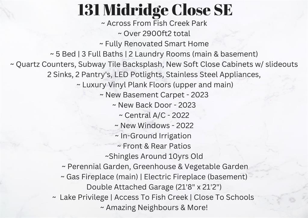We’re very proudly presenting this fully renovated, Keith Built home across from Fish Creek Park, and on an amazing street surrounded by million dollar plus estate homes! As one of only 3 Lake communities with direct access to Fish Creek, Midnapore also offers a variety of schools and the neighbouring communities offer even more. Inside and out, this home has been thoughtfully and extensively renovated which will be apparent as you step inside the sprawling, open concept, main floor plan. The huge quartz island will be the center point of the home for your family and friends for many years to come. With new shaker style cabinets and slide outs throughout the kitchen, don’t hesitate to open doors and test out the soft close slides, garbage, recycling and compost drawers have all been added. There’s also 2 big pantries and enough storage space for any busy family. All the windows have been recently replaced, new central A/C added along with two new high efficient furnaces for maximum efficiency. LED pot lights, gorgeous light fixtures and luxury vinyl plank flooring throughout the main and upper floors all you have to do is move in. This house is for an active and busy family, the main floor bathroom and laundry area was converted to make room for a 4 piece bathroom, and micro laundry room with stackable washer/dryer for the quick and easy loads. Downstairs you’ll find another full laundry room for the bigger cleans. Down here there's also brand-new carpet, electric fireplace and a 5th bedroom! The upper-level features a good-sized primary bedroom, and you’ll love your every own ensuite. The kids’ bedrooms are big as well and the upper shared bathroom was not skipped while renovating. The yard and garden are spectacular, and the pride of ownership can’t be missed. Featuring a front, fenced patio, back patio with privacy screen, stone retaining wall with walkway, vegetable garden, perennials front and back as well as a perfect little greenhouse! The house has truly h ad a complete makeover, we’d invite you to visit the last picture in the photo gallery for additional details and features. Thanks for taking the time to check out this amazing opportunity, we’d love to accommodate your showing needs! (id:22211)