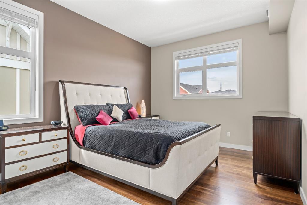 Welcome to this Air Conditioned, beautifully presented top floor end unit in the popular community of Silverado. This craftsman inspired unit is the largest in the complex and features high ceilings, fabulous open floorplan, gorgeous wide plank hardwood and tonnes of natural light. The kitchen features to the ceiling cabinets, upgraded backsplash, gas stove, stainless steel appliances, large walk in pantry and a huge island with quartz counters. Entertain in the dining area or step outside onto one of your decks and have a BBQ (this unit has 2 fabulous decks facing in opposite directions, one covered and one open, and they both have a gas line). The living room is a great place to relax after a long day, it features a beautiful fireplace with built in shelving and overlooks the front deck. The massive master bedroom has dual aspect windows, that gorgeous hardwood floor, walk through closet and a fabulous 4 piece ensuite with heated floor, large vanity with quartz counter, 2 sinks and a beautiful oversized tiled shower. There is another spacious bedroom with walk in closet and a 4 piece family bathroom. There is also a great office/bedroom #3 (just needs a closet). Completing this level is a large storage room and a laundry with stacked washer/dryer. Did I mention the double attached garage with epoxy floor? The huge entrance/hallway on the ground level has heated floors and there is a heated storage room too. This is an awesome complex and this is one of the nicest units as its on the edge of the complex, faces a quiet street so lots of extra parking and has some awesome upgrades. View 3D/Multi Media/Virtual Tour. (id:22211)