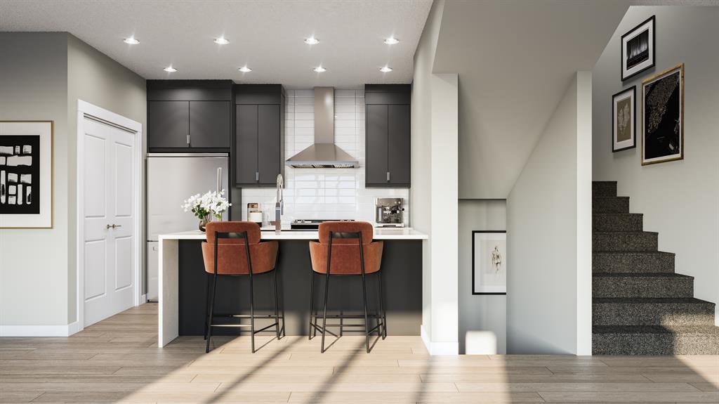 Crown Park, Calgary’s newest inner-city community combines striking architectural design and modern elegance in its professionally curated interior finishes. Set upon 13 acres of exquisite green spaces; the rolling landscape of the site influenced the design of these park-side properties allowing for panoramic views of the downtown skyline. This 3-storey city townhome has been purposefully designed throughout, offering an open concept floor plan with all the luxuries you could desire in your next home. With just over 1,300 square feet of developed space, this home features 2 bedrooms, 2.5 bathrooms, generous living areas and an oversized private attached garage. The contemporary designed home centres the living room between the kitchen and dining area creating the perfect space for entertaining guests. The home is finished with 9-foot ceilings on the main level with beautiful soft close cabinetry, stone countertops, a suite of stainless-steel appliances and Cartwright lighting package. The homes have been designed back-to-back in order to maximize space allowing an expansive main living area with a wall of west-facing windows and access to a private balcony to view the picturesque surrounding landscape. The upper level of the home offers a primary bedroom with its own en suite featuring a walk-in shower and walk-through wardrobe. A second generous sized bedroom with an additional full bathroom and upper-level laundry provide added convenience for daily living. Crown Park is one of the most coveted developments within the city due to its prominent location among the golf course, walkability to transit and easy access to the countless amenities of the downtown core. A BBQ gas line and A/C rough-in are included with this brand new home. Built by one of Calgary's most reputable builders, Brookfield Residential; owners will feel confident in their purchase with an extended builder warranty, complimentary legal services, deposit protection and a free move-in concierge. Th is property is perfect for those looking for proximity to walking trails along the Bow River, dog-friendly parks, and local hot spots for dining and entertainment. Current Promotion: FREE A/C if property is purchased before June 30th! **Please note: Photos are rendered images of the proposed property and are not an exact representation of the property for sale. Estimated Possession: Spring 2024. (id:22211)