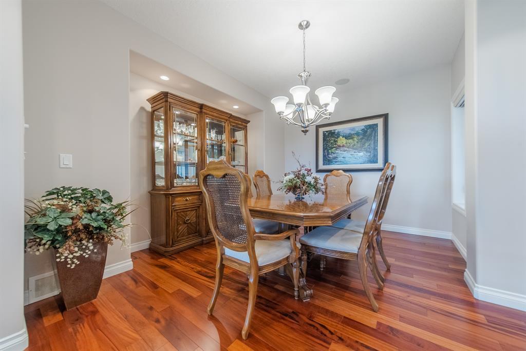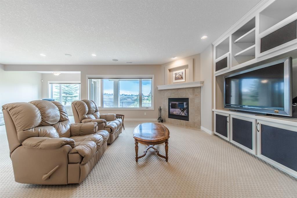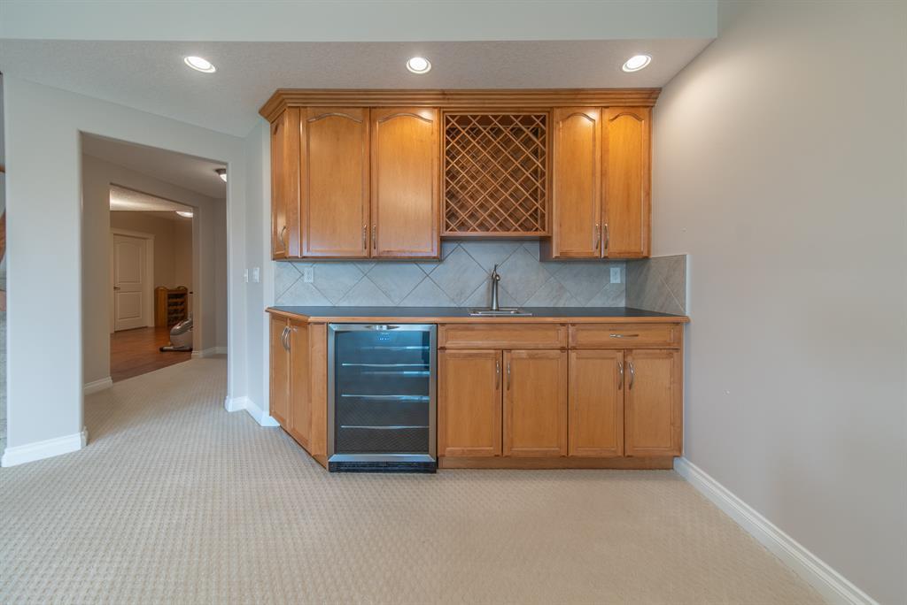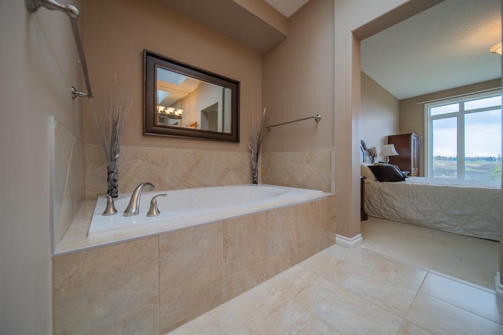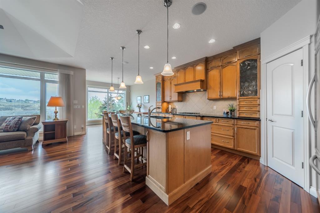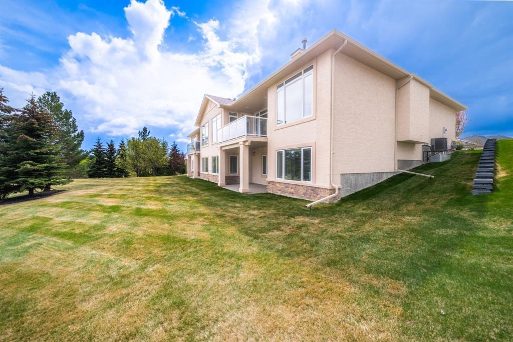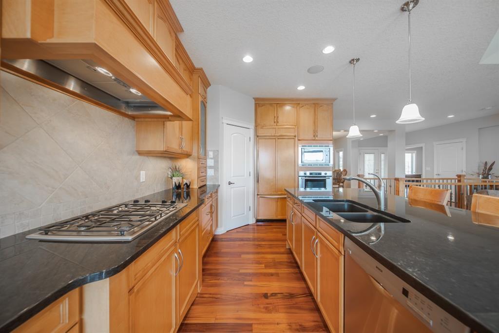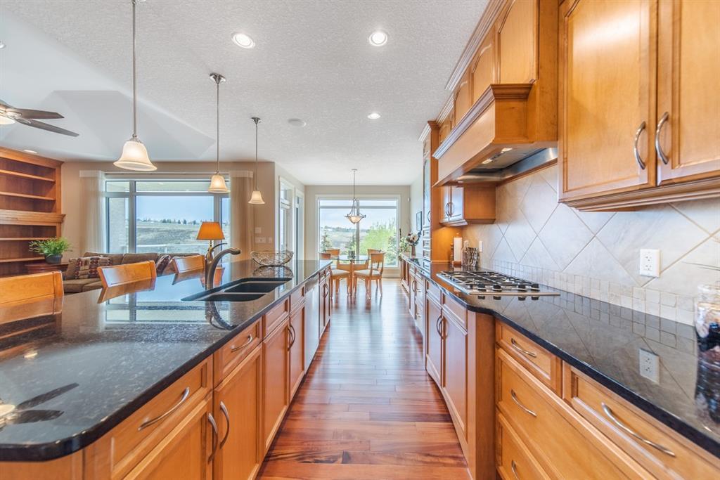 This stunning Tuscany Ravine bungalow offers a serene retreat in a picturesque setting. The property boasts three bedrooms, three and a half bathrooms, and an attached two-car garage. The interior features granite counters, built-in appliances, central air, and in-floor heating throughout the entire basement and primary bathroom. Tigerwood hardwood floors and carpeted bedrooms create a perfect balance of luxury and comfort. The living room is a cozy retreat with a fireplace and large windows, while the kitchen is a chef’s dream with Bosch built in appliances, granite counter-tops, a kitchen island, and wooden cabinets. Direct access to a large balcony off the kitchen provides a space for outdoor entertaining. A formal dining room and breakfast nook provide plenty of space for seating. The primary bedroom on the main floor offers a spacious sanctuary with a 5 pc en-suite bathroom and walk-in closet. The fully finished walk-out basement includes a large rec room with a wet bar, access to the patio, and two additional bedrooms, each with their own full bathroom and walk-in closet. The private patio and backyard oasis are perfect for relaxing or entertaining guests. The property backs onto the Tuscany Ravine, offering stunning views of the natural surroundings. Convenient amenities such as schools, parks, and supermarkets are within a 15-minute drive. This Tuscany Ravine bungalow is a serene gem, offering luxury and practicality in a peaceful neighbourhood. (id:22211)
