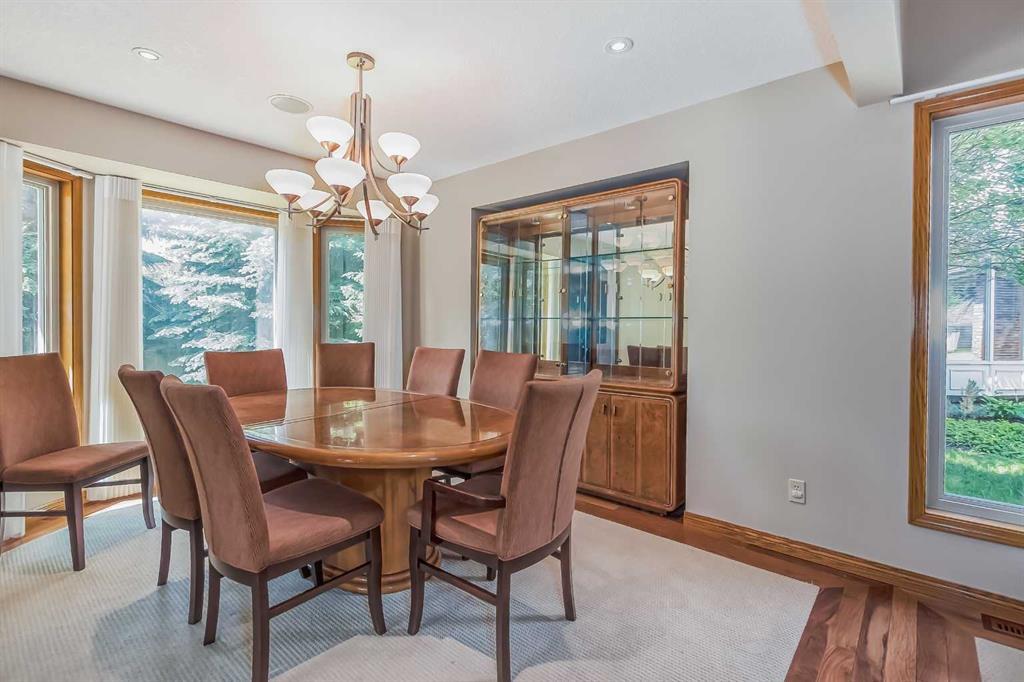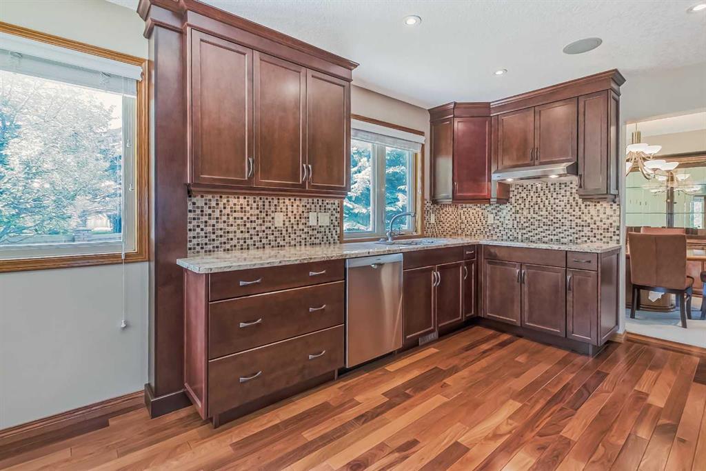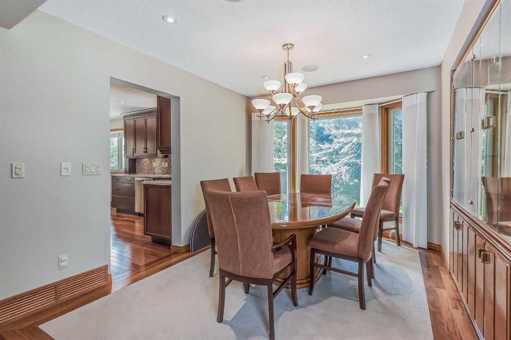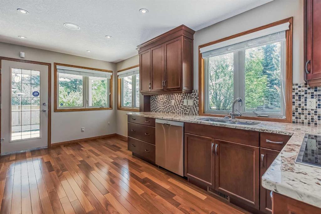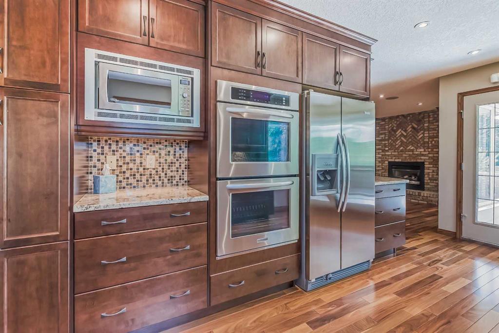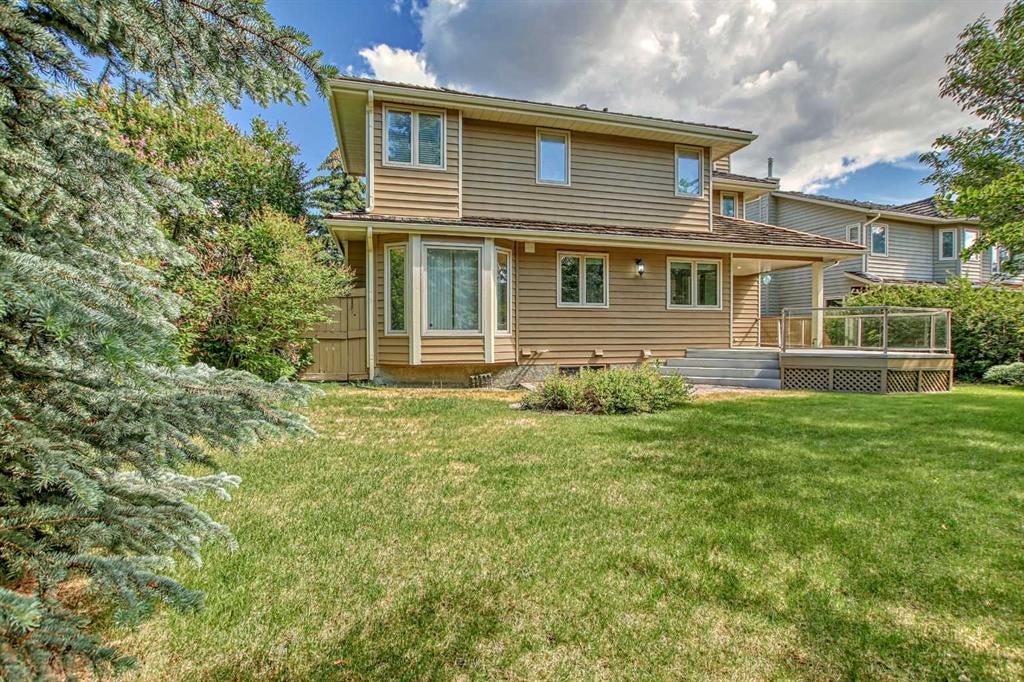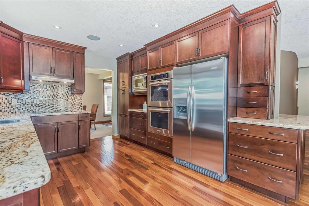 Located in a prime Oakridge Estates cul-de-sac location, this 2345 sqft, 5-bedroom home offers character and elegance. The main floor features a den with a built-in bookcases and double French door entrance, a formal living room with a vaulted ceiling and a spectacular curved wall encasing the staircase walls that overlook the living, a formal dining room with a bay window looking out to the oversized pie-shaped backyard. The kitchen has also been updated with stainless steel appliance package, granite countertops, a built-in double oven, tiled backsplash, and a separate breakfast nook. The kitchen flows into the family room, which includes a built-in bar, a gas fireplace with brick surround, and a powder room. The mudroom doubles as a laundry room and provides access to the double attached garage with additional storage space.Upstairs is a large landing and four bedrooms, including the primary bedroom with an ensuite featuring heated tile floors, a standalone glass shower, a corner soaker tub, and a walk-in closet. The upper level is completed by three additional bedrooms and a 4-piece bath with a soaker tub.The fully finished basement offers a spacious rec room with a walk-in closet for storage, an additional bedroom, and a 4-piece bath with a tub/shower combo. The basement also includes a utility room that doubles as a massive storage room with a workbench and shelving.The south-facing pie-shaped backyard is a true oasis with mature trees, a large covered deck with DURADEK flooring, a gas line hookup, and ample green space for yard games. Additional features of the home include central air conditioning, an irrigation system, serviced furnaces, a new soft water tank, and two water heaters in excellent condition. The property's location offers proximity to South Glenmore Park, shopping centers, schools, pathways, and easy access to the new ring road. (id:22211)