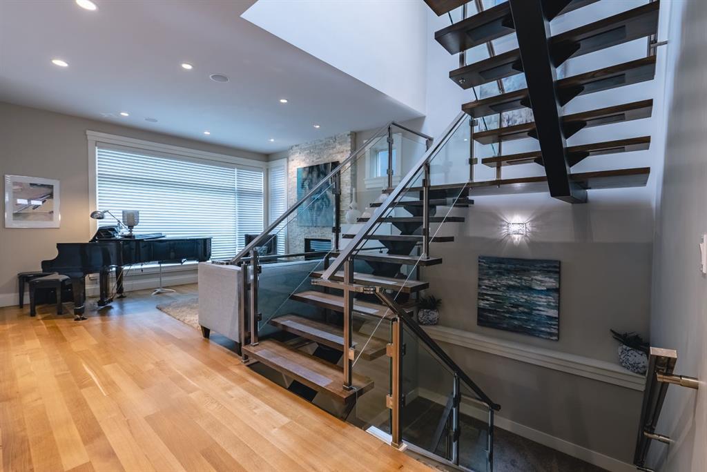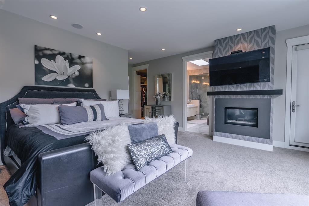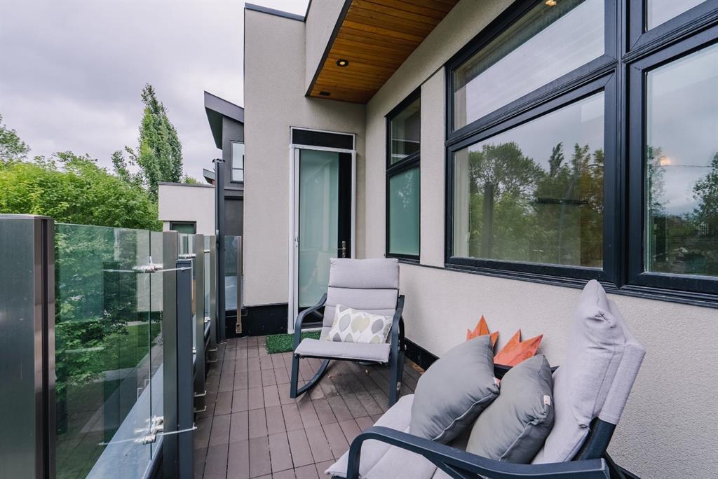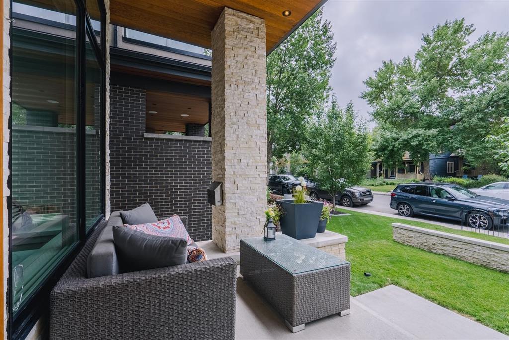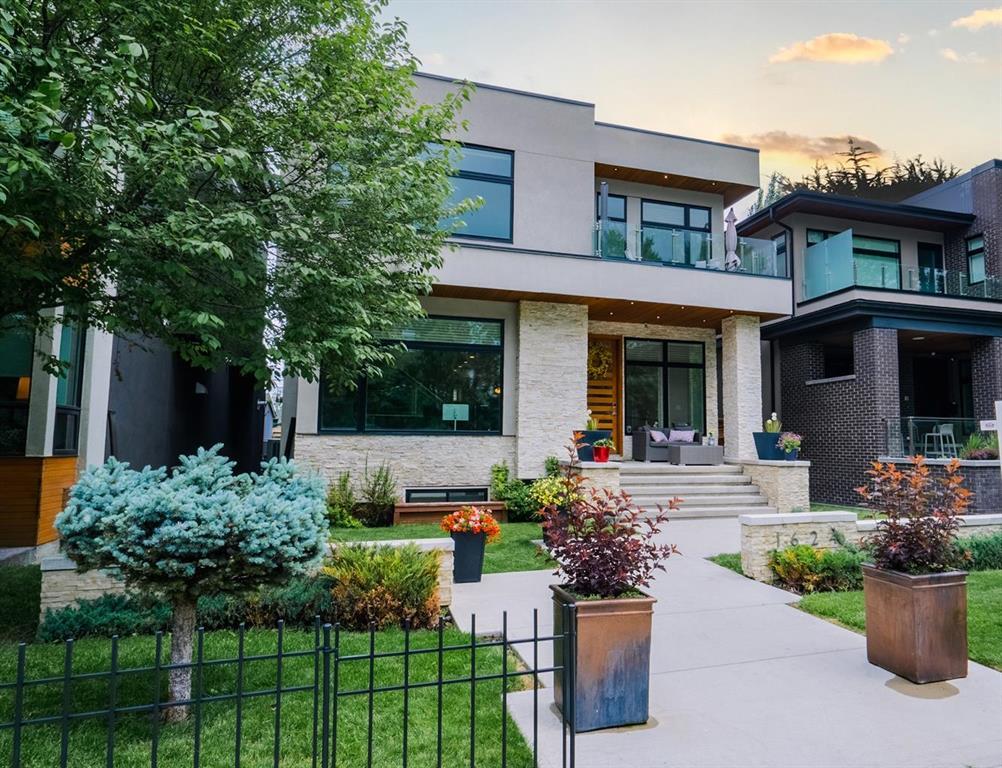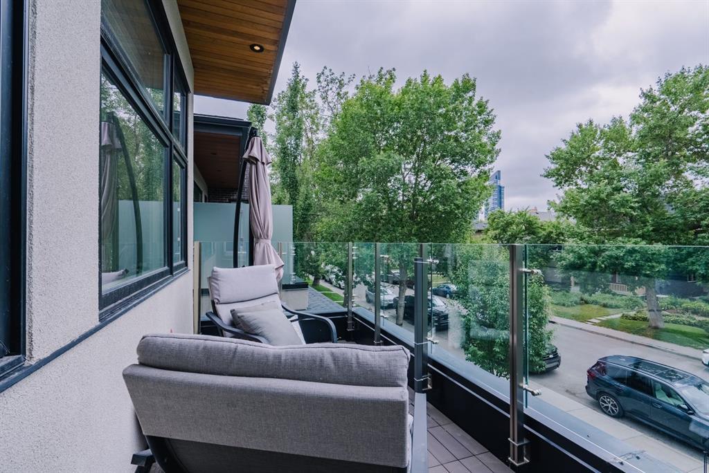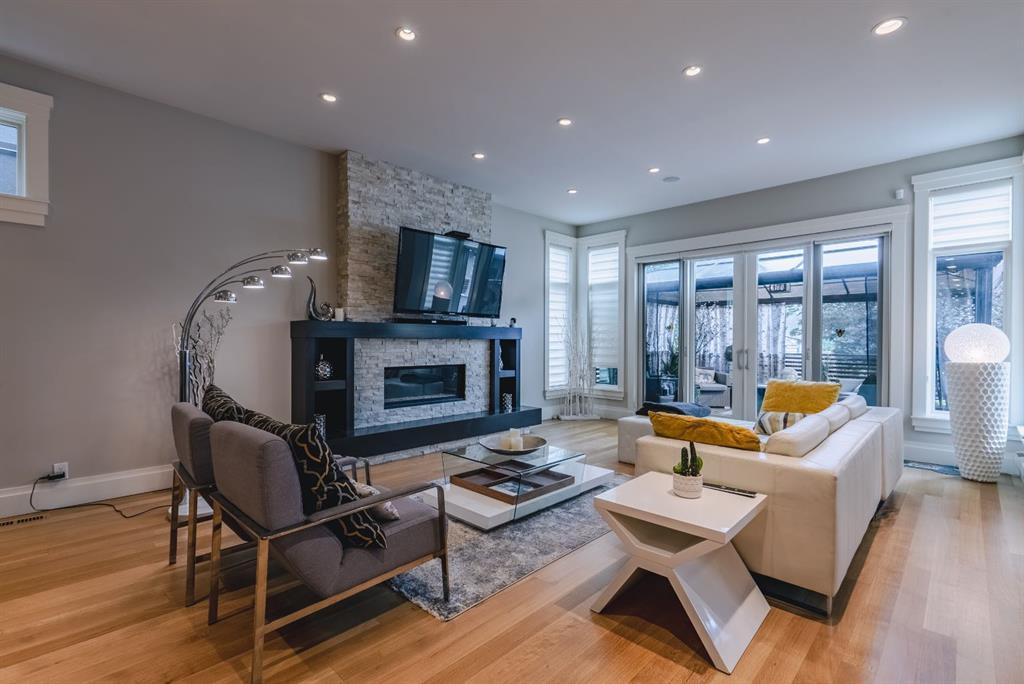 Immaculate West Coast modern home located on an oversized 37.5' x 125' lot in desirable Hillhurst. This home will leave a lasting impression as you walk up the beautifully manicured lot and into a warm and inviting foyer where you'll instantly notice 10' ceilings, impeccable white oak hardwood floors, and clean contemporary lines throughout. A front formal living room is adorned by the south sun and is anchored by a stone surround gas fireplace. The main living space is an open floor plan with a dining area, family room with another gas fireplace and built-ins and an executive kitchen with with a large island with raised breakfast bar and wine fridge, granite & quartz counters, designer styled kitchen cupboards, and high-end appliances including Subzero fridge, and Wolf microwave and gas range. Open riser stairs with glass rails lead up to a bright upper level showcasing 9' ceilings, skylights, convenient laundry, full bath, and 4 generous bedrooms. The primary retreat is a tranquil setting with ample windows, private balcony, gas fireplace, and a luxurious 6pc ensuite with in-floor heat, steam shower and soaker tub. Accessible from the ensuite if the large walk-in closet with custom shelving. The fully developed lower presents in-floor heating, a fifth bedroom and den that can ideally function as a home gym or office. Families will love the large games area and gathering for movies in the media room with projector and screen. A large wet bar with centre island is perfect for storing beverages and making popcorn. The backyard retreat is a serene oasis with a covered gazebo over the deck for privacy, beautiful yard for kids to play and heated double detached garage. Live an amazing urban lifestyle on a quiet tree-lined cul-de-sac within steps of the city's best bike paths, walking distance to downtown, and close to the trendy shops & cafes of Kensington. Welcome home! (id:22211)