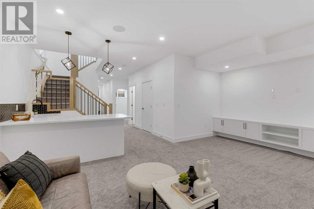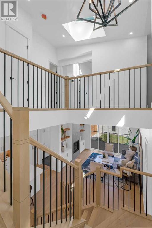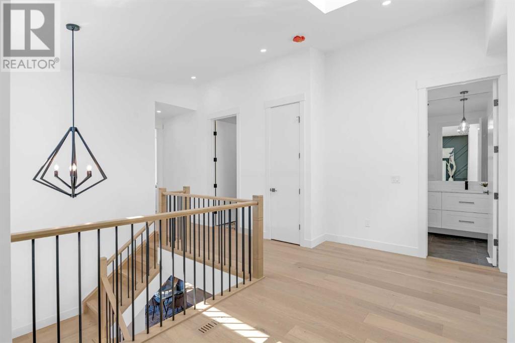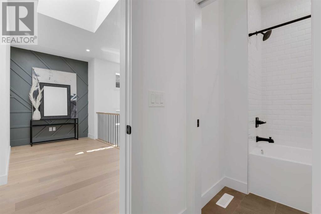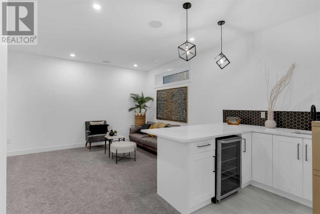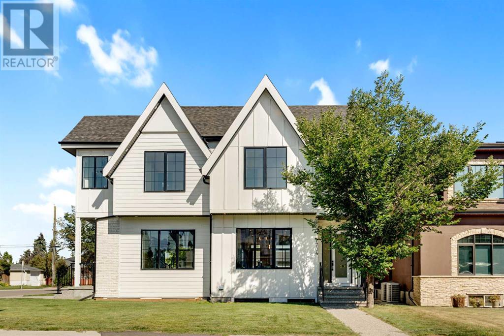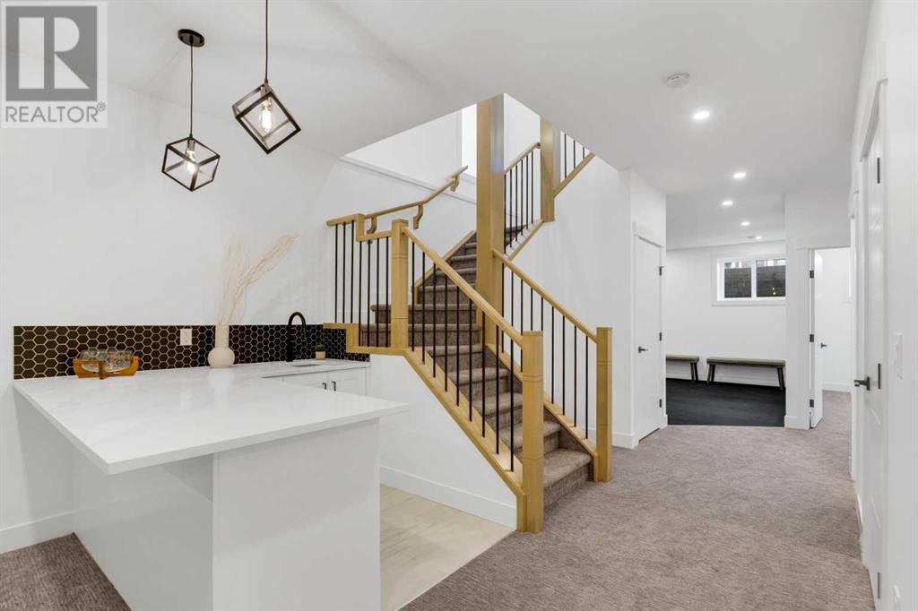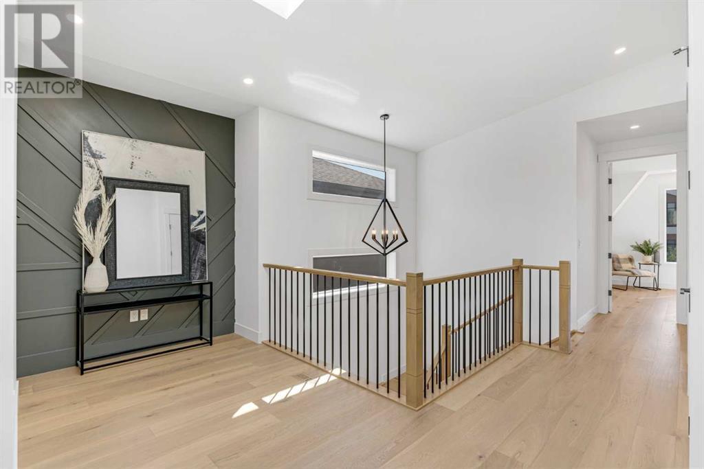 Ideally situated on a CORNER LOT in SHAGANAPPI is this MOVE-IN READY 2-storey semi-detached infill w/ 4 beds, 2,700+ square feet of living space, wide-plank engineered hardwood floors on all levels, a skylight, bonus room, vaulted ceilings, home gym, & designer lighting throughout! The community itself has endless activities & the best that inner-city living offers, including community rinks, nature walks, playgrounds, schools, & of course, the Shaganappi Point Golf Course. Shaganappi is one of the oldest communities in Calgary – it’s friendly, outdoorsy yet close to the city, & there’s always a lot going on! Back at home, step inside onto the tile flooring & notice the coat closet, perfect for organizing & keeping a tidy foyer, w/ direct access to the 2-pc powder room – privately tucked away from the main living area! Making your way into the main level, you’re welcomed into the formal dining room w/ large windows & a striking, modern feature wall highlighted by the designer chandelier above. Follow the wide plank-engineered hardwood floors into the kitchen, complete w/ an oversized island w/ quartz countertops, a wood display nook, upgraded stainless steel appliances, & timeless herringbone backsplash. A gas range offers an excellent cooking environment, while the extensive shaker-style cabinetry & pantry offer tons of storage space. A walkthrough rear mudroom w/ full-height lockers & built-in bench w/ hooks makes unloading kids & groceries highly convenient, & the large sunny living room enjoys an inset gas fireplace w/ full-height surround w/ built-ins on either side. Wood stairs w/ an open spindle railing lead upstairs into a sizeable vaulted bonus area w/ skylight & feature wall, a perfect area for a home office or study nook. The primary bedroom draws you in w/ vaulted ceilings & a large window. This little oasis has a large walk-in closet & a luxurious 5-piece ensuite equipped w/ a deep soaker tub, a dual vanity, quartz countertop, a fully tiled walk-in show er w/ a 10mm glass door, & a private water closet. Two other bedrooms on this floor have closets w/ custom built-in shelves & share the main bath w/ a dual vanity & private tub/shower combo w/ a full-height tile surround. A full laundry room is complete w/ a washer & dryer, a quartz folding counter, a tile backsplash, custom cabinetry, a hanging rod, & a laundry sink. Downstairs, the fully developed basement has everything your family needs for entertaining. A large rec room comes w/ an entertainment center featuring custom built-ins, ceiling speaker rough-ins, in-floor heat, & a full wet bar w/ quartz countertop, shaker cabinets, a tile backsplash, space for a beverage fridge, & a prep sink. A fourth bedroom offers room for guests, & there’s a dedicated home gym w/ sports flooring & wall mirror! A 4-pc bath completes the space, finished w/ quartz counters, an undermount sink, & a fully tiled walk-in shower. Don't wait! Come see your new modern home today! **VISIT MULTIMEDIA LINK FOR VIDEO WALKTHROUGH!** (id:22211)