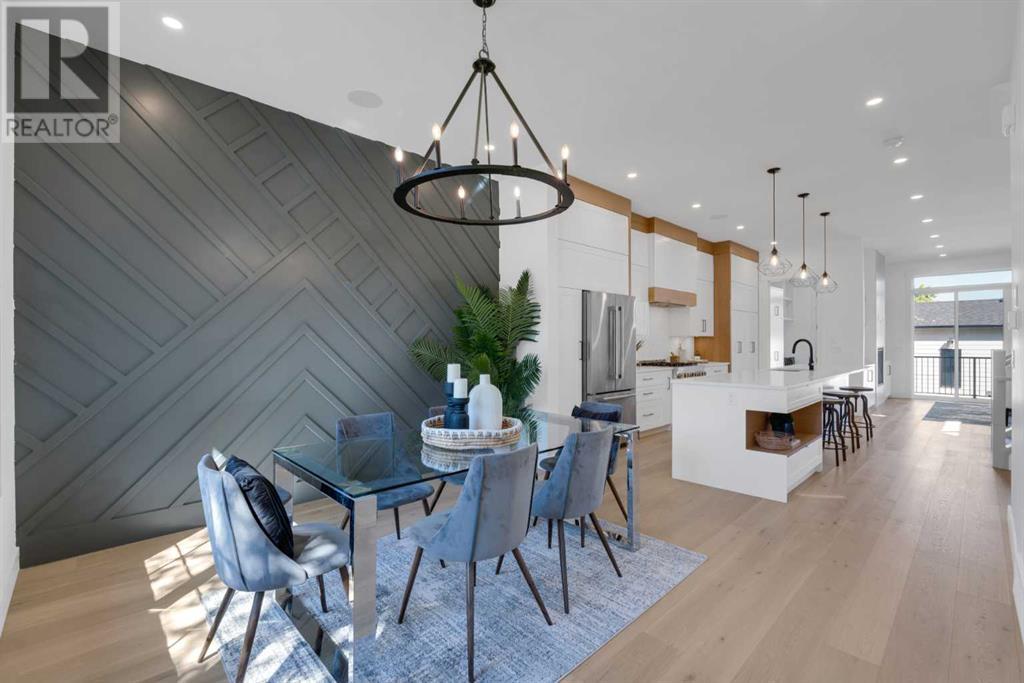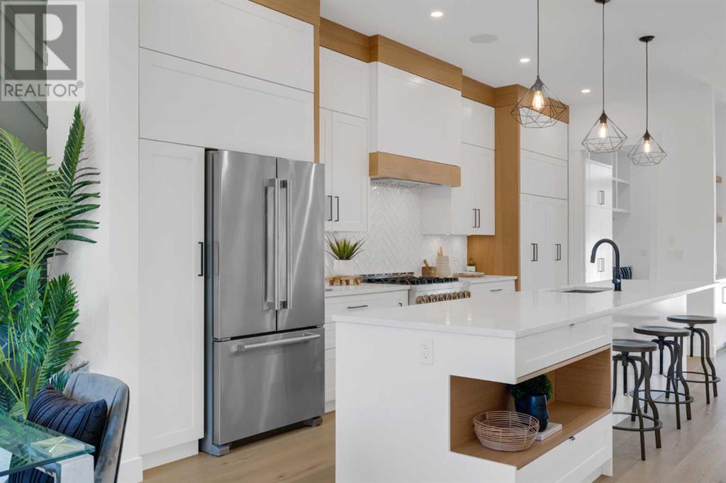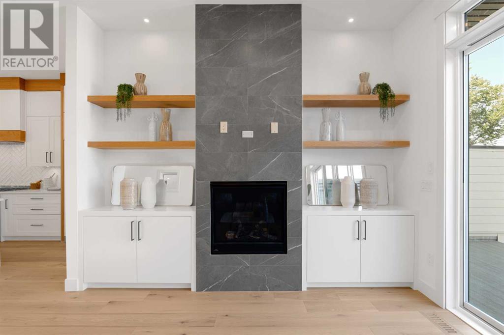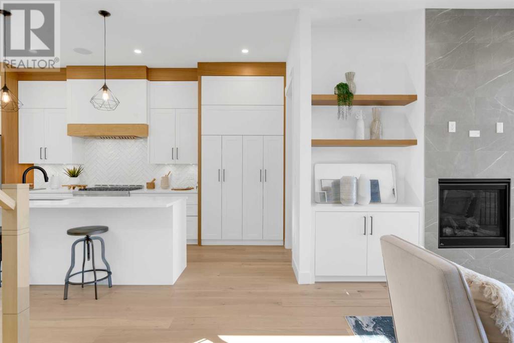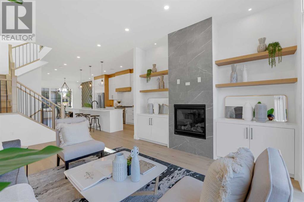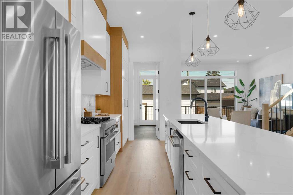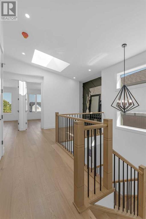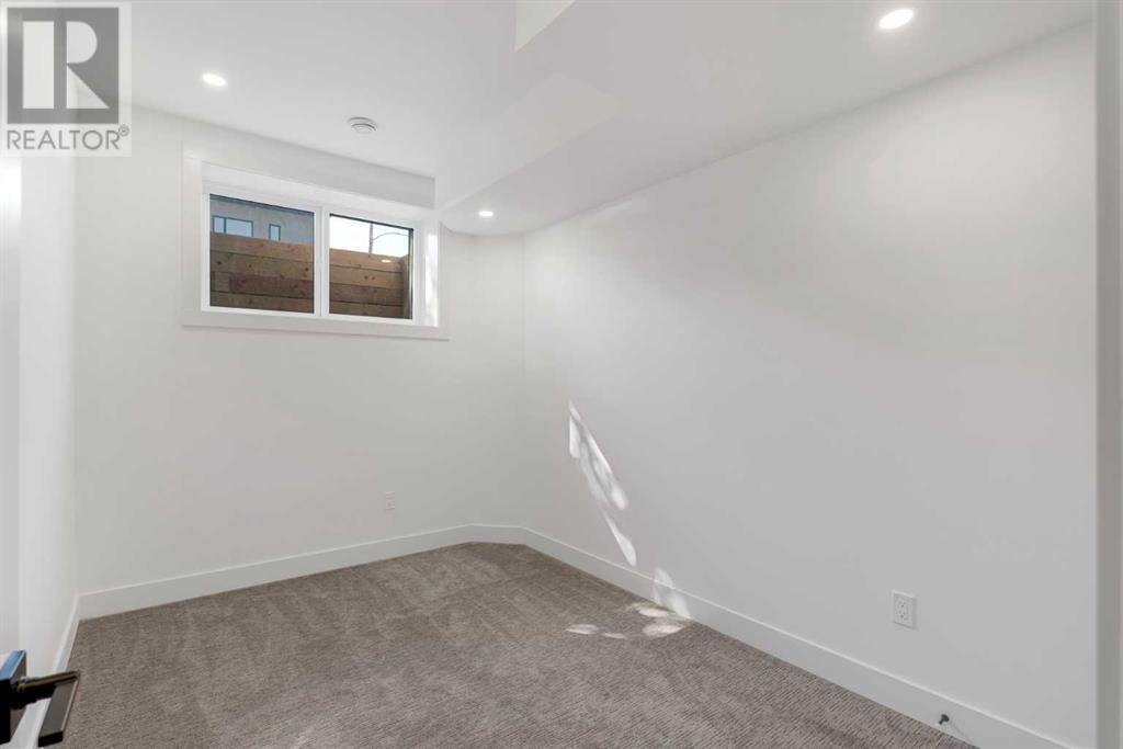 Ideally situated on a CORNER LOT in SHAGANAPPI is this MOVE-IN READY 2-storey semi-detached infill w/ 4 beds, 2,700+ square feet of living space, wide-plank engineered hardwood floors on all levels, a skylight, bonus room, vaulted ceilings, home gym, & designer lighting throughout! The community itself has endless activities & the best that inner-city living offers, including community rinks, nature walks, playgrounds, schools, & of course, the Shaganappi Point Golf Course. Shaganappi is one of the oldest communities in Calgary – it’s friendly, outdoorsy yet close to the city, & there’s always a lot going on! Back at home, step inside onto the tile flooring & notice the coat closet, perfect for organizing & keeping a tidy foyer, w/ direct access to the 2-pc powder room – privately tucked away from the main living area! Making your way into the main level, you’re welcomed into the formal dining room w/ large windows & a striking, modern feature wall highlighted by the designer chandelier above. Follow the wide plank-engineered hardwood floors into the kitchen, complete w/ an oversized island w/ quartz countertops, a wood display nook, upgraded stainless steel appliances, & timeless herringbone backsplash. A gas range offers an excellent cooking environment, while the extensive shaker-style cabinetry & pantry offer tons of storage space. A walkthrough rear mudroom w/ full-height lockers & built-in bench w/ hooks makes unloading kids & groceries highly convenient, & the large sunny living room enjoys an inset gas fireplace w/ full-height surround w/ built-ins on either side. Wood stairs w/ an open spindle railing lead upstairs into a sizeable vaulted bonus area w/ skylight & feature wall, a perfect area for a home office or study nook. The primary bedroom draws you in w/ vaulted ceilings & a large window. This little oasis has a large walk-in closet & a luxurious 5-piece ensuite equipped w/ a deep soaker tub, a dual vanity, quartz countertop, a fully tiled walk-in show er w/ a 10mm glass door, & a private water closet. Two other bedrooms on this floor have closets w/ custom built-in shelves & share the main bath w/ a dual vanity & private tub/shower combo w/ a full-height tile surround. A full laundry room is complete w/ a washer & dryer, a quartz folding counter, a tile backsplash, custom cabinetry, a hanging rod, & a laundry sink. Downstairs, the fully developed basement has everything your family needs for entertaining. A large rec room comes w/ an entertainment center featuring custom built-ins, ceiling speaker rough-ins, in-floor heat, & a full wet bar w/ quartz countertop, shaker cabinets, a tile backsplash, space for a beverage fridge, & a prep sink. A fourth bedroom offers room for guests, & there’s a dedicated home gym w/ sports flooring & wall mirror! A 4-pc bath completes the space, finished w/ quartz counters, an undermount sink, & a fully tiled walk-in shower. Don't wait! Come see your new modern home today! **VISIT MULTIMEDIA LINK FOR VIDEO WALKTHROUGH!** (id:22211)