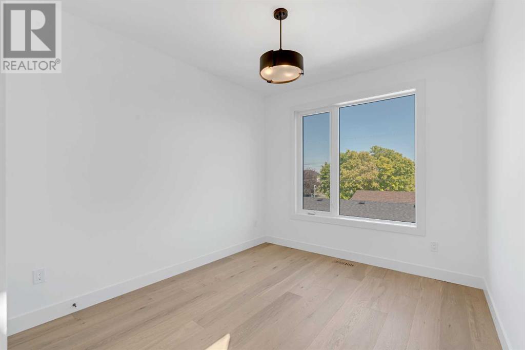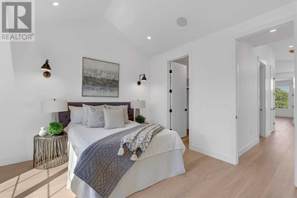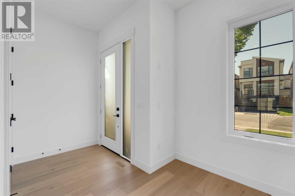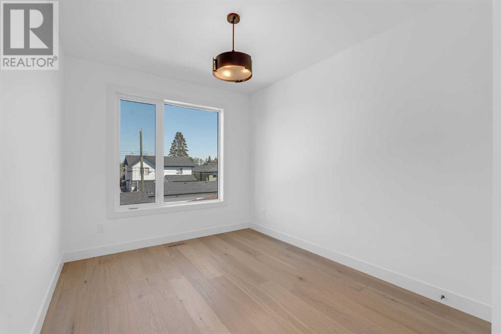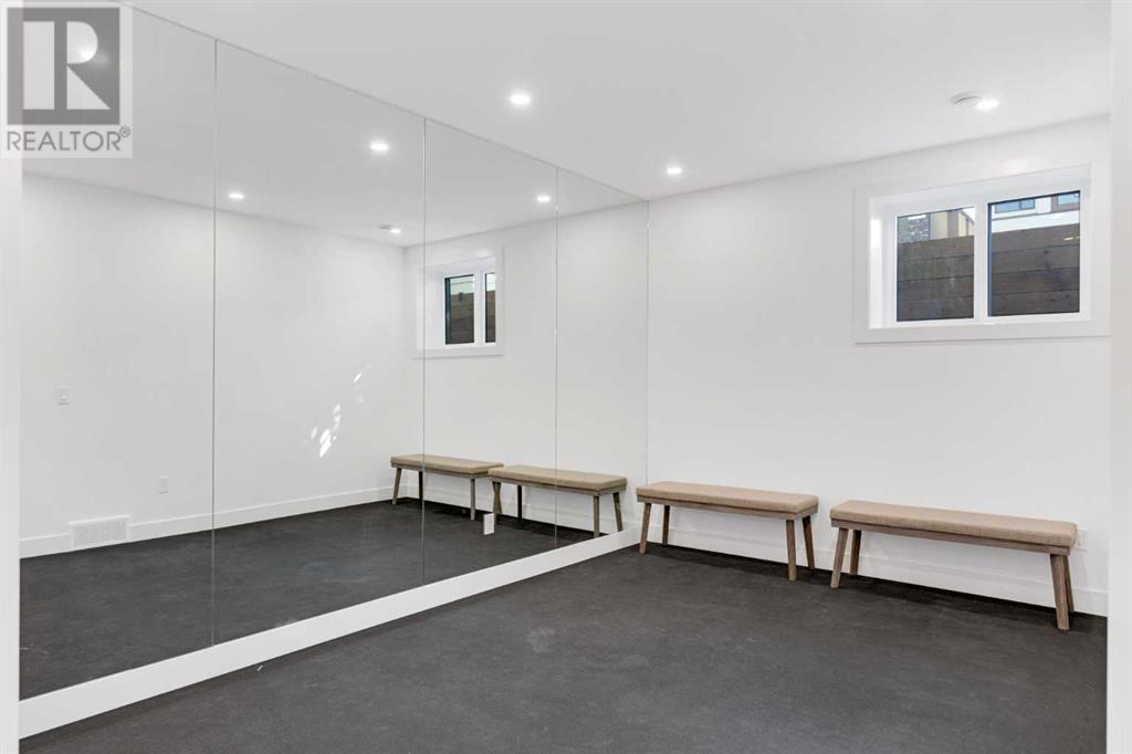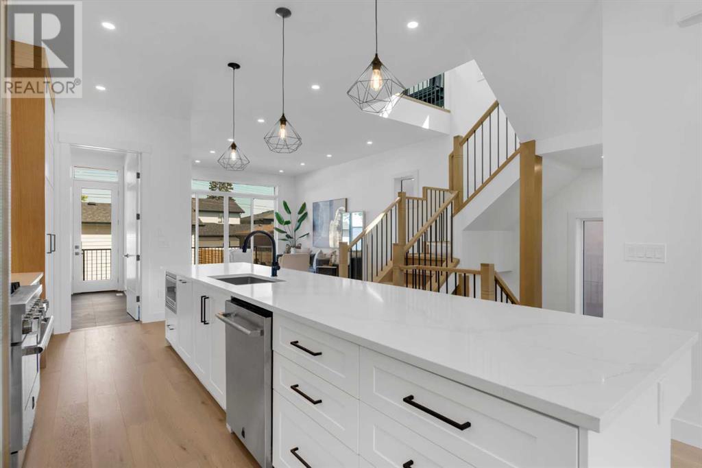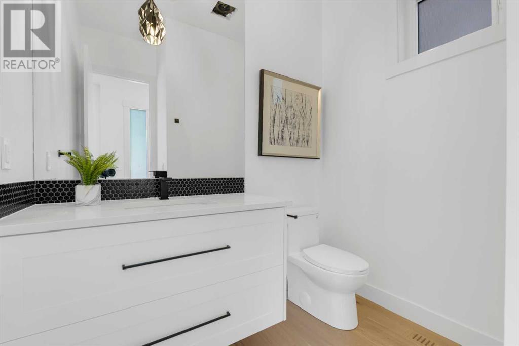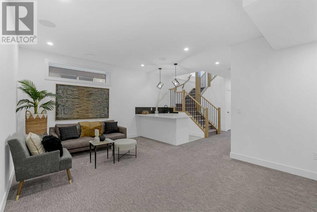Ideally situated on a CORNER LOT in SHAGANAPPI is this MOVE-IN READY 2-storey semi-detached infill w/ 4 beds, 2,700+ square feet of living space, wide-plank engineered hardwood floors on all levels, a skylight, bonus room, vaulted ceilings, home gym, & designer lighting throughout! The community itself has endless activities & the best that inner-city living offers, including community rinks, nature walks, playgrounds, schools, & of course, the Shaganappi Point Golf Course. Shaganappi is one of the oldest communities in Calgary – it’s friendly, outdoorsy yet close to the city, & there’s always a lot going on! Back at home, step inside onto the tile flooring & notice the coat closet, perfect for organizing & keeping a tidy foyer, w/ direct access to the 2-pc powder room – privately tucked away from the main living area! Making your way into the main level, you’re welcomed into the formal dining room w/ large windows & a striking, modern feature wall highlighted by the designer chandelier above. Follow the wide plank-engineered hardwood floors into the kitchen, complete w/ an oversized island w/ quartz countertops, a wood display nook, upgraded stainless steel appliances, & timeless herringbone backsplash. A gas range offers an excellent cooking environment, while the extensive shaker-style cabinetry & pantry offer tons of storage space. A walkthrough rear mudroom w/ full-height lockers & built-in bench w/ hooks makes unloading kids & groceries highly convenient, & the large sunny living room enjoys an inset gas fireplace w/ full-height surround w/ built-ins on either side. Wood stairs w/ an open spindle railing lead upstairs into a sizeable vaulted bonus area w/ skylight & feature wall, a perfect area for a home office or study nook. The primary bedroom draws you in w/ vaulted ceilings & a large window. This little oasis has a large walk-in closet & a luxurious 5-piece ensuite equipped w/ a deep soaker tub, a dual vanity, quartz countertop, a fully tiled walk-in show er w/ a 10mm glass door, & a private water closet. Two other bedrooms on this floor have closets w/ custom built-in shelves & share the main bath w/ a dual vanity & private tub/shower combo w/ a full-height tile surround. A full laundry room is complete w/ a washer & dryer, a quartz folding counter, a tile backsplash, custom cabinetry, a hanging rod, & a laundry sink. Downstairs, the fully developed basement has everything your family needs for entertaining. A large rec room comes w/ an entertainment center featuring custom built-ins, ceiling speaker rough-ins, in-floor heat, & a full wet bar w/ quartz countertop, shaker cabinets, a tile backsplash, space for a beverage fridge, & a prep sink. A fourth bedroom offers room for guests, & there’s a dedicated home gym w/ sports flooring & wall mirror! A 4-pc bath completes the space, finished w/ quartz counters, an undermount sink, & a fully tiled walk-in shower. Don't wait! Come see your new modern home today! **VISIT MULTIMEDIA LINK FOR VIDEO WALKTHROUGH!** (id:22211)