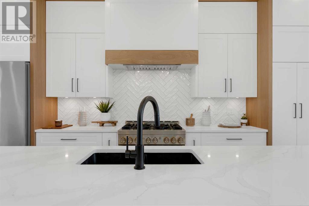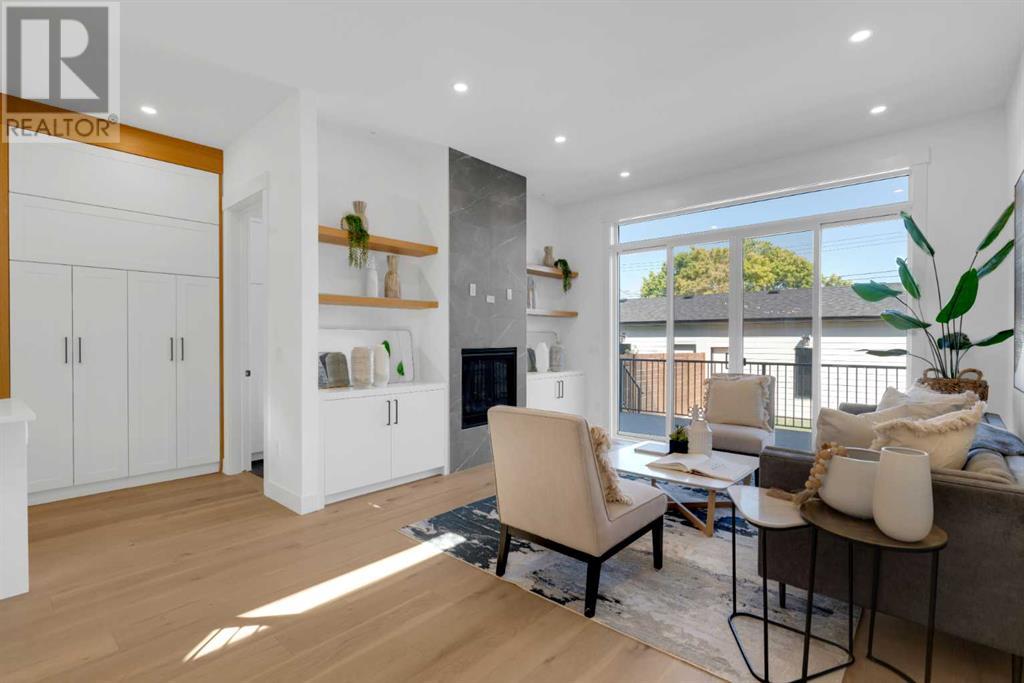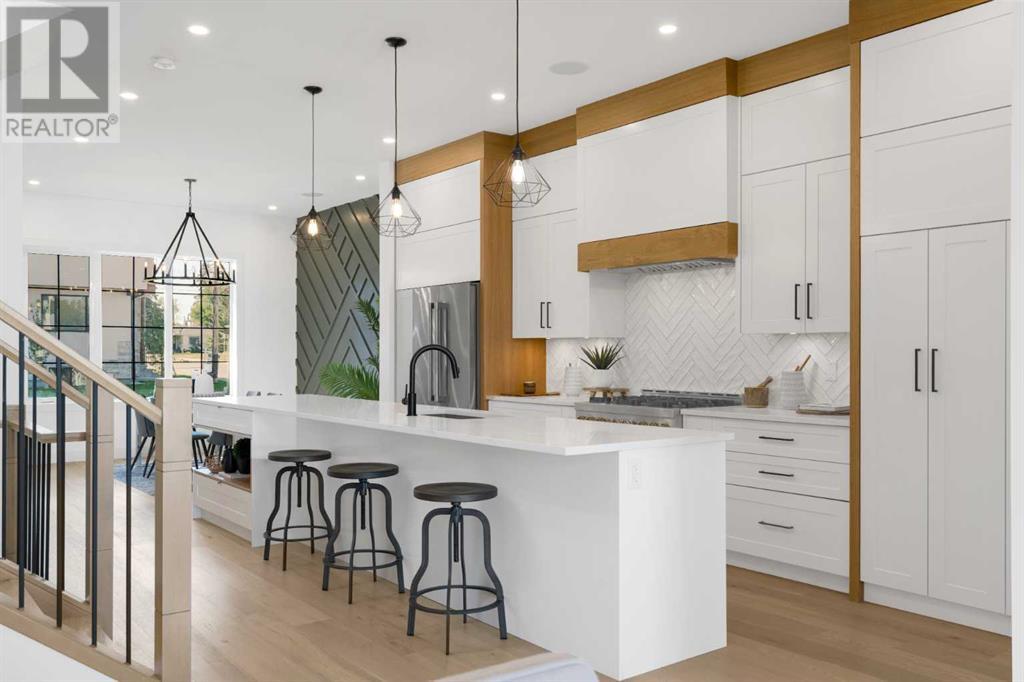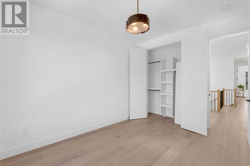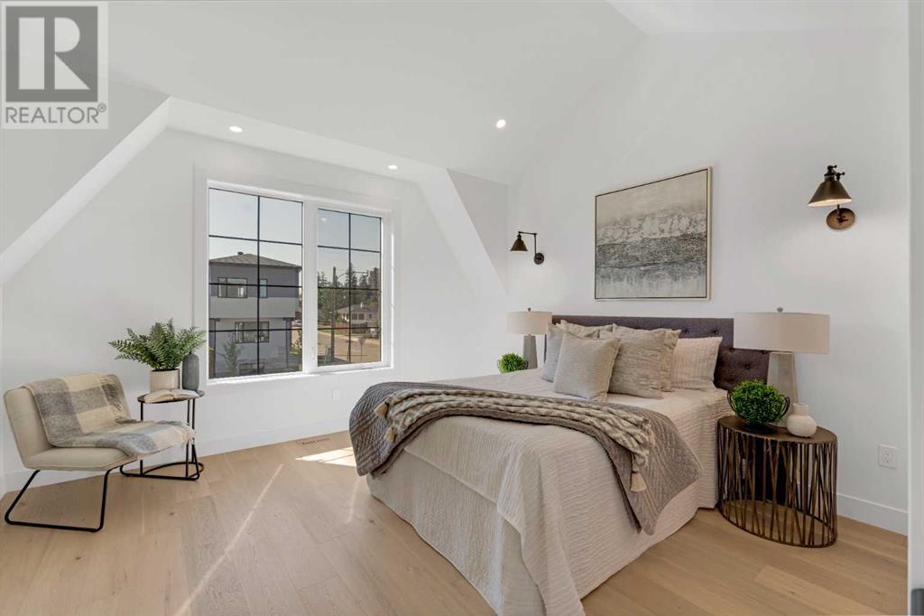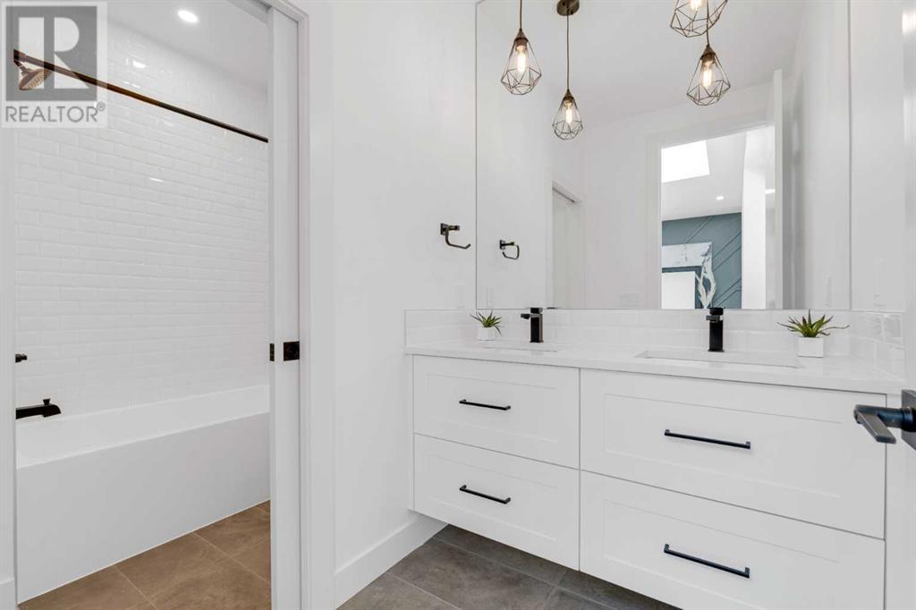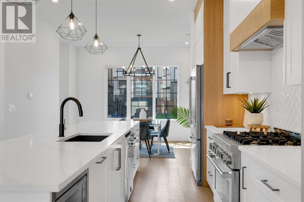 Ideally situated on a CORNER LOT in SHAGANAPPI is this MOVE-IN READY 2-storey semi-detached infill w/ 4 beds, 2,700+ square feet of living space, wide-plank engineered hardwood floors on all levels, a skylight, bonus room, vaulted ceilings, home gym, & designer lighting throughout! The community itself has endless activities & the best that inner-city living offers, including community rinks, nature walks, playgrounds, schools, & of course, the Shaganappi Point Golf Course. Shaganappi is one of the oldest communities in Calgary – it’s friendly, outdoorsy yet close to the city, & there’s always a lot going on! Back at home, step inside onto the tile flooring & notice the coat closet, perfect for organizing & keeping a tidy foyer, w/ direct access to the 2-pc powder room – privately tucked away from the main living area! Making your way into the main level, you’re welcomed into the formal dining room w/ large windows & a striking, modern feature wall highlighted by the designer chandelier above. Follow the wide plank-engineered hardwood floors into the kitchen, complete w/ an oversized island w/ quartz countertops, a wood display nook, upgraded stainless steel appliances, & timeless herringbone backsplash. A gas range offers an excellent cooking environment, while the extensive shaker-style cabinetry & pantry offer tons of storage space. A walkthrough rear mudroom w/ full-height lockers & built-in bench w/ hooks makes unloading kids & groceries highly convenient, & the large sunny living room enjoys an inset gas fireplace w/ full-height surround w/ built-ins on either side. Wood stairs w/ an open spindle railing lead upstairs into a sizeable vaulted bonus area w/ skylight & feature wall, a perfect area for a home office or study nook. The primary bedroom draws you in w/ vaulted ceilings & a large window. This little oasis has a large walk-in closet & a luxurious 5-piece ensuite equipped w/ a deep soaker tub, a dual vanity, quartz countertop, a fully tiled walk-in show er w/ a 10mm glass door, & a private water closet. Two other bedrooms on this floor have closets w/ custom built-in shelves & share the main bath w/ a dual vanity & private tub/shower combo w/ a full-height tile surround. A full laundry room is complete w/ a washer & dryer, a quartz folding counter, a tile backsplash, custom cabinetry, a hanging rod, & a laundry sink. Downstairs, the fully developed basement has everything your family needs for entertaining. A large rec room comes w/ an entertainment center featuring custom built-ins, ceiling speaker rough-ins, in-floor heat, & a full wet bar w/ quartz countertop, shaker cabinets, a tile backsplash, space for a beverage fridge, & a prep sink. A fourth bedroom offers room for guests, & there’s a dedicated home gym w/ sports flooring & wall mirror! A 4-pc bath completes the space, finished w/ quartz counters, an undermount sink, & a fully tiled walk-in shower. Don't wait! Come see your new modern home today! **VISIT MULTIMEDIA LINK FOR VIDEO WALKTHROUGH!** (id:22211)