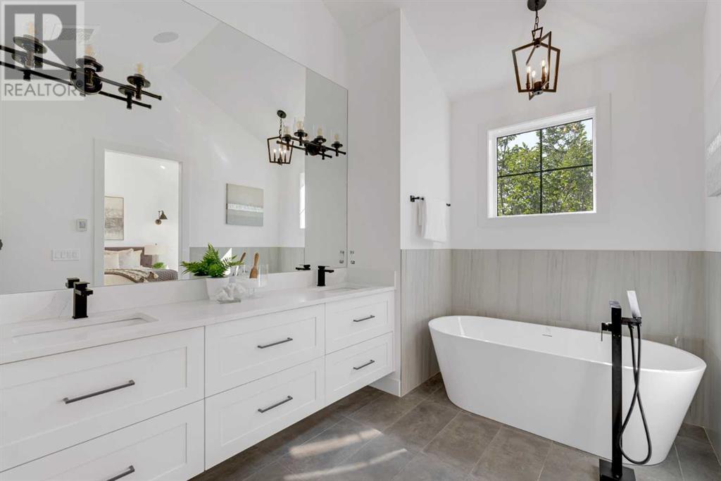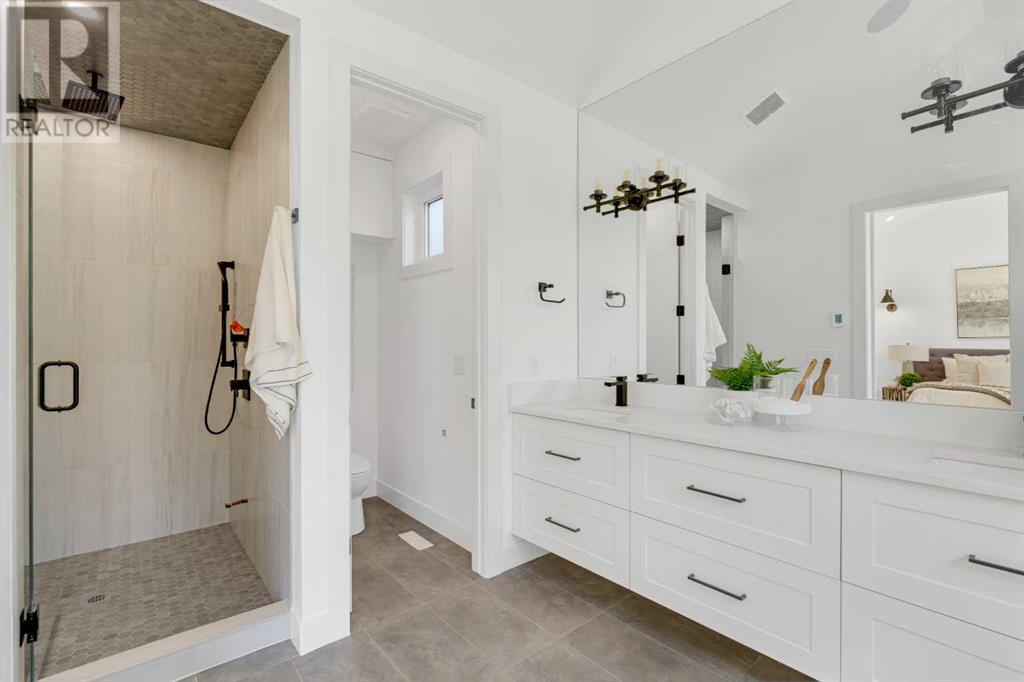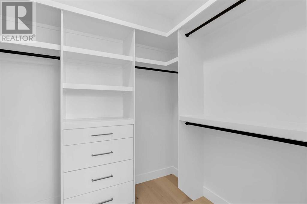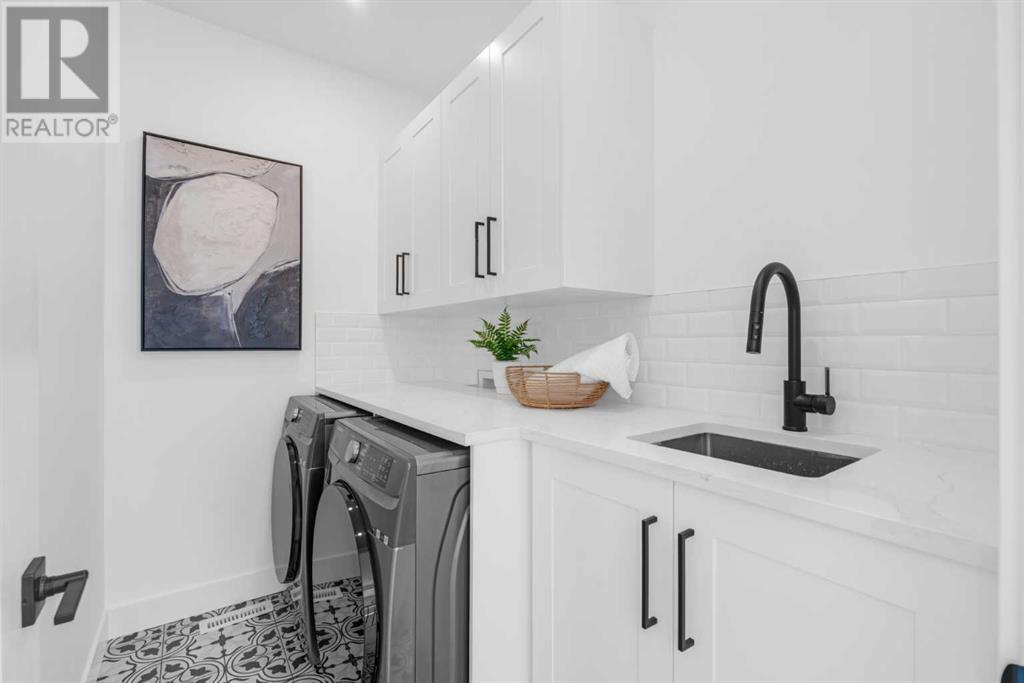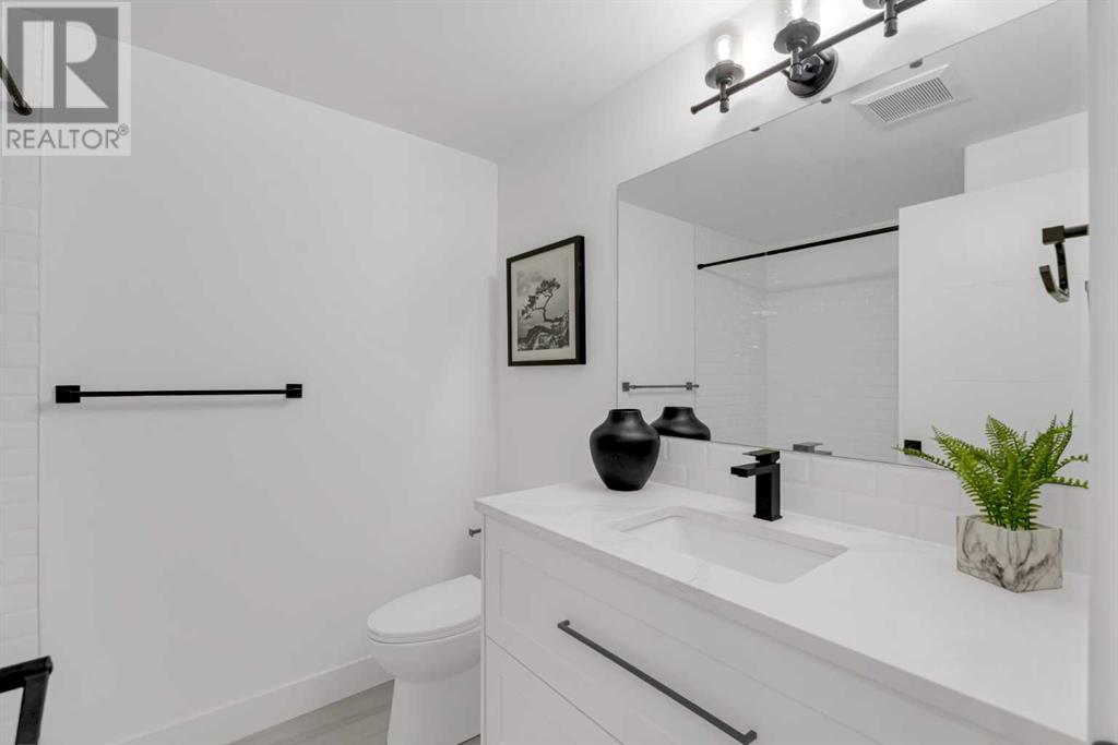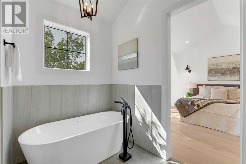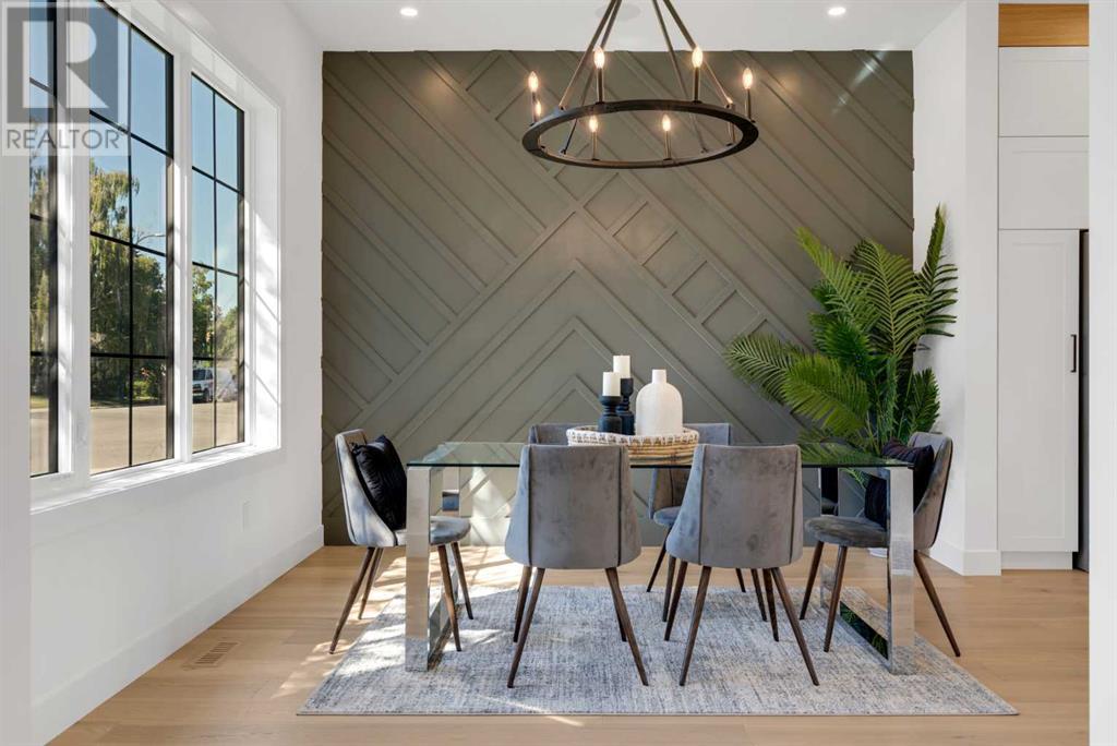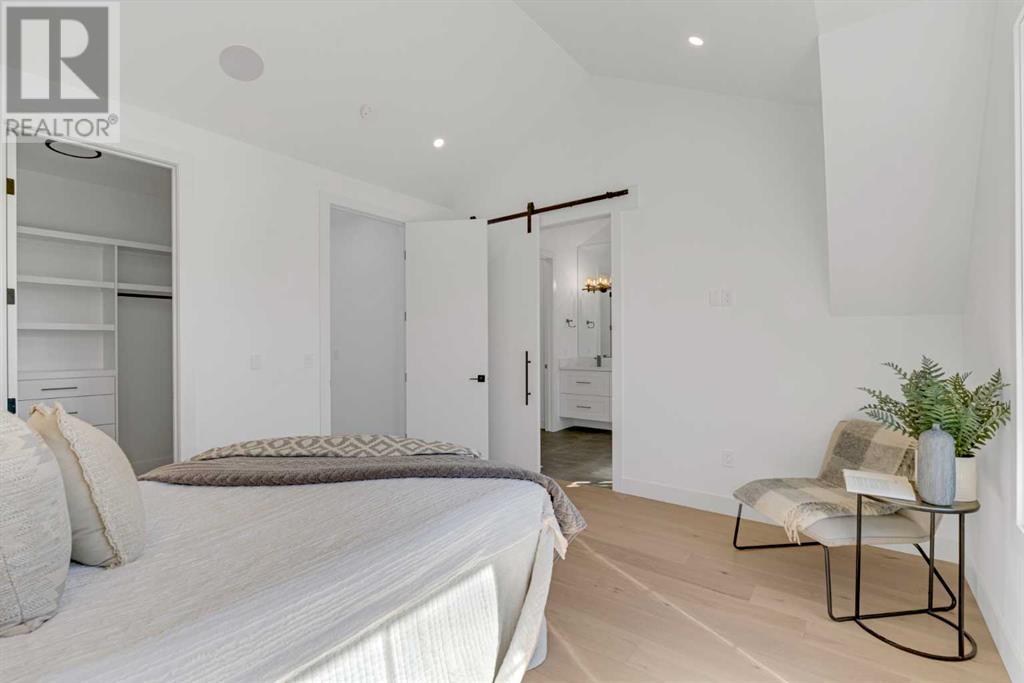 Ideally situated on a CORNER LOT in SHAGANAPPI is this MOVE-IN READY 2-storey semi-detached infill w/ 4 beds, 2,700+ square feet of living space, wide-plank engineered hardwood floors on all levels, a skylight, bonus room, vaulted ceilings, home gym, & designer lighting throughout! The community itself has endless activities & the best that inner-city living offers, including community rinks, nature walks, playgrounds, schools, & of course, the Shaganappi Point Golf Course. Shaganappi is one of the oldest communities in Calgary – it’s friendly, outdoorsy yet close to the city, & there’s always a lot going on! Back at home, step inside onto the tile flooring & notice the coat closet, perfect for organizing & keeping a tidy foyer, w/ direct access to the 2-pc powder room – privately tucked away from the main living area! Making your way into the main level, you’re welcomed into the formal dining room w/ large windows & a striking, modern feature wall highlighted by the designer chandelier above. Follow the wide plank-engineered hardwood floors into the kitchen, complete w/ an oversized island w/ quartz countertops, a wood display nook, upgraded stainless steel appliances, & timeless herringbone backsplash. A gas range offers an excellent cooking environment, while the extensive shaker-style cabinetry & pantry offer tons of storage space. A walkthrough rear mudroom w/ full-height lockers & built-in bench w/ hooks makes unloading kids & groceries highly convenient, & the large sunny living room enjoys an inset gas fireplace w/ full-height surround w/ built-ins on either side. Wood stairs w/ an open spindle railing lead upstairs into a sizeable vaulted bonus area w/ skylight & feature wall, a perfect area for a home office or study nook. The primary bedroom draws you in w/ vaulted ceilings & a large window. This little oasis has a large walk-in closet & a luxurious 5-piece ensuite equipped w/ a deep soaker tub, a dual vanity, quartz countertop, a fully tiled walk-in show er w/ a 10mm glass door, & a private water closet. Two other bedrooms on this floor have closets w/ custom built-in shelves & share the main bath w/ a dual vanity & private tub/shower combo w/ a full-height tile surround. A full laundry room is complete w/ a washer & dryer, a quartz folding counter, a tile backsplash, custom cabinetry, a hanging rod, & a laundry sink. Downstairs, the fully developed basement has everything your family needs for entertaining. A large rec room comes w/ an entertainment center featuring custom built-ins, ceiling speaker rough-ins, in-floor heat, & a full wet bar w/ quartz countertop, shaker cabinets, a tile backsplash, space for a beverage fridge, & a prep sink. A fourth bedroom offers room for guests, & there’s a dedicated home gym w/ sports flooring & wall mirror! A 4-pc bath completes the space, finished w/ quartz counters, an undermount sink, & a fully tiled walk-in shower. Don't wait! Come see your new modern home today! **VISIT MULTIMEDIA LINK FOR VIDEO WALKTHROUGH!** (id:22211)