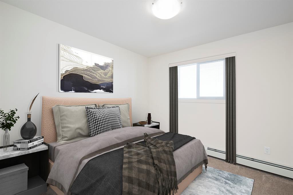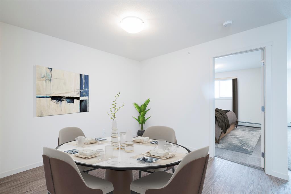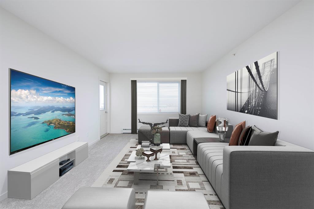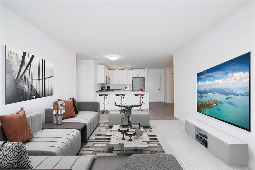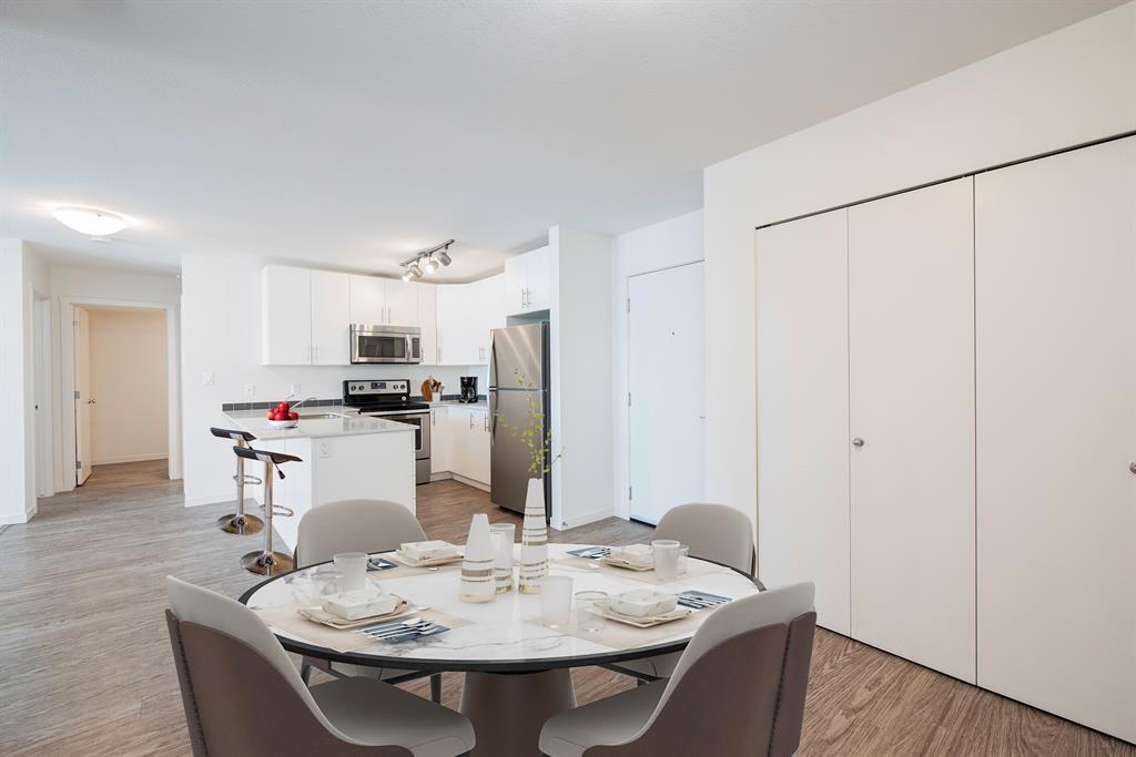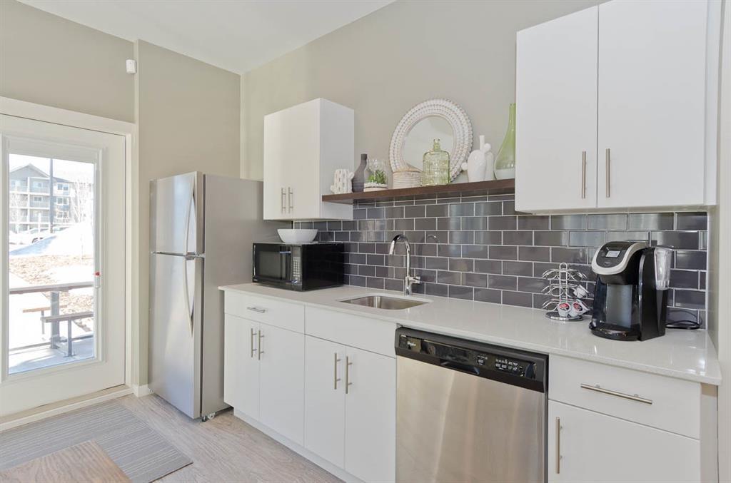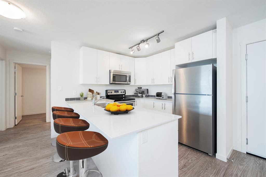 Welcome to McCall Landing! This beautiful second floor 2 bedroom condo is well appointed featuring quartz countertops, stainless steel appliances and vinyl plank flooring. The thoughtful layout is bright, modern and open. Plenty of natural light and a sunny East facing balcony. In-suite laundry and storage area sure to please! Underground TITLED parking spot too!! McCall Landing is an energy efficient building, which also features a fitness centre and recreation room. Enjoy close access to shopping, amenities and transit. Make Skyview Ranch home today! Listing photos are from a different yet similar unit. Layout and colour scheme are the same. (id:22211)