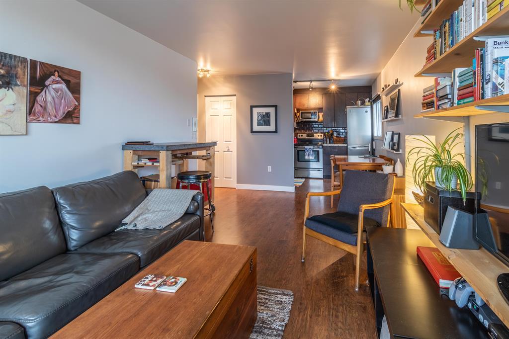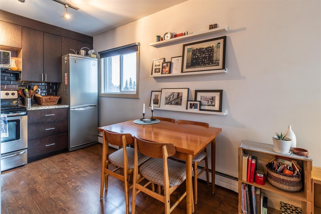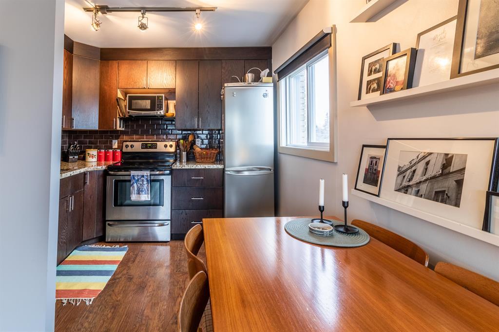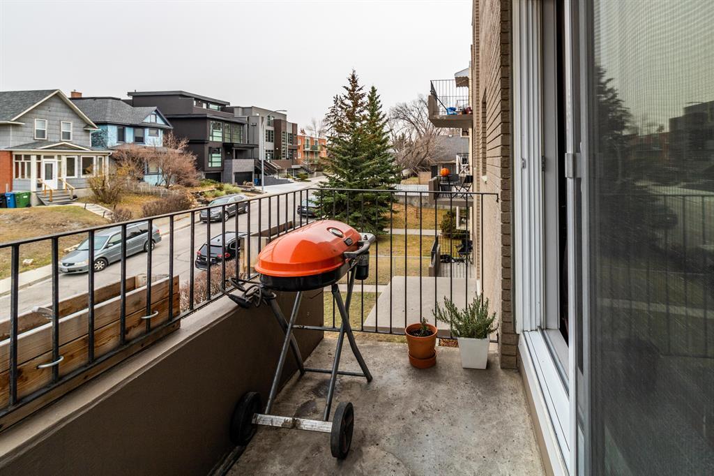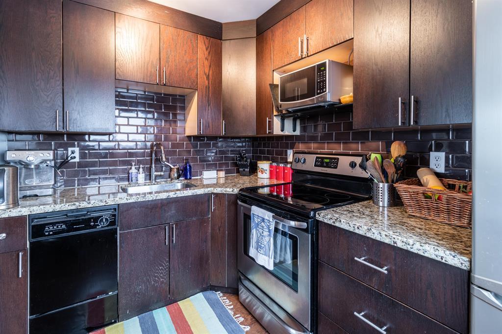 Here you'll find secure heated underground parking with a large secure storage locker with a Charming 3rd floor with downtown and north view condo in historic Bankview . Solid Concrete building with no post tension cables. It's welcoming and updated, this stylish condo offers an open living area with plenty of light and a large, covered balcony with space to entertain and enjoy the views. The functionally updated kitchen features granite counters, timeless subway tile backsplash, and a stainless-steel stove, microwave, dishwasher, and refrigerator. The bedroom is spacious with a large bright window and has ample closet space. The full bath showcases a modern raised-basin vanity and a deep soaker tub, + insuite laundry houses a single combo unit with storage shelving. Near the 17th Ave amenities of shops, pubs and restaurants, Easy access to transit w/ a short commute to downtown. Don't miss out on this great inner-city condo. Perfect for investors and first time home buyers. (id:22211)