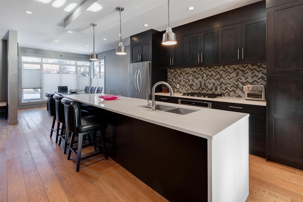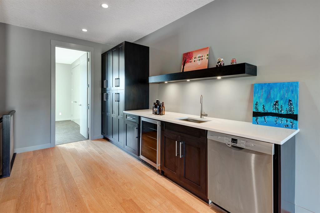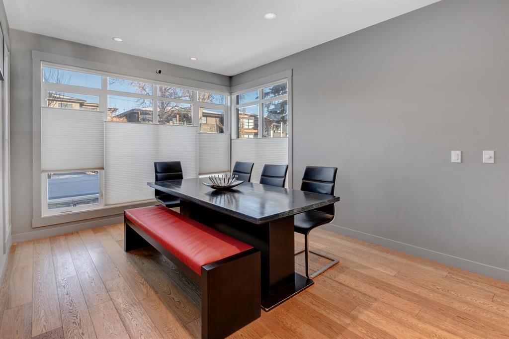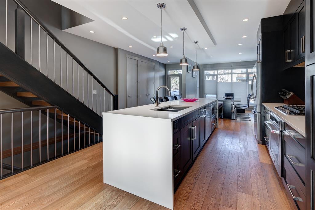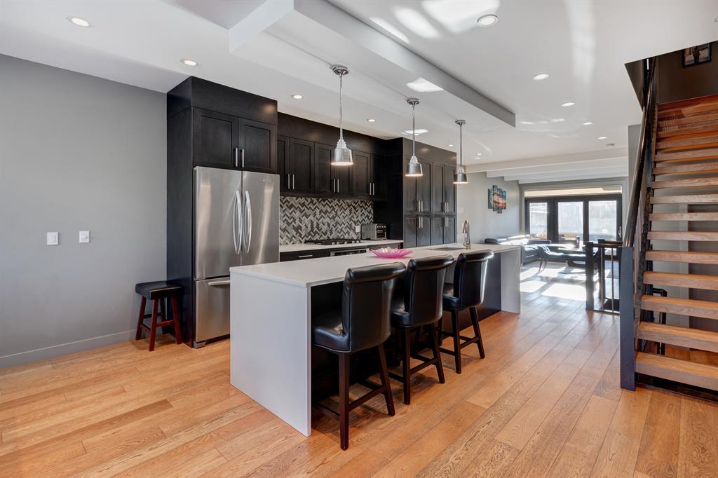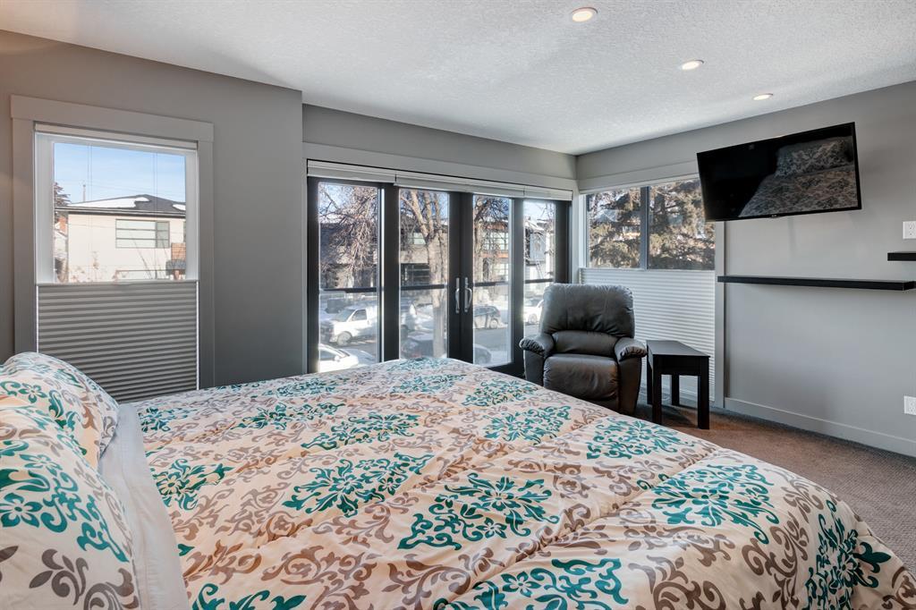 Welcome to this stunning detached Luxury Home in Hillhurst, where modern design meets meticulous craftsmanship. This impressive property boasts over 3,500 sq ft of developed living space, offering an exceptional lifestyle to the discerning buyer.Upon entering the home, you are greeted with an open concept main floor featuring 9' ceilings, BUILT-IN SPEAKERS, and wide plank hardwood floors. The formal dining room is perfect for entertaining guests, while the gourmet kitchen is a chef's dream with ample espresso maple cabinets, quartz countertops, and deluxe SS appliances such as a gas cooktop, oven, and built-in microwave.The bright and spacious living room is enhanced by a cozy fireplace, making it an ideal place to relax after a long day. A convenient 2pc bathroom completes the main floor.As you ascend the elegant hardwood staircase to the upper level, you will discover two generous bedrooms, each with their own ensuite, and a laundry room with extra storage. The Master Bedroom is a true sanctuary, offering large windows, a walk-in closet, and a luxurious 5pc ensuite with dual sinks, a free-standing soaker tub, and a separate shower with in-floor heat. The Romeo & Juliet doors open up to the outside, creating a serene and peaceful retreat.The third floor is a true showstopper, featuring a 3rd bedroom that is perfect for guests, a huge family room with a view of downtown from the outside balcony, and a wet bar with a fridge and dishwasher. A 3 piece full bathroom completes this level, making it the perfect space for entertaining friends and family.The fully finished basement is licensed for use as a bed and breakfast and offers an excellent opportunity for extra income as a B&B, Airbnb, home office, or cozy family space. This level includes a bedroom, a 3pc full bathroom with a tiled steam shower, a family/living room with a small kitchenette. The separate exterior entrance and soundproof ceiling make it an ideal space for privacy and comfort.This property is e quipped with solar panels, a central vacuum, and a garburator in the kitchen sink, offering convenience and efficiency. The double detached garage with a paved back alley has a built-in work table with shelves, providing ample storage and workspace.Conveniently located just minutes away from downtown, the river walk and bike path, trendy Kensington area, hospitals, schools, and parks, this property offers a truly exceptional lifestyle. (id:22211)