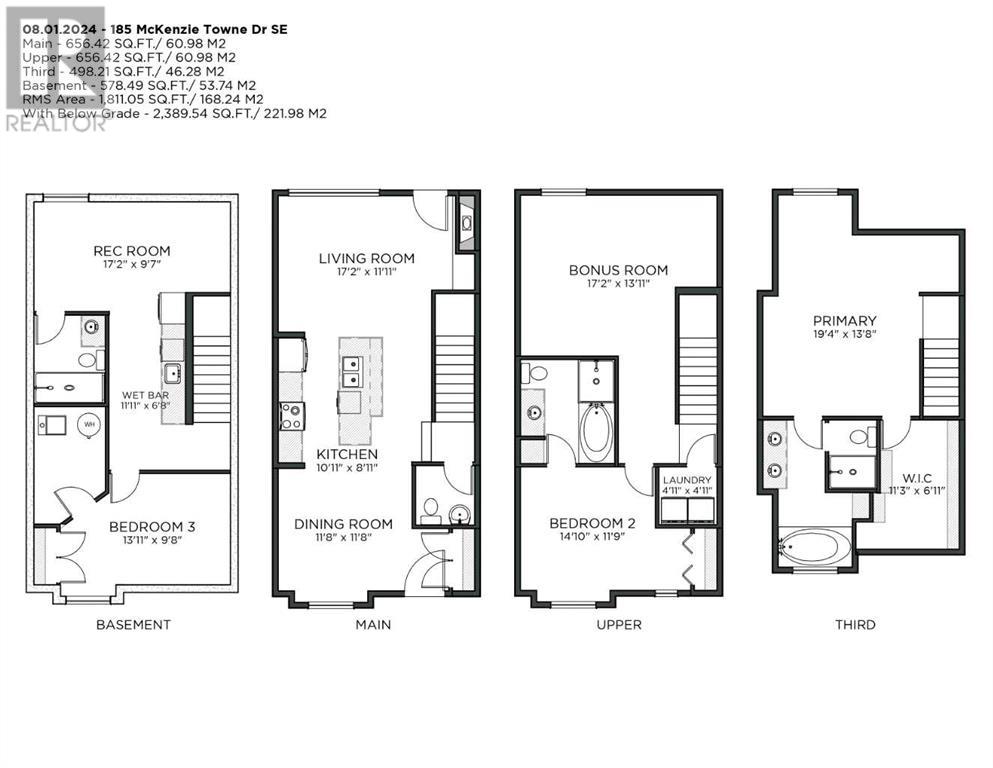 *** PRICE REDUCED $17,500 ***Welcome to this truly unique townhome - 3 STOREYS PLUS FULLY FINISHED BASEMENT! TOTAL OF 3 BEDROOMS AND 3 1/2 BATHROOMS! OVER 2,385 SQUARE FEET DEVELOPED! Main floor features a formal dining area, bright living room with a gas fireplace and a kitchen with large island and newer appliances. A 2 piece powder room and laundry room complete this level. On the second level is a large bedroom with a full ensuite and also a spacious bonus room. The third level with vaulted ceiling contains the private primary bedoom together with a full 5 piece ensuite. The developed (with permits) basement finished in 2018 cost $35,0000 and has bedroom # 3 and a full bathroom - with in floor heating - together with a dining area with a refrigerator and wet bar - ideal for teenagers! The immaculate parklike backyard contain as gazebo (included) and there is an insulated , heated double detached garage with 220 wiring. Garage has extra storage upstairs. Located in McKenzie Towne with its abundant paths and ponds as well as Sobeys and several fine restaurants and shoppes! There is so much living space in this fine home - book your viewing today! (id:22211)