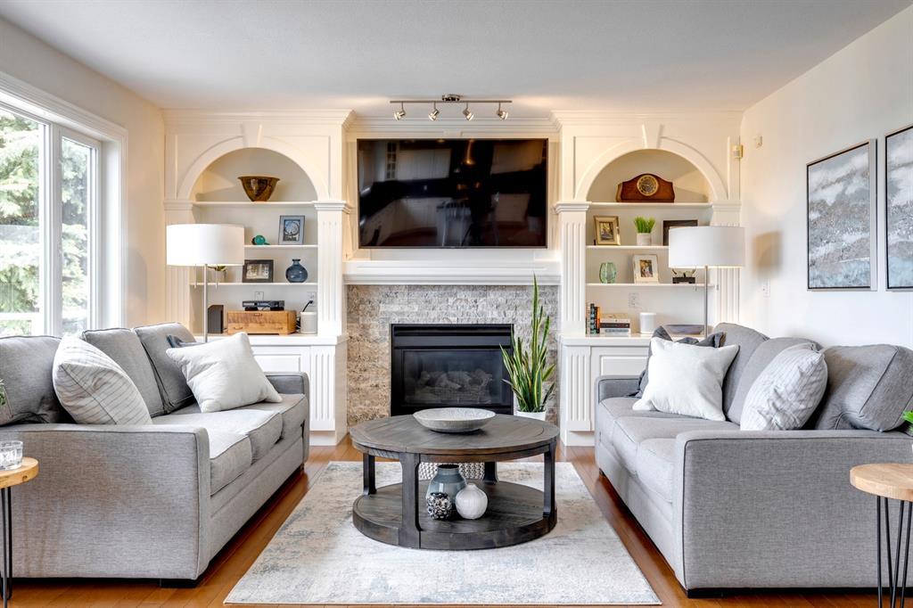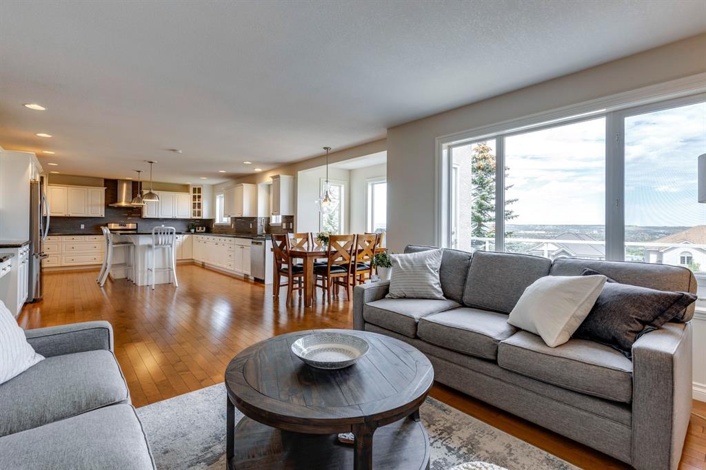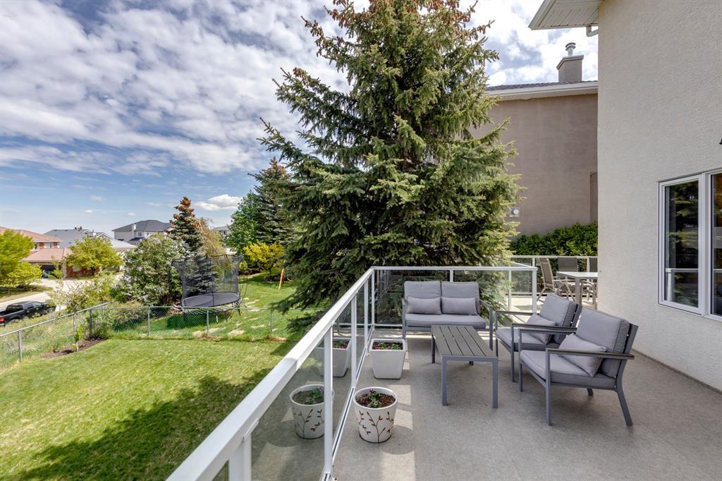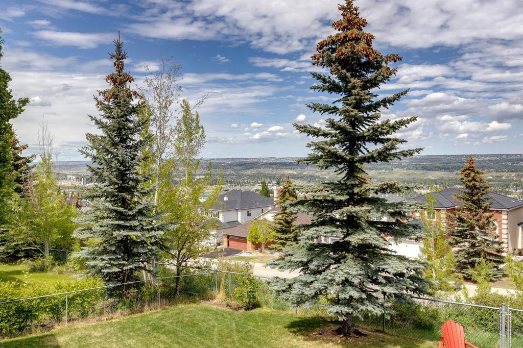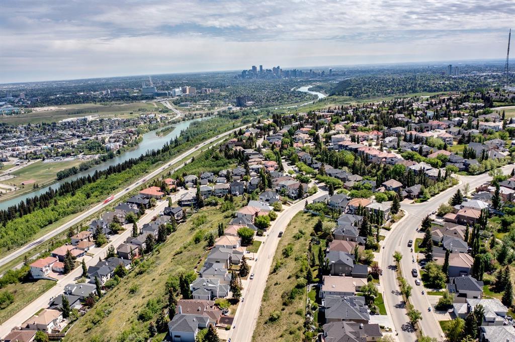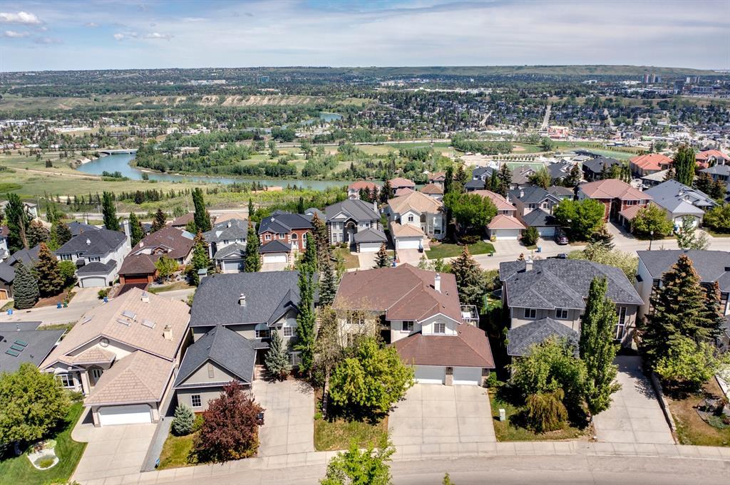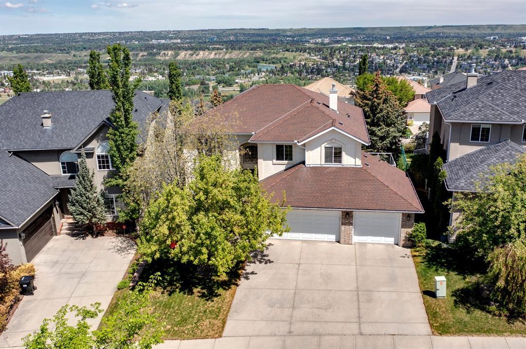 Spectacular views, a large yard backing a natural green space, recent updates and a fantastic floor plan make this home an excellent choice for a growing family. A formal sitting area greets you from the impressive double height foyer. To the left is a quiet office, ideal for studying or working from home. The classic black and white kitchen offers lots of storage, stainless appliances, glass display cabinets, a wine rack, a baking counter and a breakfast bar for casual meals on the go. Serve family dinners in the sunny dining area overlooking the beautiful Bow River valley. The cozy family room is complemented by a fireplace framed by shelving making this a comfortable space to unwind. An elegant, curved staircase leads you up to the primary suite, where the views from the sitting area are even more breathtaking and the tastefully renovated ensuite beckons you at the end of the day. Three additional bedrooms and a bathroom are perfectly sized for the kids. Downstairs, the fully developed basement has a large recreation room with a wet bar, a second fireplace and access out to a covered patio. Imagine hosting friends and family in this area designed with entertaining and fun in mind. The basement bedroom could easily be used for guests or as a gym. One of the highlights of this property is all the outdoor living spaces, including a large wrap around deck with multiple seating areas, the yard with its mature trees, the nearby walking paths and green space that is accessible from the back gate. This home is an amazing option for a family that needs room for everyone to have space to call their own. (id:22211)