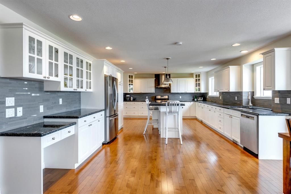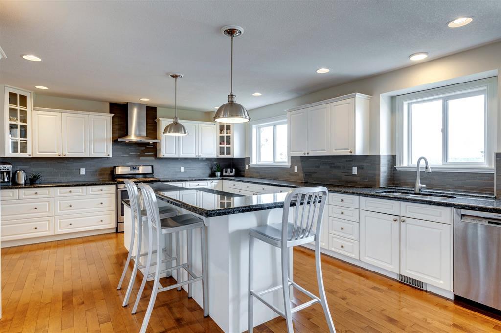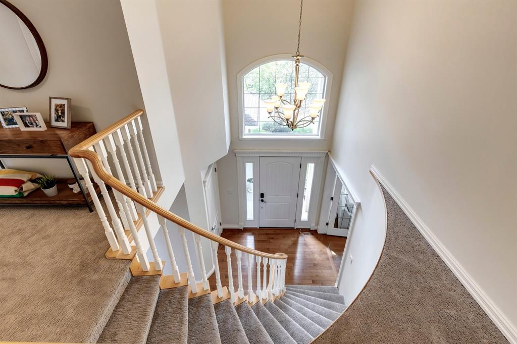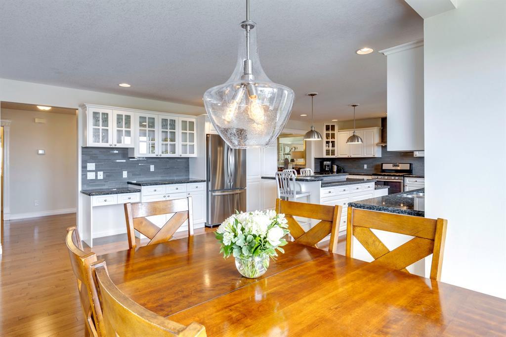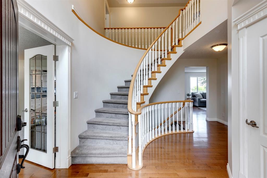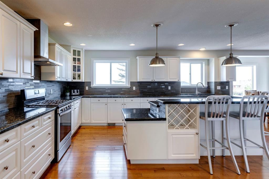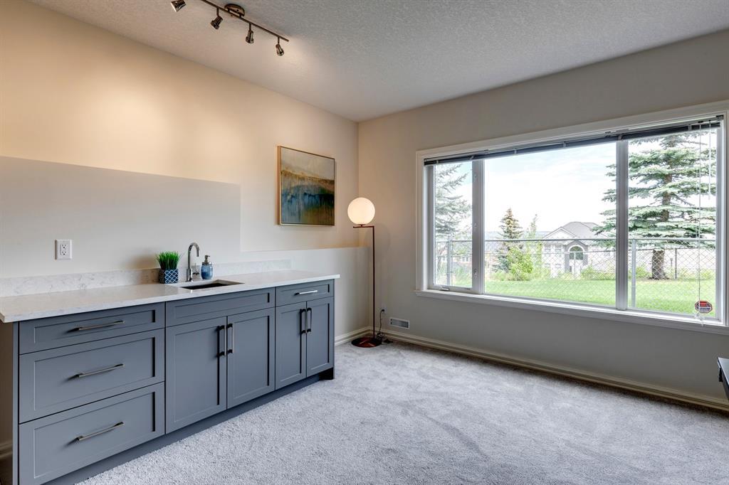 Spectacular views, a large yard backing a natural green space, recent updates and a fantastic floor plan make this home an excellent choice for a growing family. A formal sitting area greets you from the impressive double height foyer. To the left is a quiet office, ideal for studying or working from home. The classic black and white kitchen offers lots of storage, stainless appliances, glass display cabinets, a wine rack, a baking counter and a breakfast bar for casual meals on the go. Serve family dinners in the sunny dining area overlooking the beautiful Bow River valley. The cozy family room is complemented by a fireplace framed by shelving making this a comfortable space to unwind. An elegant, curved staircase leads you up to the primary suite, where the views from the sitting area are even more breathtaking and the tastefully renovated ensuite beckons you at the end of the day. Three additional bedrooms and a bathroom are perfectly sized for the kids. Downstairs, the fully developed basement has a large recreation room with a wet bar, a second fireplace and access out to a covered patio. Imagine hosting friends and family in this area designed with entertaining and fun in mind. The basement bedroom could easily be used for guests or as a gym. One of the highlights of this property is all the outdoor living spaces, including a large wrap around deck with multiple seating areas, the yard with its mature trees, the nearby walking paths and green space that is accessible from the back gate. This home is an amazing option for a family that needs room for everyone to have space to call their own. (id:22211)