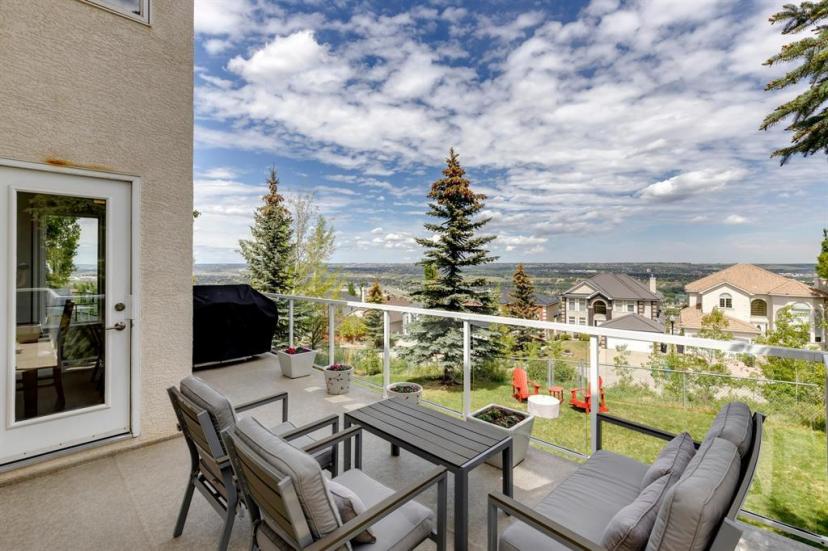 Spectacular views, a large yard backing a natural green space, recent updates and a fantastic floor plan make this home an excellent choice for a growing family. A formal sitting area greets you from the impressive double height foyer. To the left is a quiet office, ideal for studying or working from home. The classic black and white kitchen offers lots of storage, stainless appliances, glass display cabinets, a wine rack, a baking counter and a breakfast bar for casual meals on the go. Serve family dinners in the sunny dining area overlooking the beautiful Bow River valley. The cozy family room is complemented by a fireplace framed by shelving making this a comfortable space to unwind. An elegant, curved staircase leads you up to the primary suite, where the views from the sitting area are even more breathtaking and the tastefully renovated ensuite beckons you at the end of the day. Three additional bedrooms and a bathroom are perfectly sized for the kids. Downstairs, the fully developed basement has a large recreation room with a wet bar, a second fireplace and access out to a covered patio. Imagine hosting friends and family in this area designed with entertaining and fun in mind. The basement bedroom could easily be used for guests or as a gym. One of the highlights of this property is all the outdoor living spaces, including a large wrap around deck with multiple seating areas, the yard with its mature trees, the nearby walking paths and green space that is accessible from the back gate. This home is an amazing option for a family that needs room for everyone to have space to call their own. (id:22211)