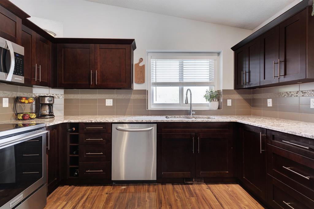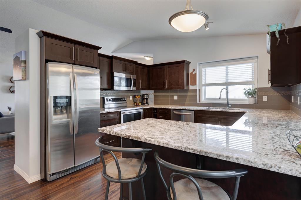 Welcome to Millrise where you’ll find this gorgeously updated 4 level split! With 4 bedrooms, large office, three family/living areas, 3 full bathrooms and DOUBLE DETACHED GARAGE, this home has been lovingly maintained. Walk inside to find laminate flooring, a neutral paint palette, VAULTED CEILINGS and a list of major updates! From the NEW SIDING 2022, new ROOF 2021, both the FURNACE and HWT 2019, stove 2021 and blown in insulation in the attic in 2022! The poly-b was replaced with PEX in 2018 and the exterior landscaping has been updated. The main floor living room is perfectly situated to host guests, with a large dining room and located a short walk to the updated kitchen! With STAINLESS appliances, GRANITE counters, ISLAND and room to make, bake and store and AIR CONDITIONING for those warm summer days. Upstairs you’ll find the PRIMARY SUITE with his and her closets and full 4 piece ENSUITE. Two additional bedrooms and full bath can be found here. Step down to the third level to find a massive FAMILY ROOM with gorgeously painted brick, wood burning fireplace. A 4th bedroom and 3 piece bath/laundry room can also be found here. The lowest level hosts the perfect rec room for family movie nights and a large office! Walk outside to your WEST FACING yard to find a large wood patio, gazebo and plenty of room for fun and games. The double detached garage backs onto a back alley which means parking in the front or back is possible. Located in the family friendly community of Millrise, you are a short walk to SHOPPING, transit and LRT, schools, parks and nearby Fish Creek Park. Welcome Home! (id:22211)
