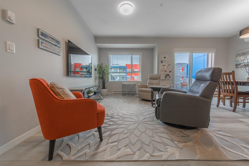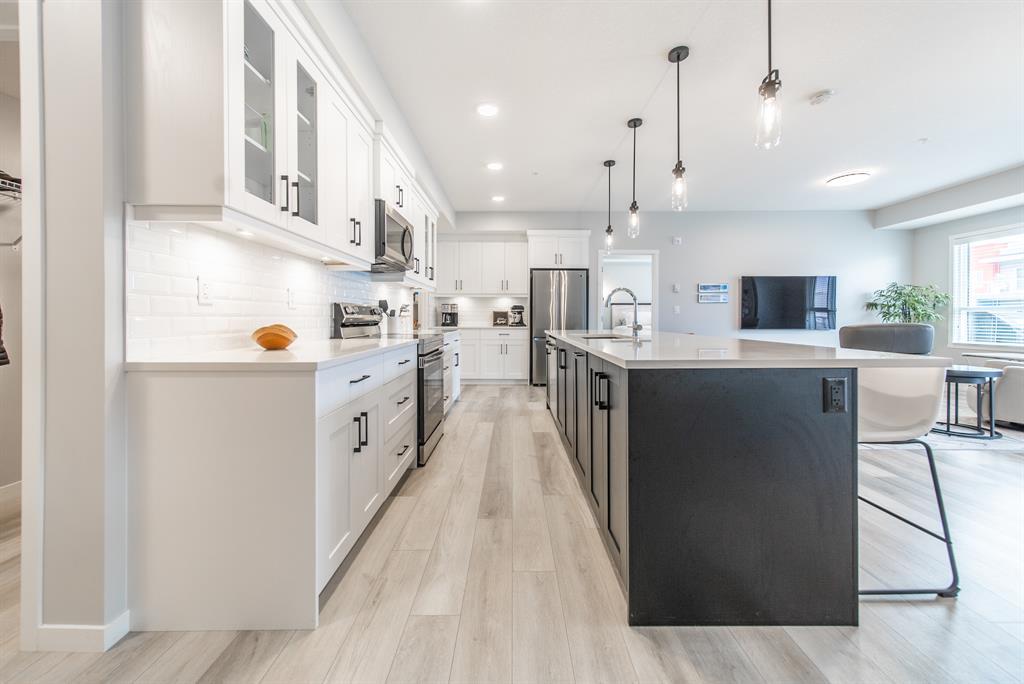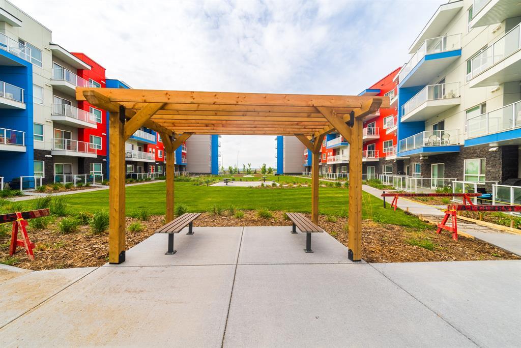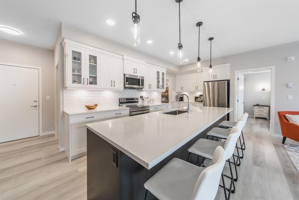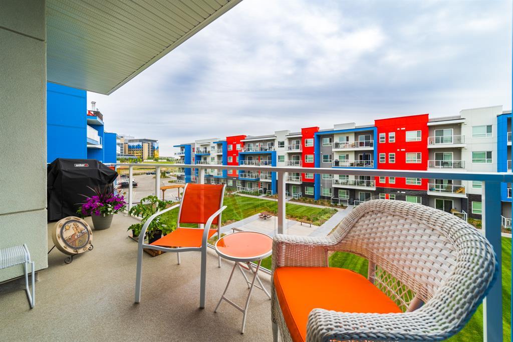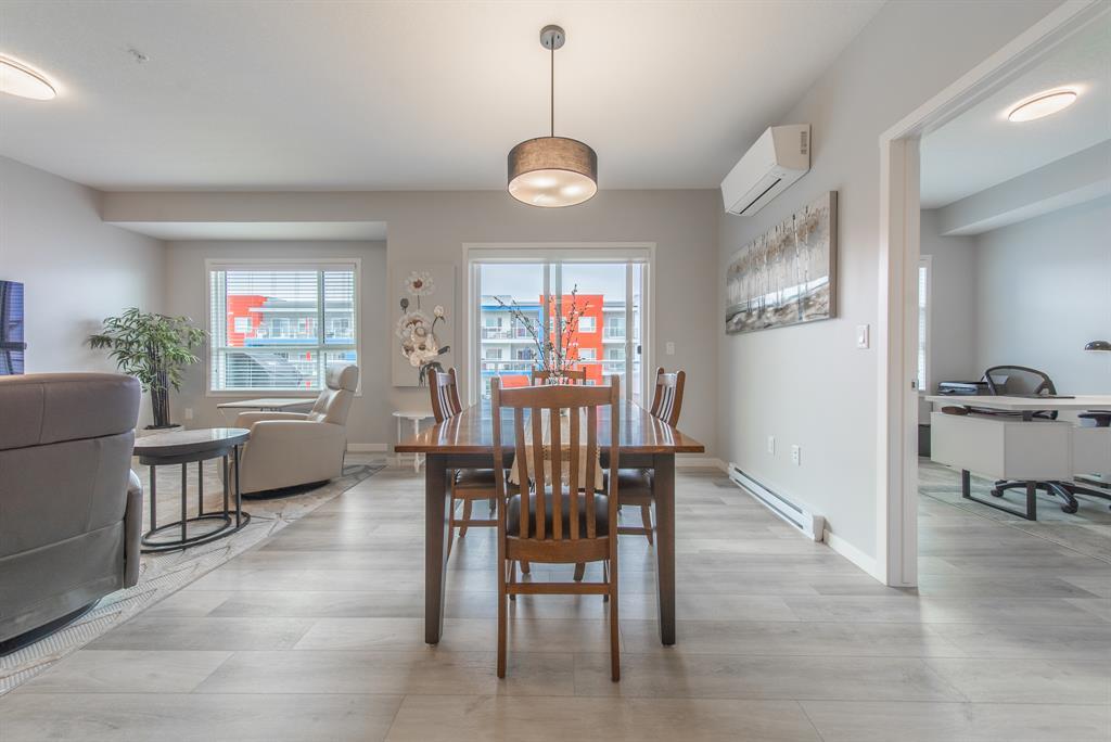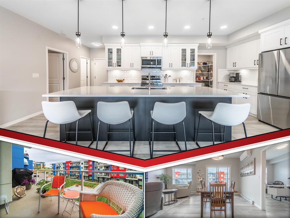 Welcome to the ultimate standard of modern urban living in Seton. This luxurious two-bedroom, two-bath home plus den (3rd bedroom) exudes quality and sophistication. The gorgeous colour palette creates timeless décor. Drenched in natural light this turn-key unit boasts a fantastic open concept floor plan designed for family gatherings and entertaining. The living space is clearly defined and flows effortlessly from kitchen, to dining to living room. The kitchen is the focal point of the main living space with endless counters and cupboards. Two tone full height cabinetry, classic quartz counter tops, sleek and simple subway backsplash, stainless steel appliances, massive island and a generous pantry. Dining can be expanded to accommodate larger gatherings for dinner. The dining area leads to the huge deck facing the lovely courtyard and community gardens. Very functional living room makes it easy to arrange furniture. The upgraded master bedroom boasts a lavish ensuite with dual sinks, quartz counters, a spacious shower and walk-in closet. The den has lots of flexibility. Office space, home gym or even a little bedroom as it has a nice large window. Convenience is key with a full-size laundry room providing additional storage space. The 4-piece main bath completes this unit. This home also offers the luxury of double underground titled parking, a wall unit air conditioner that doubles as a heater with remote, and stunning luxury vinyl plank flooring throughout. The South Calgary Hospital is a 2-minute walk and the YMCA is within walking distance as well. Enjoy the vibrant location and all the exceptional amenities Seton has to offer including shopping, dining, off-leash dog park (dogs permitted up to 50lbs with board approval), a skate park, future LRT Green Line, Movie Theatre and more! Indulge in a lifestyle of comfort and elegance. Your urban retreat awaits! (id:22211)