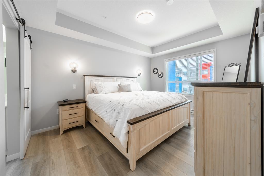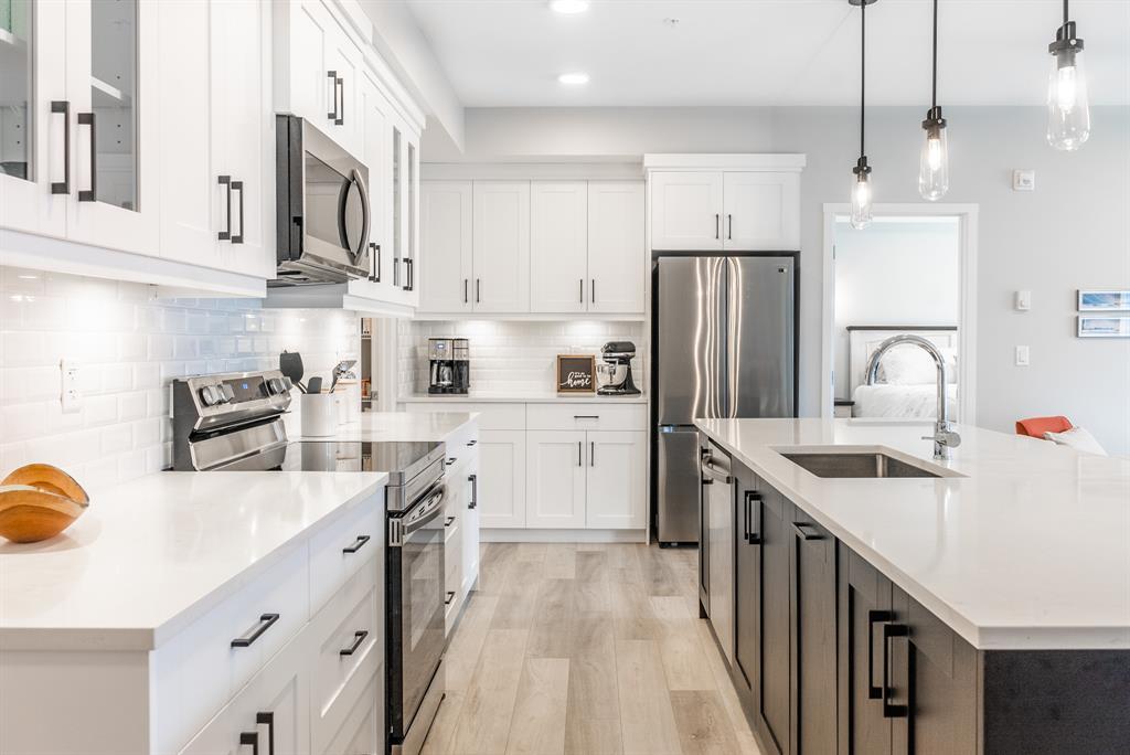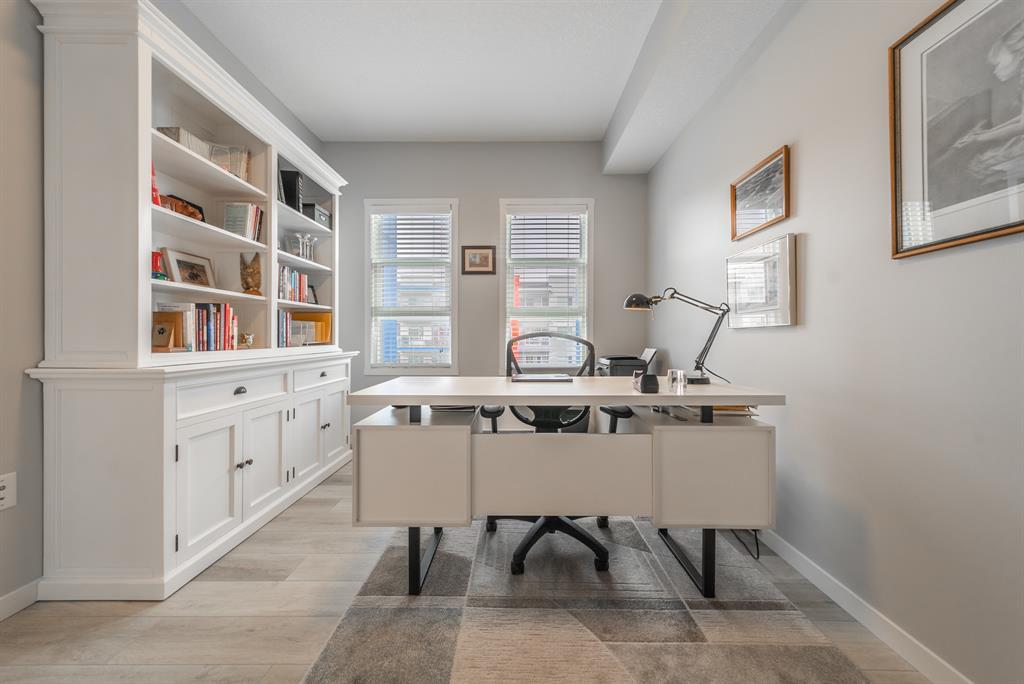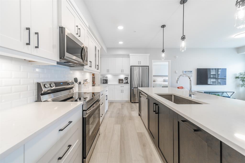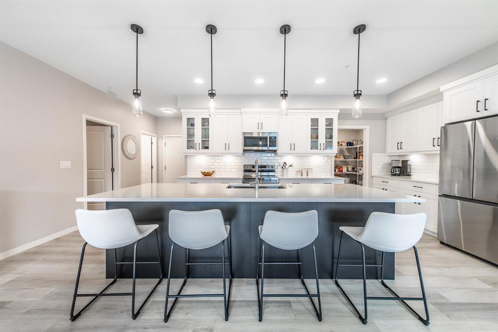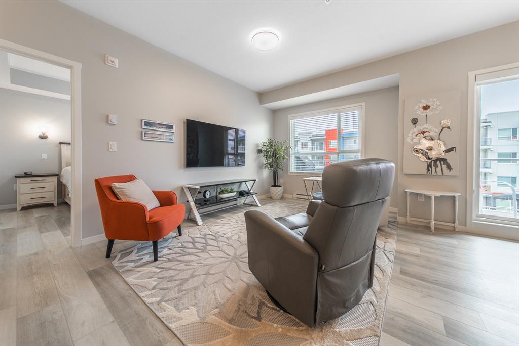 Welcome to the ultimate standard of modern urban living in Seton. This luxurious two-bedroom, two-bath home plus den (3rd bedroom) exudes quality and sophistication. The gorgeous colour palette creates timeless décor. Drenched in natural light this turn-key unit boasts a fantastic open concept floor plan designed for family gatherings and entertaining. The living space is clearly defined and flows effortlessly from kitchen, to dining to living room. The kitchen is the focal point of the main living space with endless counters and cupboards. Two tone full height cabinetry, classic quartz counter tops, sleek and simple subway backsplash, stainless steel appliances, massive island and a generous pantry. Dining can be expanded to accommodate larger gatherings for dinner. The dining area leads to the huge deck facing the lovely courtyard and community gardens. Very functional living room makes it easy to arrange furniture. The upgraded master bedroom boasts a lavish ensuite with dual sinks, quartz counters, a spacious shower and walk-in closet. The den has lots of flexibility. Office space, home gym or even a little bedroom as it has a nice large window. Convenience is key with a full-size laundry room providing additional storage space. The 4-piece main bath completes this unit. This home also offers the luxury of double underground titled parking, a wall unit air conditioner that doubles as a heater with remote, and stunning luxury vinyl plank flooring throughout. The South Calgary Hospital is a 2-minute walk and the YMCA is within walking distance as well. Enjoy the vibrant location and all the exceptional amenities Seton has to offer including shopping, dining, off-leash dog park (dogs permitted up to 50lbs with board approval), a skate park, future LRT Green Line, Movie Theatre and more! Indulge in a lifestyle of comfort and elegance. Your urban retreat awaits! (id:22211)
